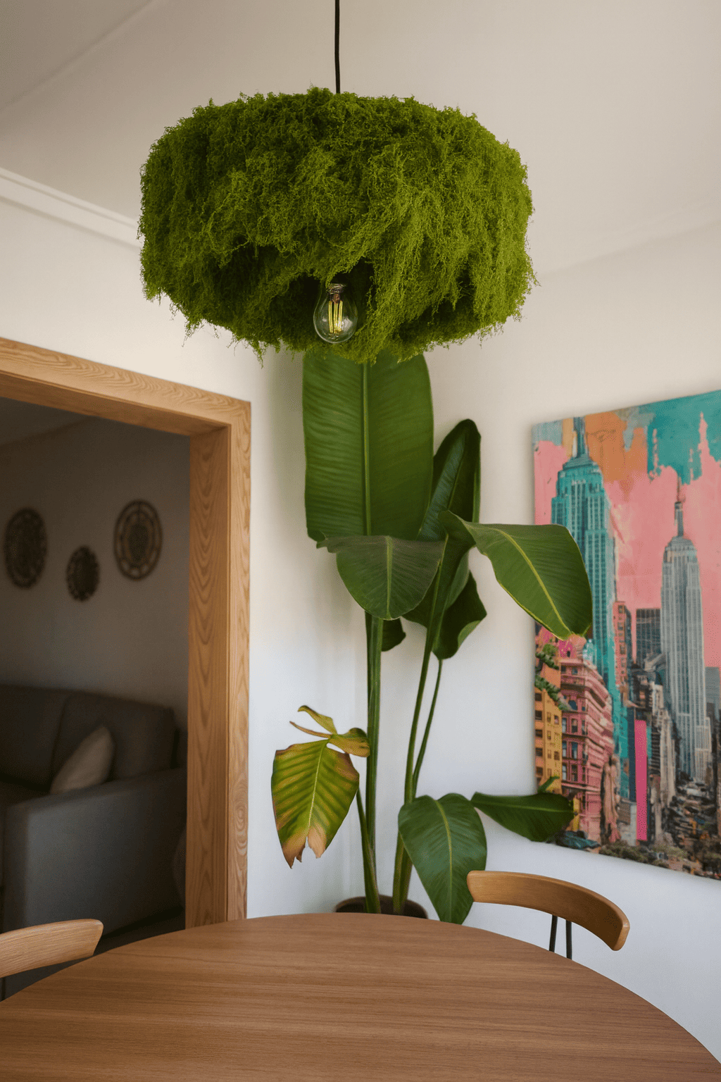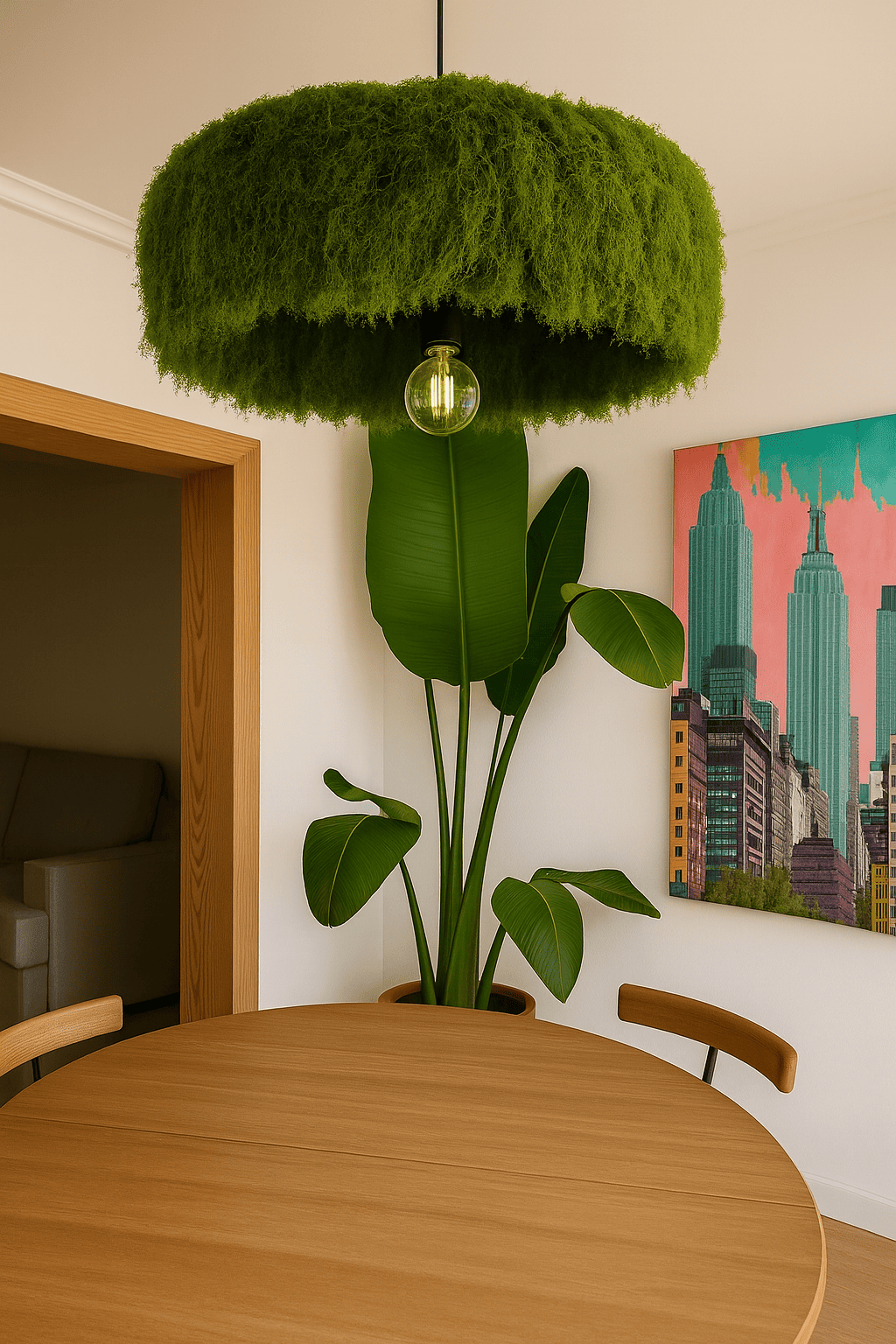 Its circular silhouette, both simple and striking, elevates the piece beyond conventional lighting, turning it into a sculptural centerpiece. Crafted with natural materials such as wood and moss, it embodies a sense of calm, serenity, and connection to the environment. The clean lines, hidden wiring, and minimalist detailing highlight the purity of its design, making it adaptable to a wide range of interiors.