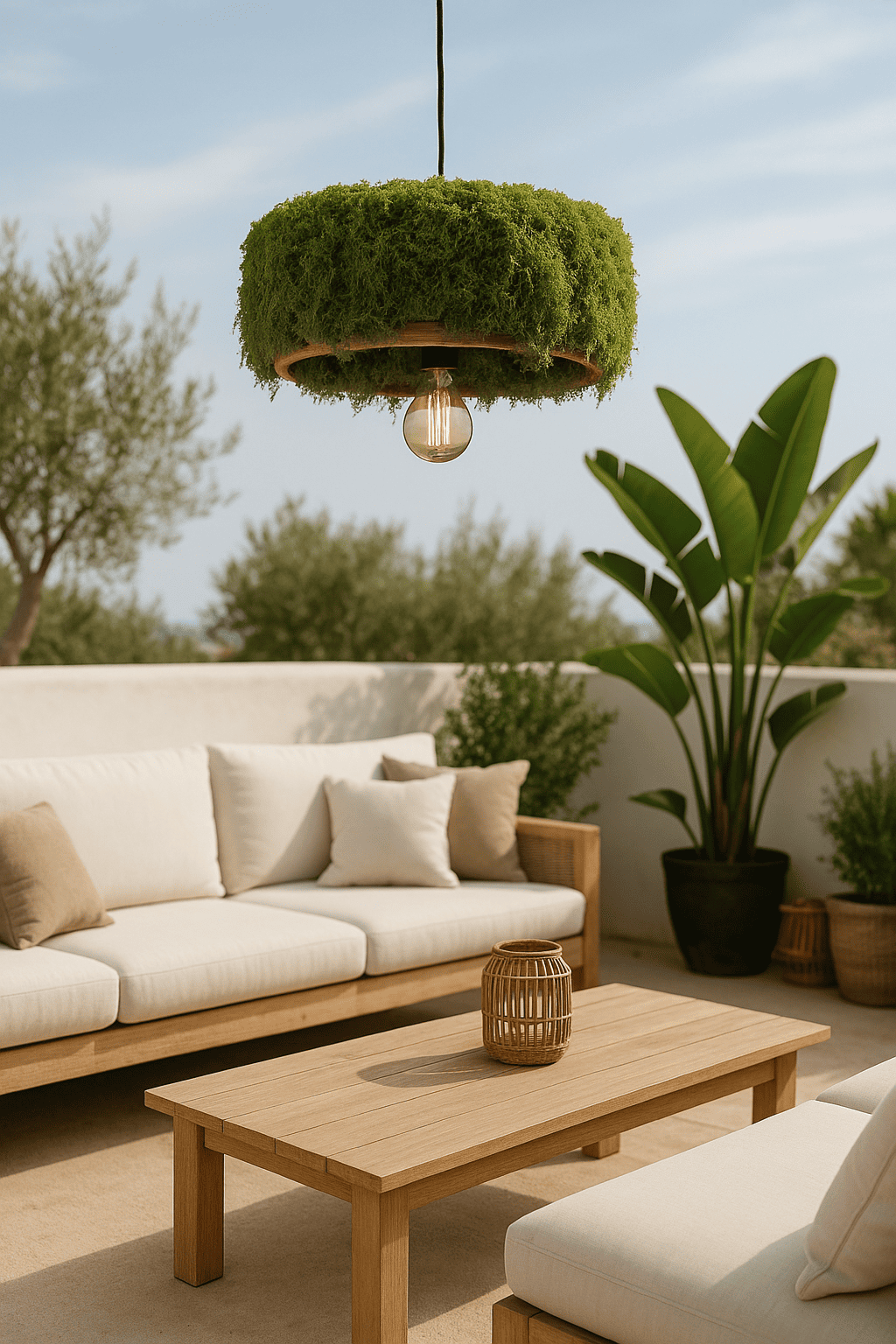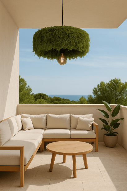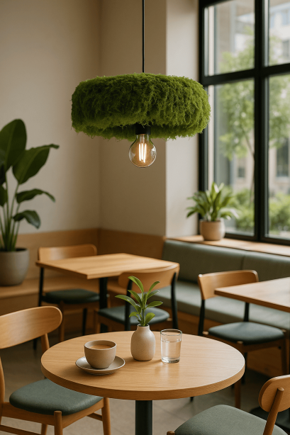 Versatile in use, it can be displayed as a single statement above a dining table, arranged in groups to enrich cafés, restaurants, or hotel lobbies, or placed in sheltered outdoor spaces where it harmonizes with Mediterranean landscapes. Each lamp is subtly unique due to the artisanal application of moss, ensuring exclusivity and individuality.
