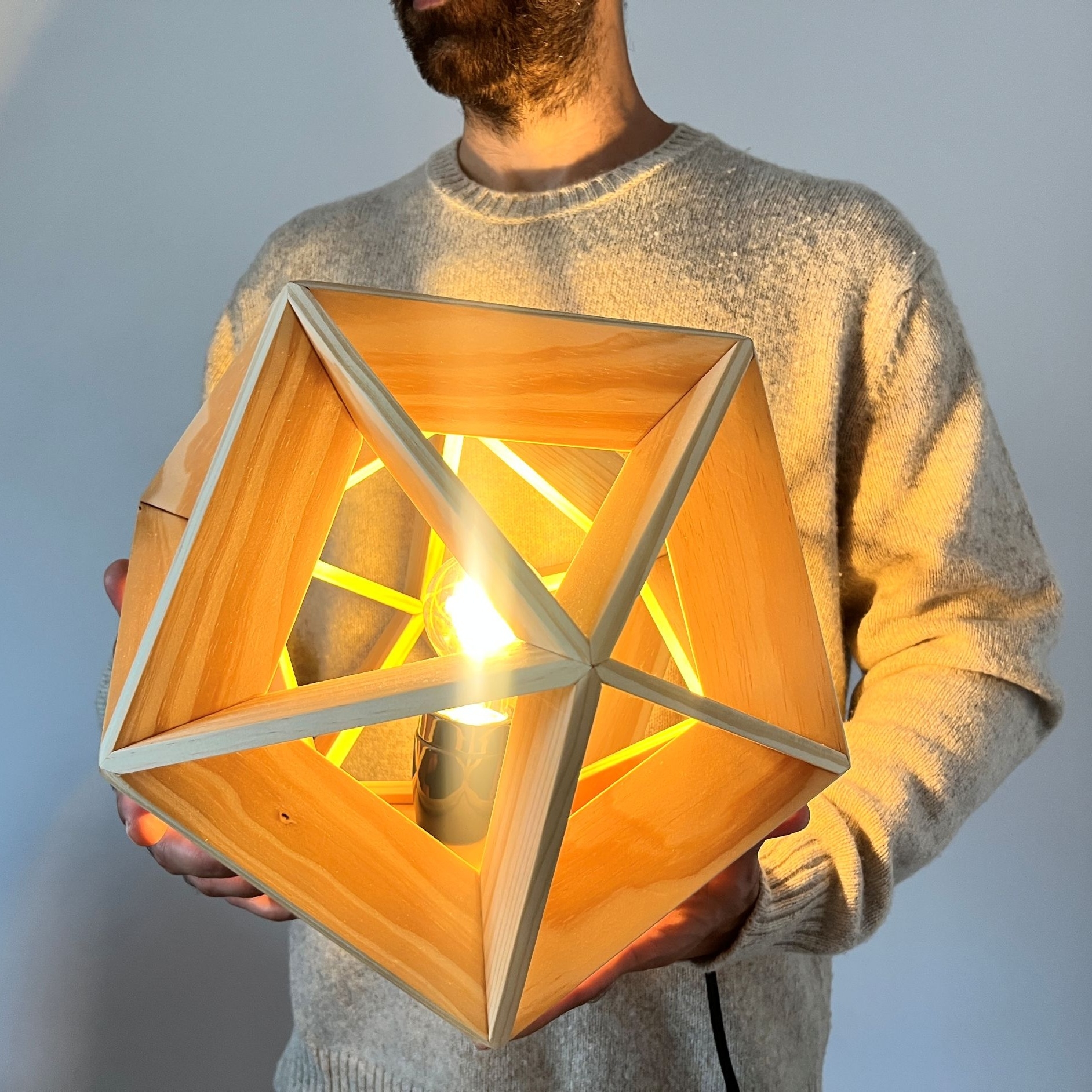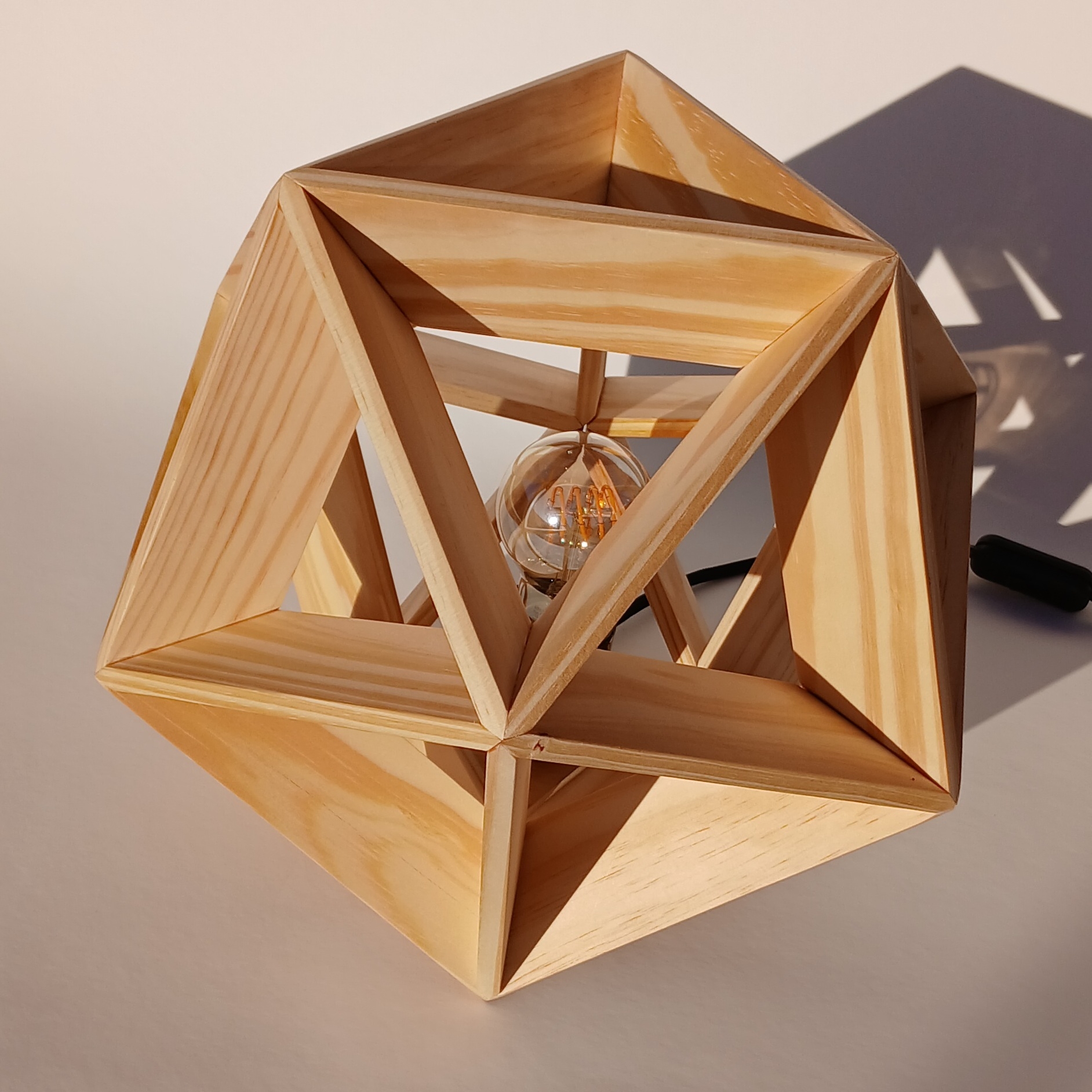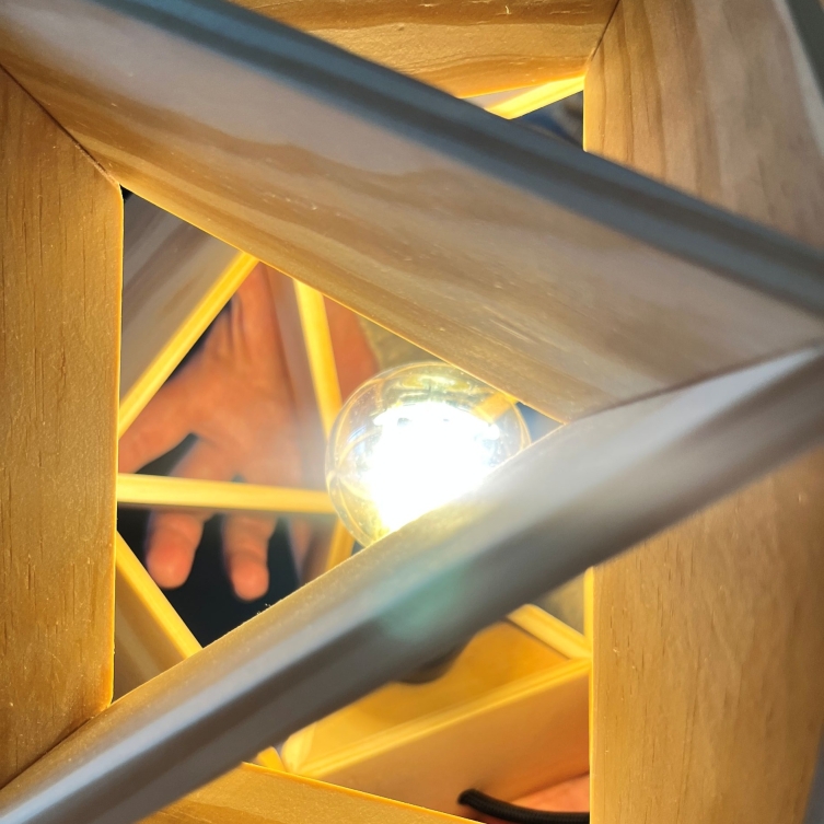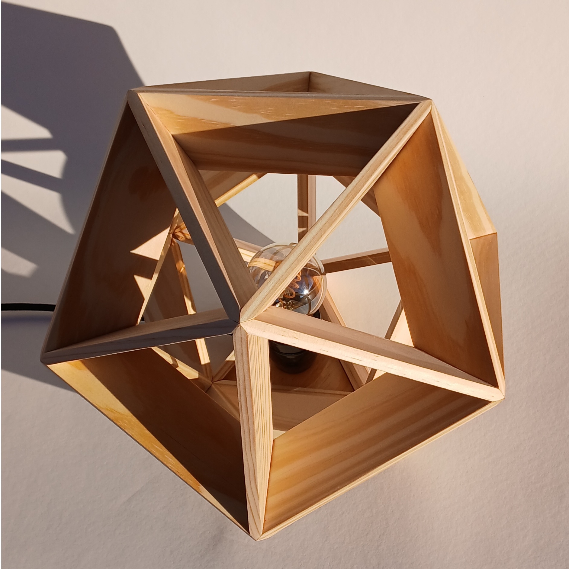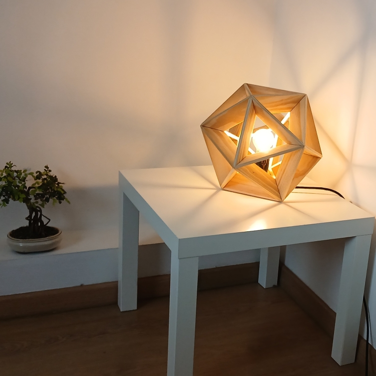 Entry DescriptionThis lamp has the form of an icosahedron, a regular solid with twenty identical faces. In this case, the edges of the geometry are used to create a frame that embraces and showcases a soft vintage lightbulb. The wooden edges are flat, giving the lamp a strong yet elegant structure that also allows the light to spread. About 85.3% of the light passes directly through the wooden frame into the environment, while the rest is reflected and diffused indirectly.