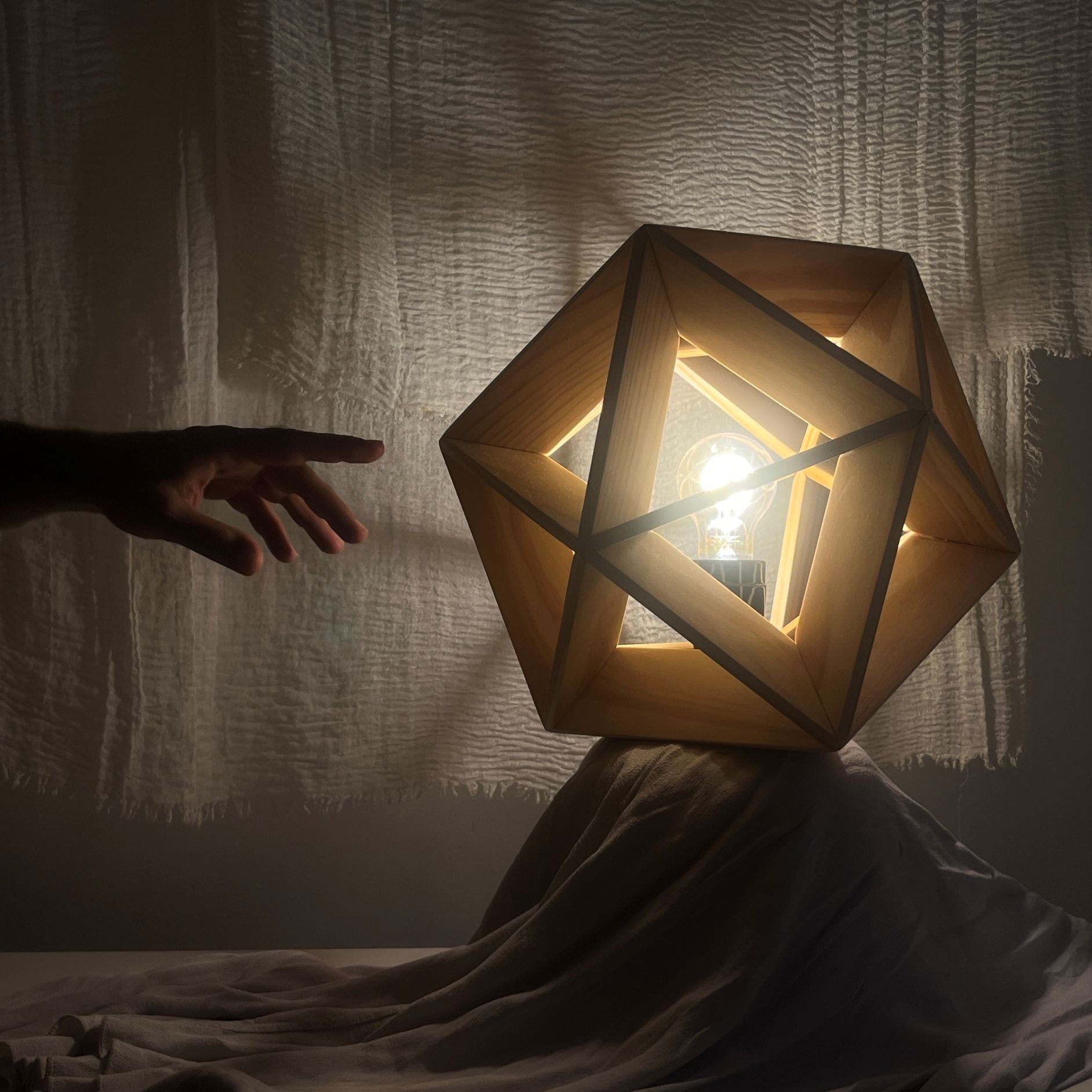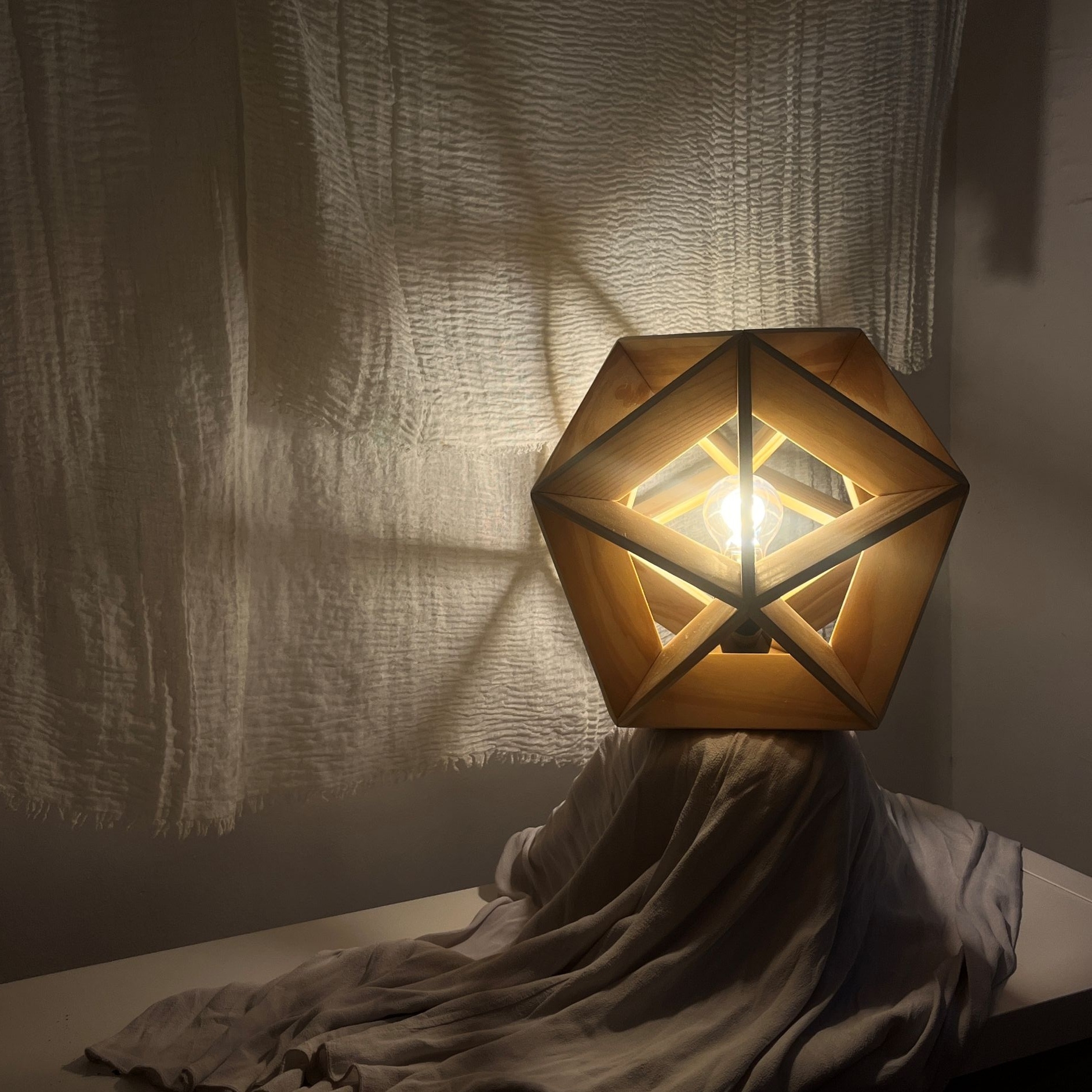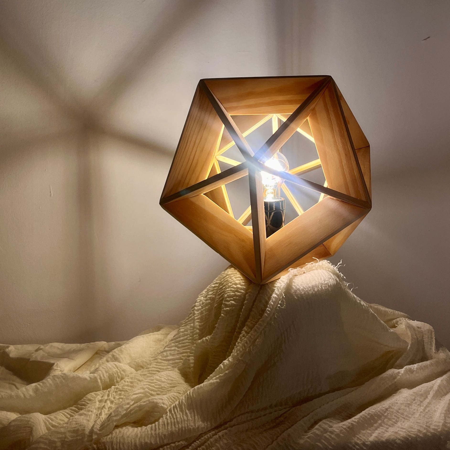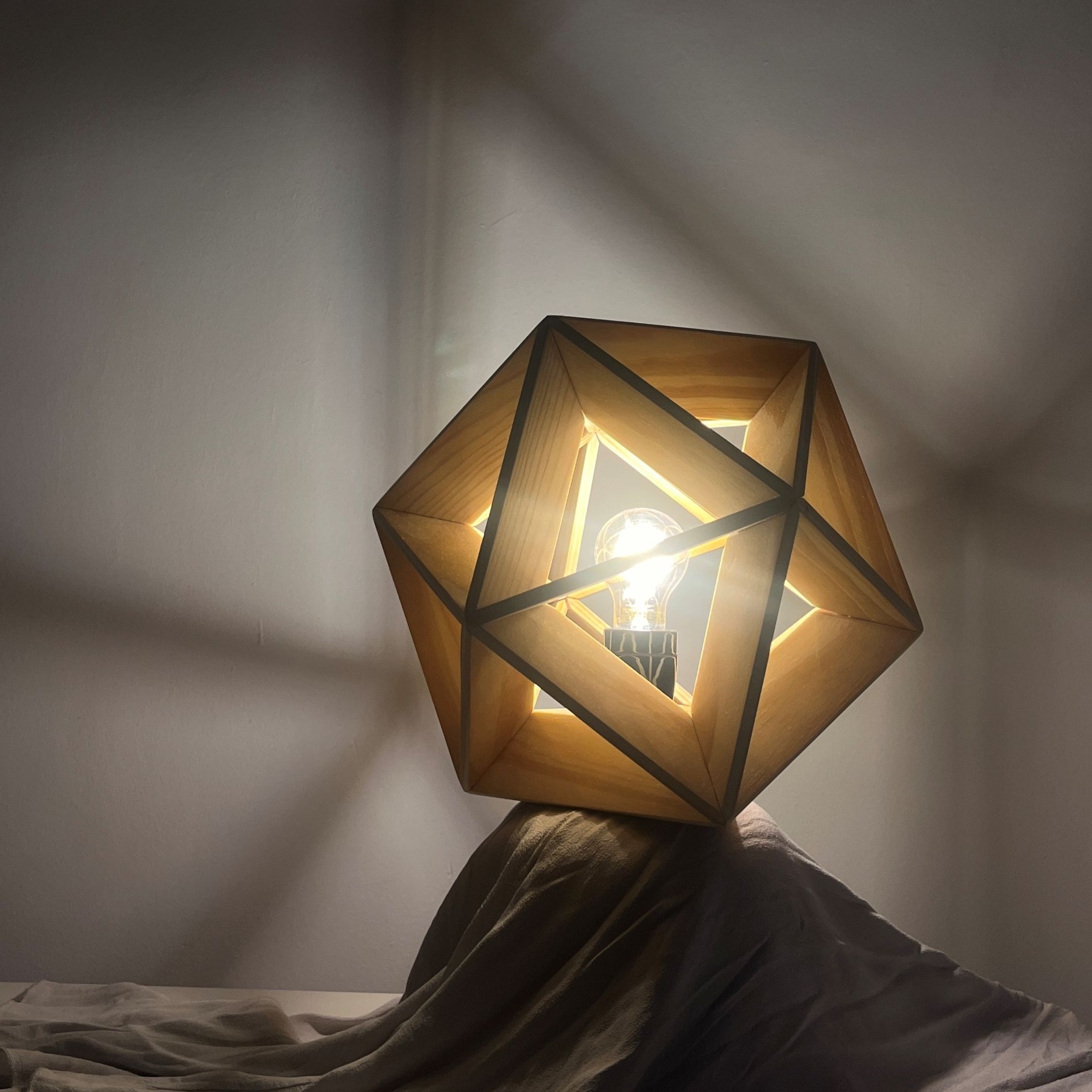Entry DescriptionThis lamp has the form of an icosahedron, a regular solid with twenty identical faces. In this case, the edges of the geometry are used to create a frame that embraces and showcases a soft vintage lightbulb. The wooden edges are flat, giving the lamp a strong yet elegant structure that also allows the light to spread. About 85.3% of the light passes directly through the wooden frame into the environment, while the rest is reflected and diffused indirectly.