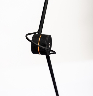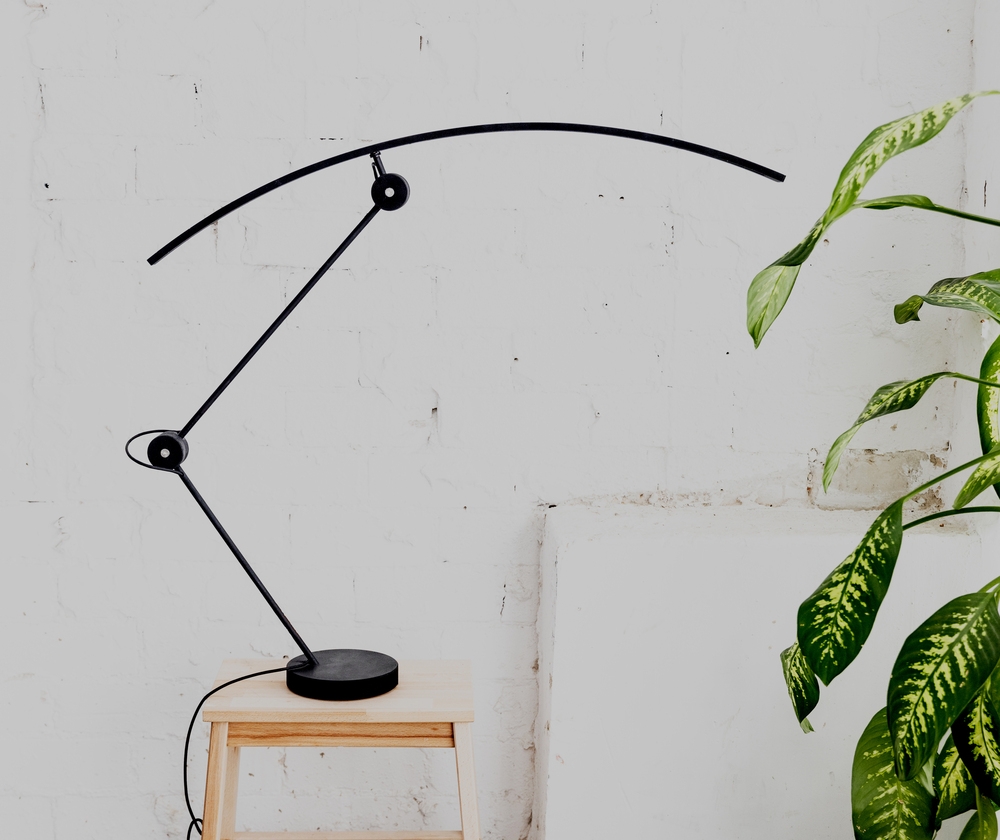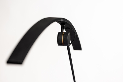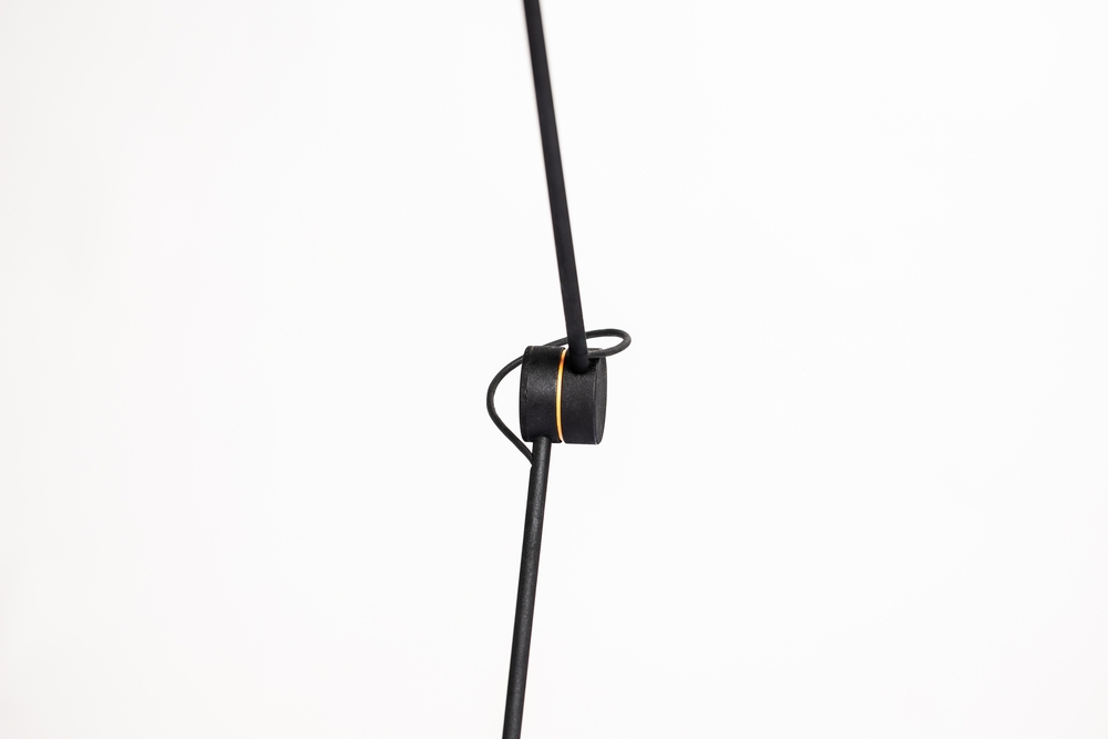 The lamp was entirely handcrafted on a lathe from aluminum and stainless steel to ensure durability and long-lasting quality. It reaches a maximum height of 125 cm, with a 90 cm arc span. The matte black, grainy texture was carefully chosen to reduce visual noise, allowing the geometry and light line to take center stage. A subtle orange accent adds a restrained, sporty touch, breaking the monochrome with intention.