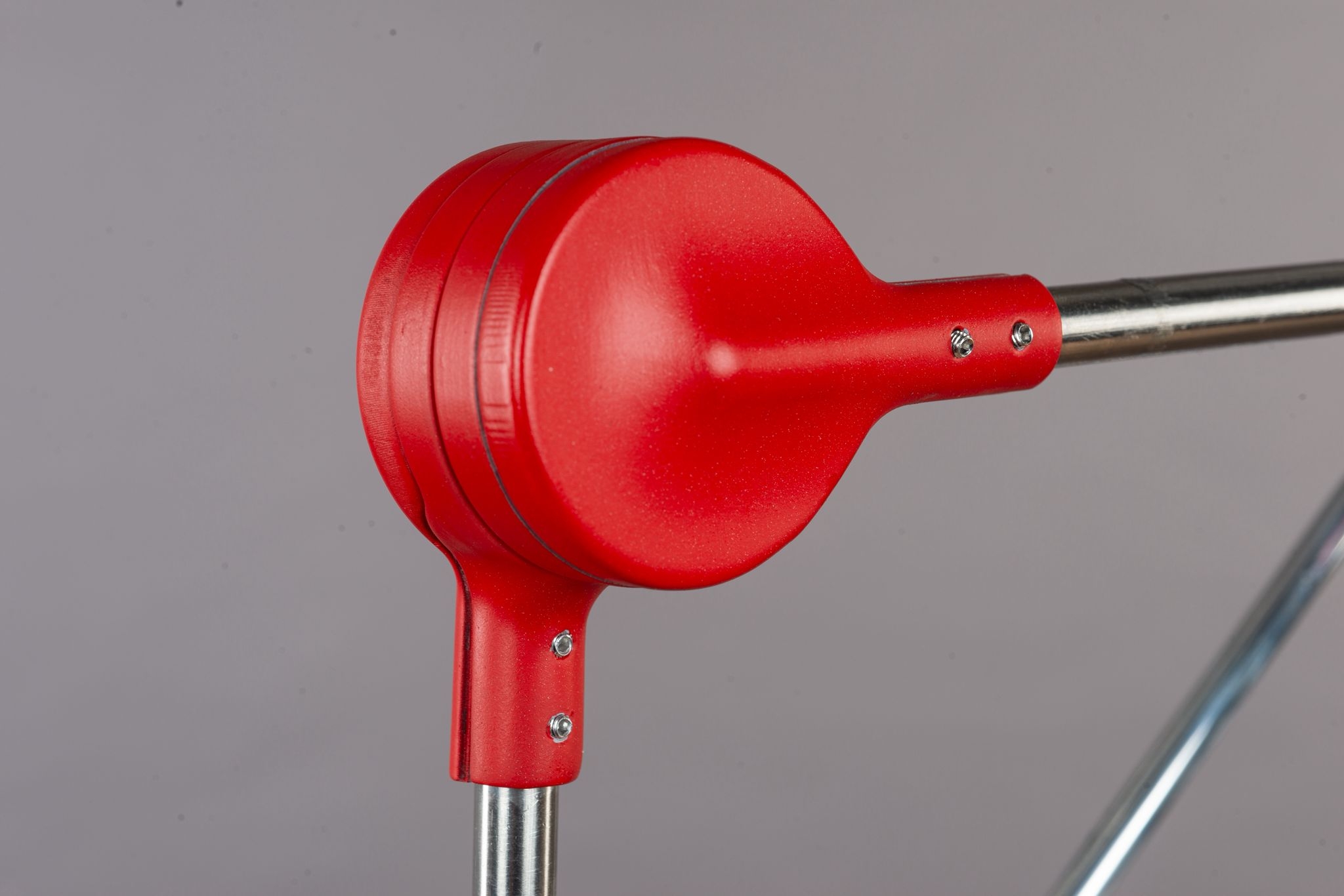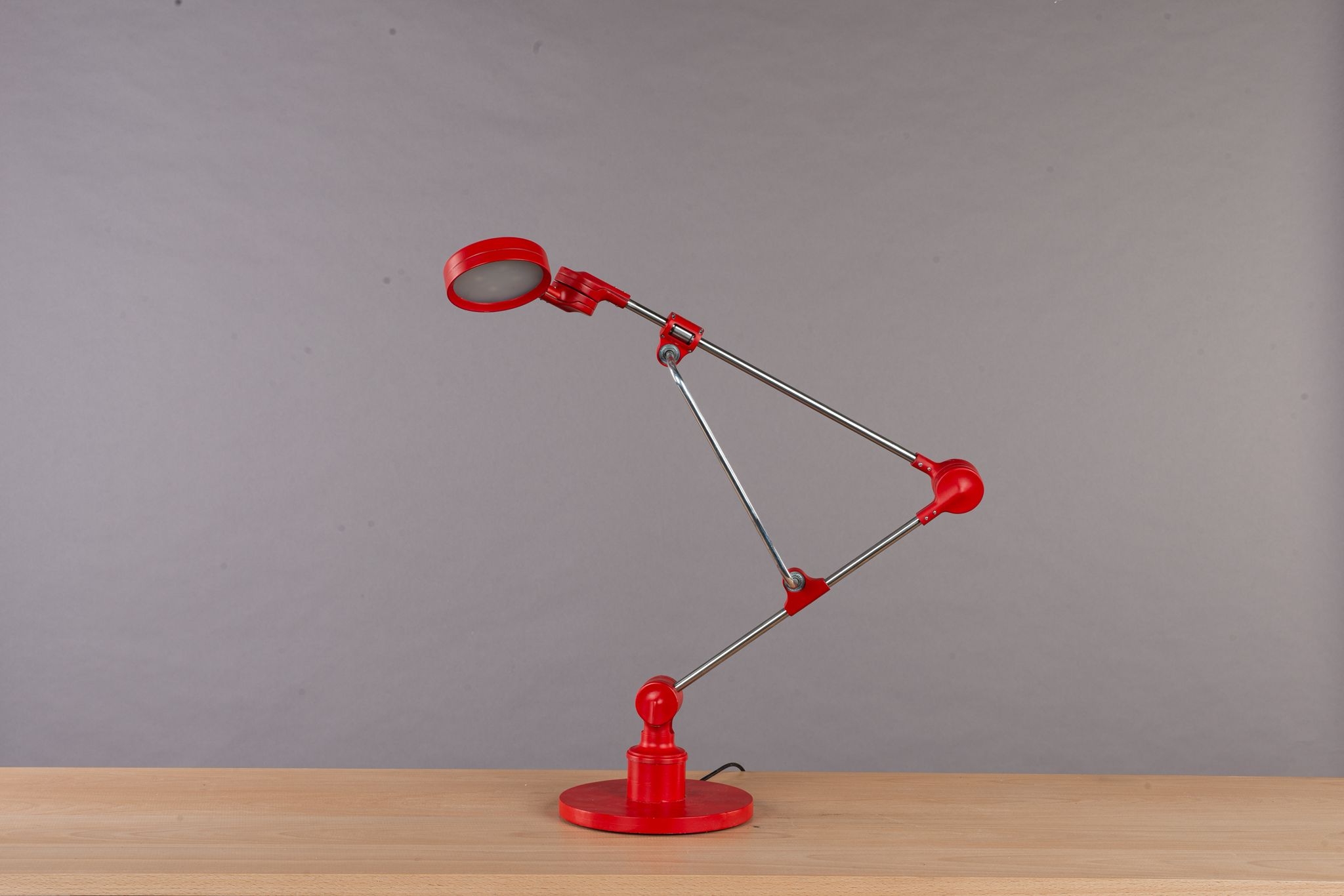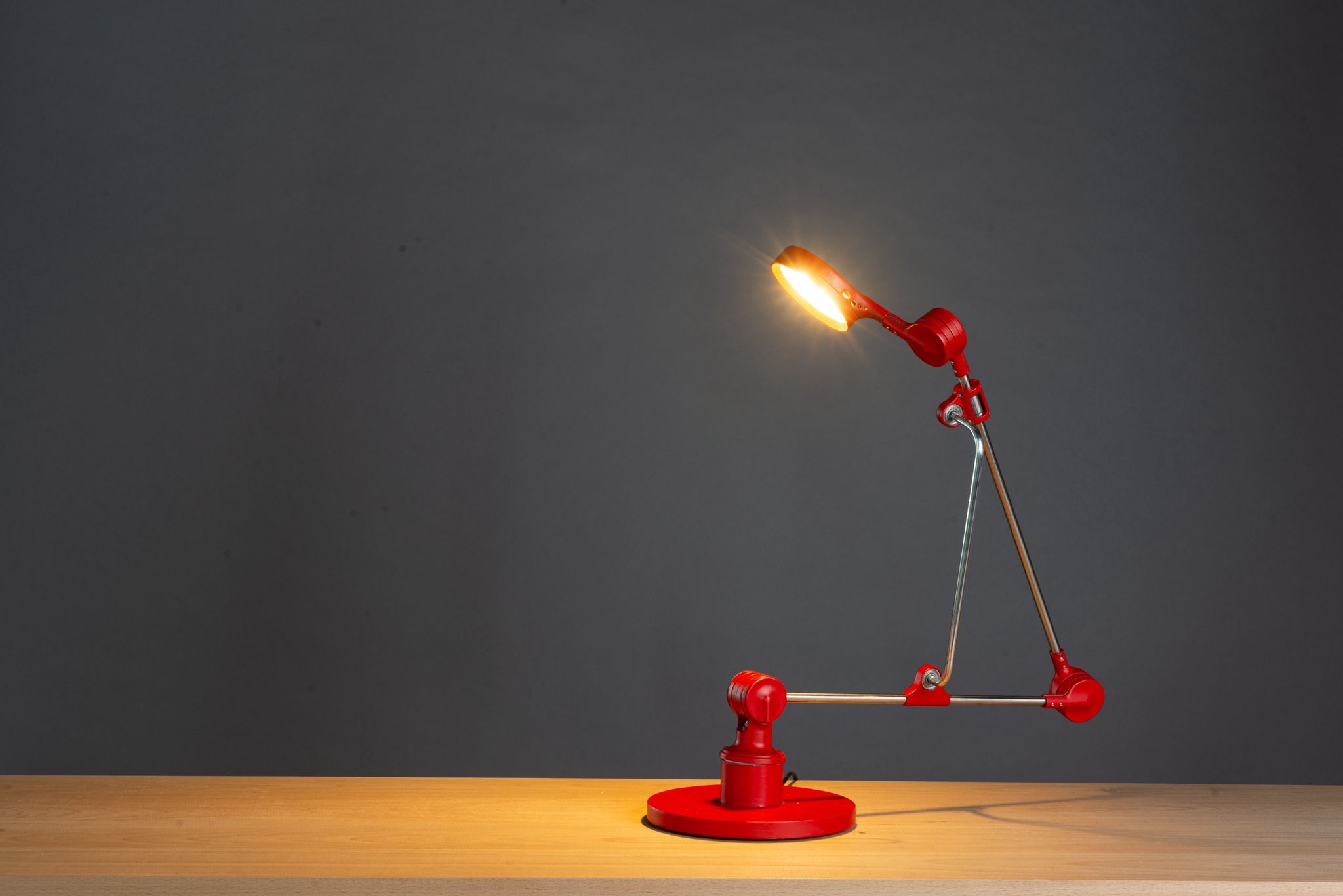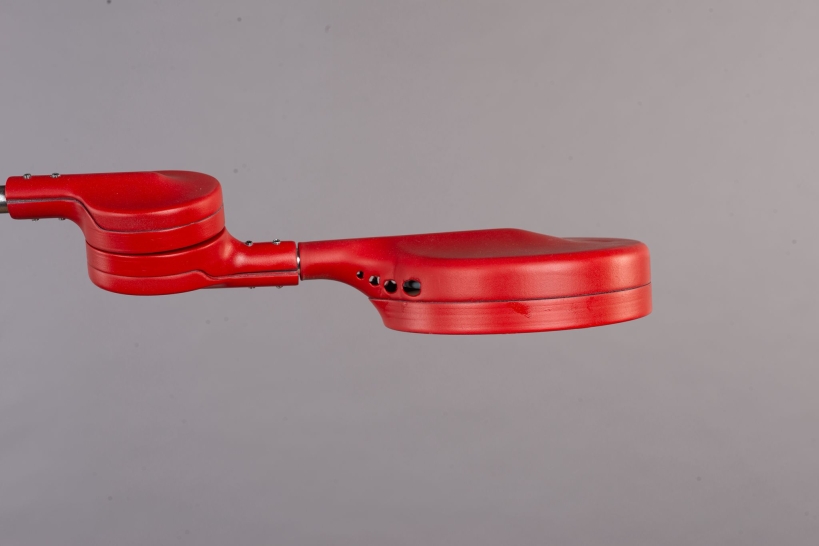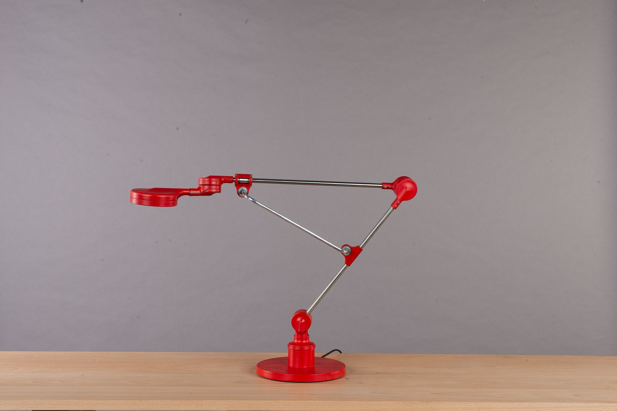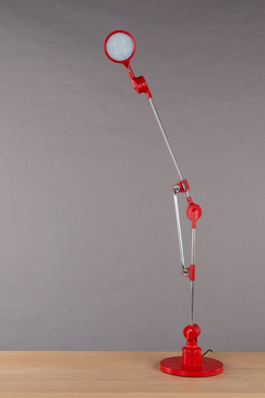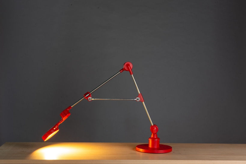 Entry DescriptionRuby is a desk lamp that fuses engineering precision with sculptural elegance. Built on a linear bearing system, it allows smooth and versatile movement. The connector, draped over the rod like a sheet of fabric falling naturally into place, softens the strict geometry and introduces an organic, fluid quality. With its bold red finish and poetic presence, Ruby becomes more than a lamp it is a functional yet graceful design statement within the space.