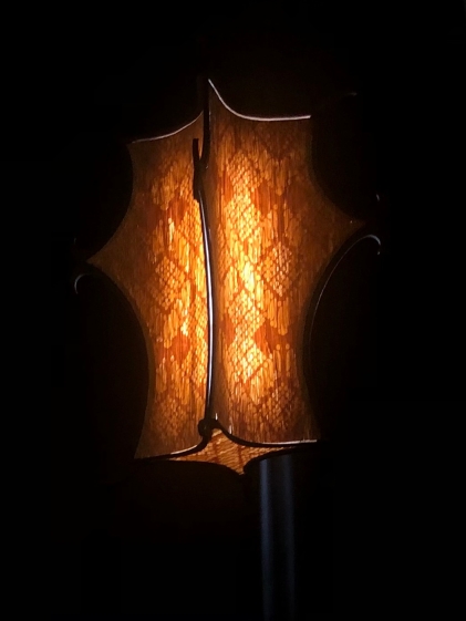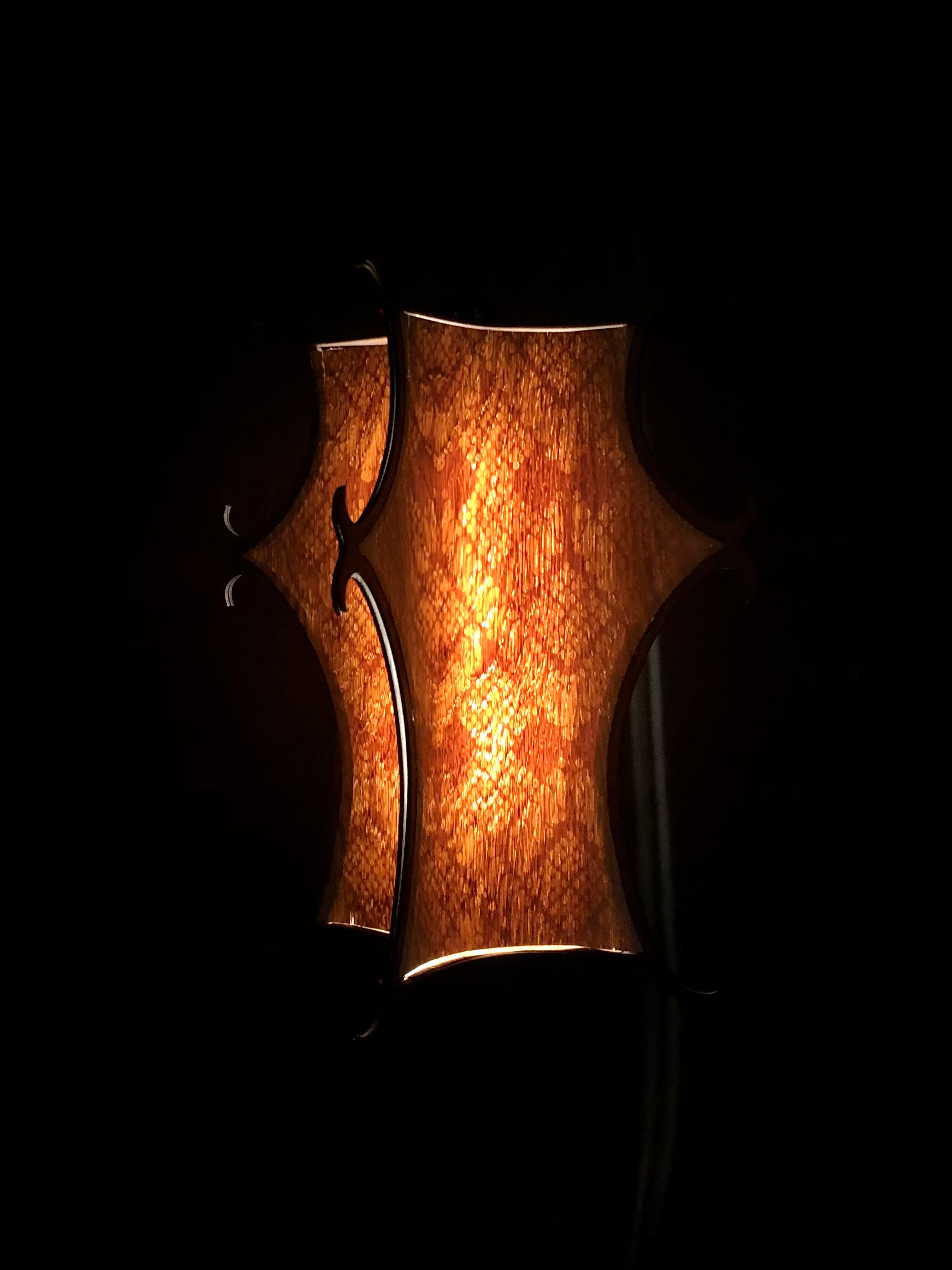 Unlit, the lamp offers a sculptural silhouette in warm-toned wood; when illuminated, laser-engraved batik patterns emerge, recalling the storytelling tradition of Indonesian textiles. The shade is crafted from paper-backed white oak veneer that’s laser-cut and precisely engraved, then selectively burned to vary translucency and create contrast when backlit.