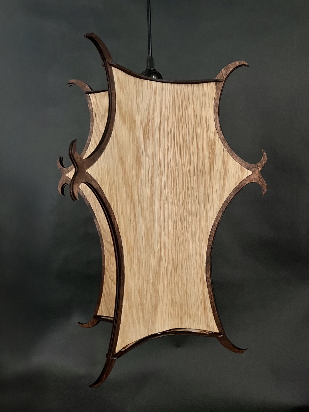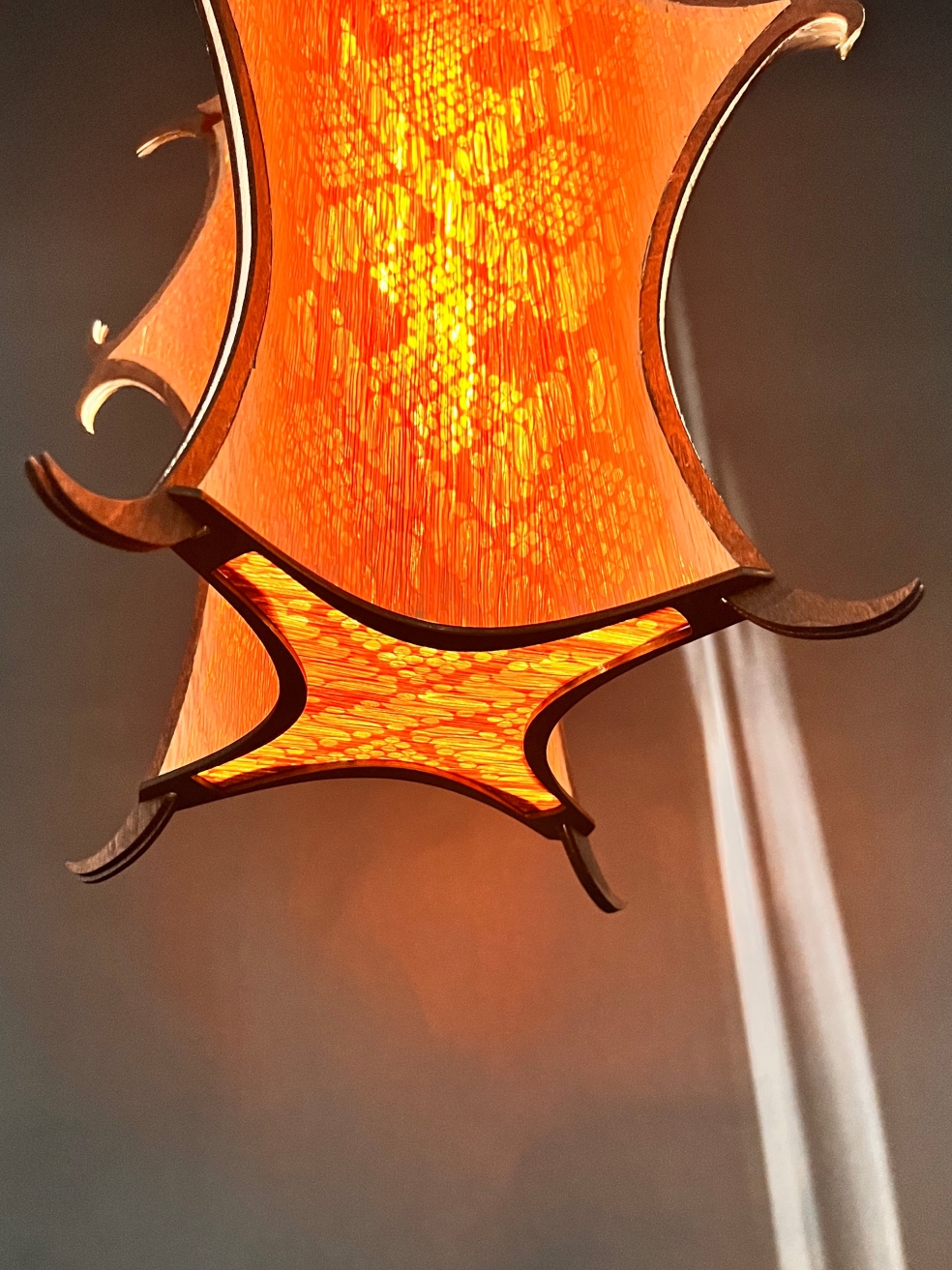 The frame is laser-cut plywood, stained warm brown to complement the veneer. Through extensive prototyping, from paper models to Solidworks 3D iterations and laser-cut tests, Veil demonstrates refined material manipulation, forging an emotional link between form, light, and the designer’s Indonesian roots.