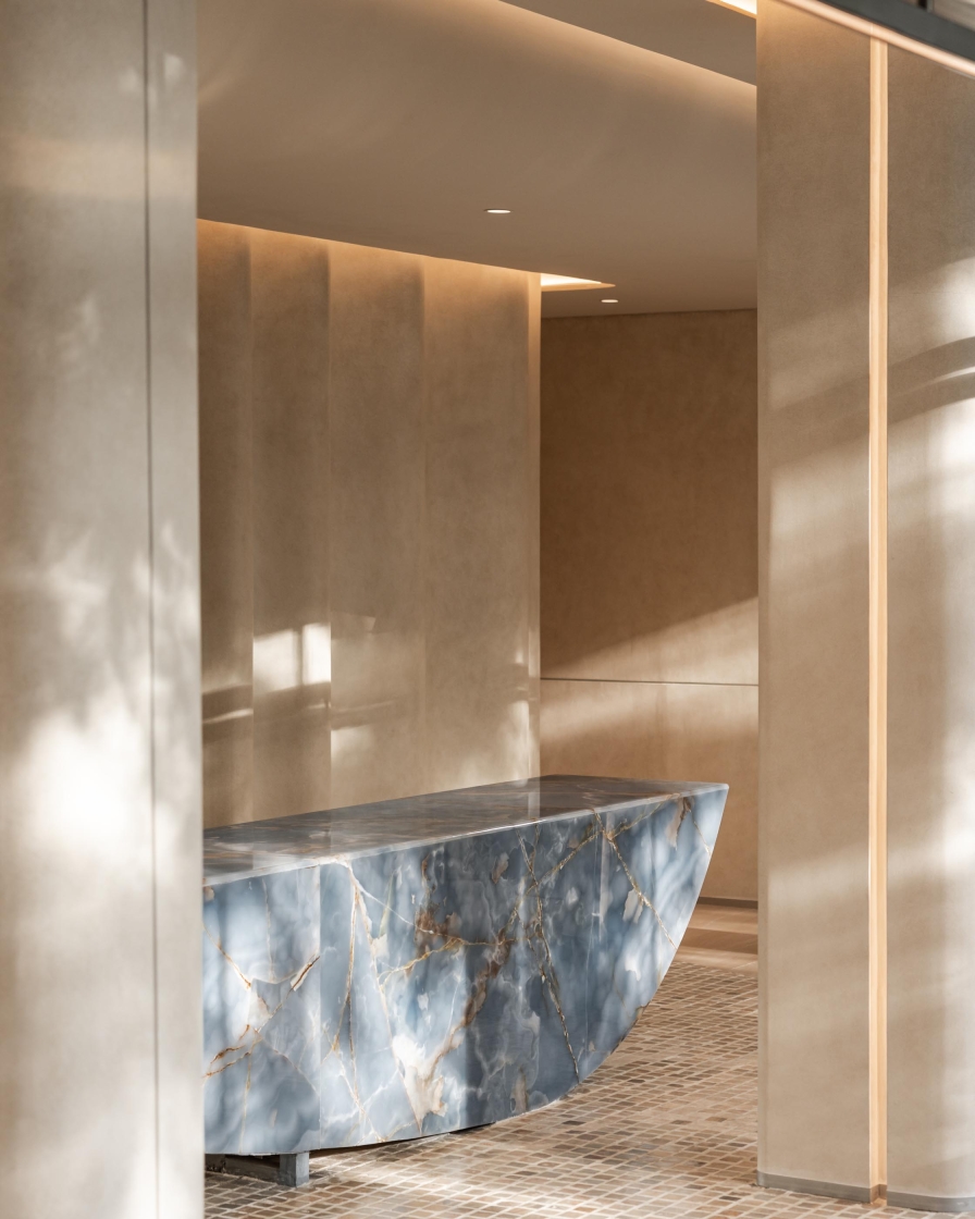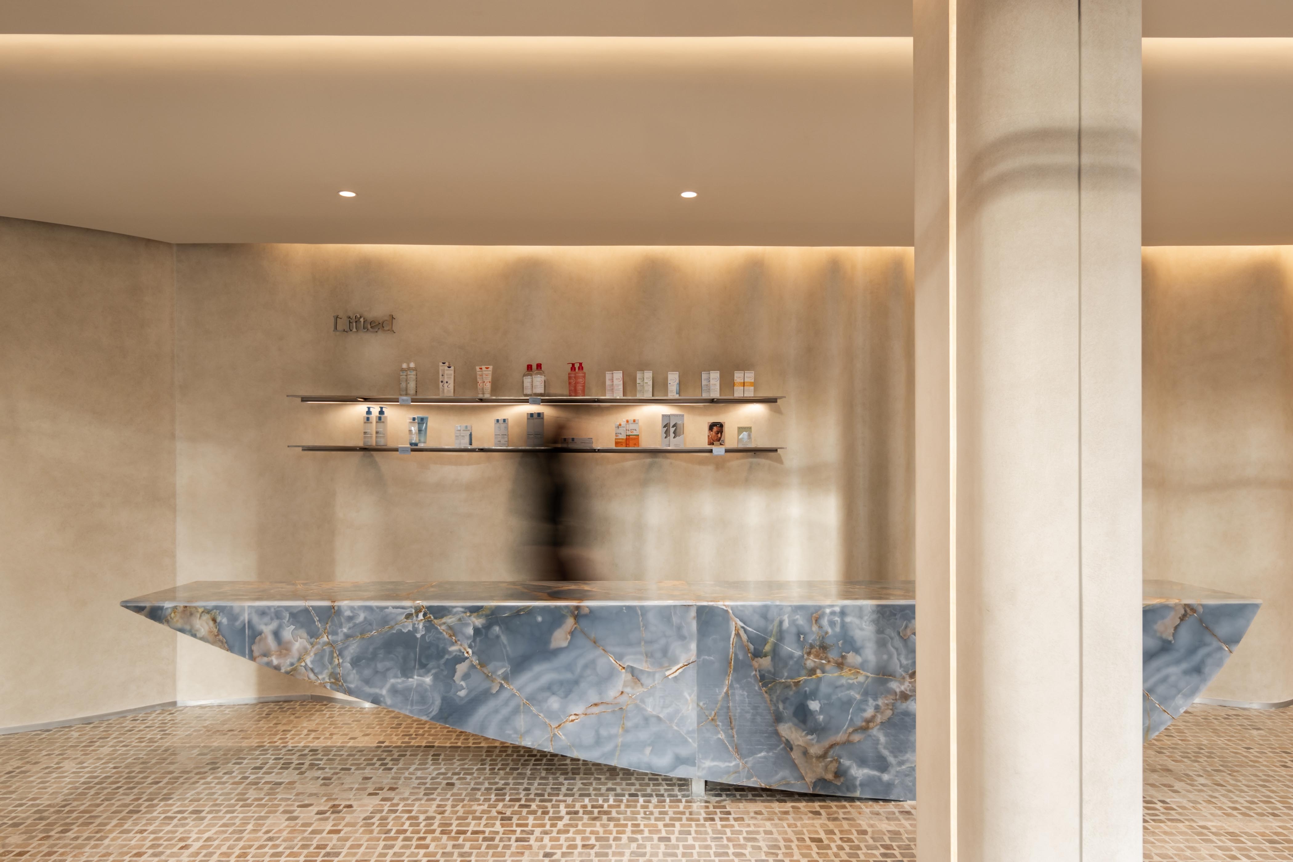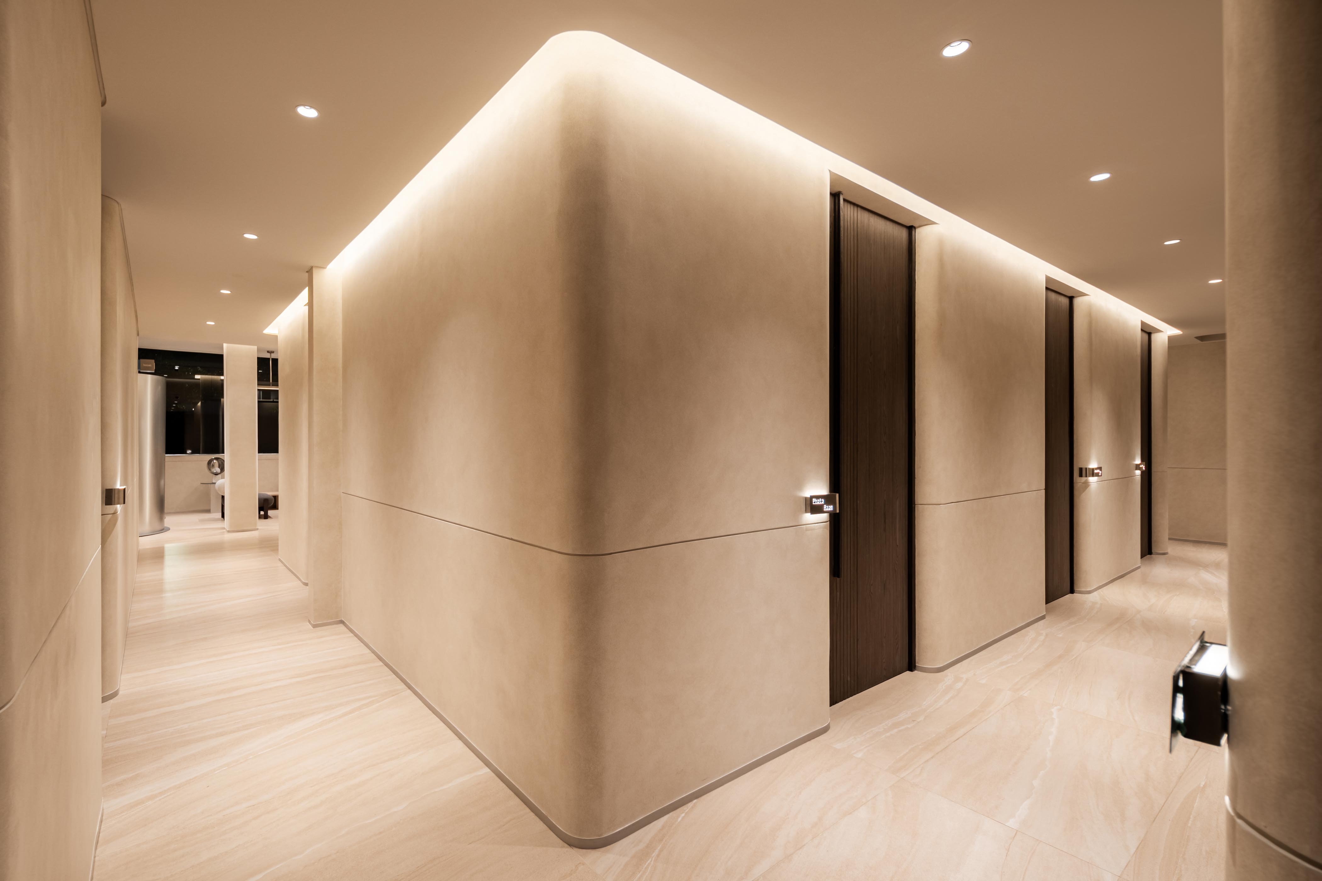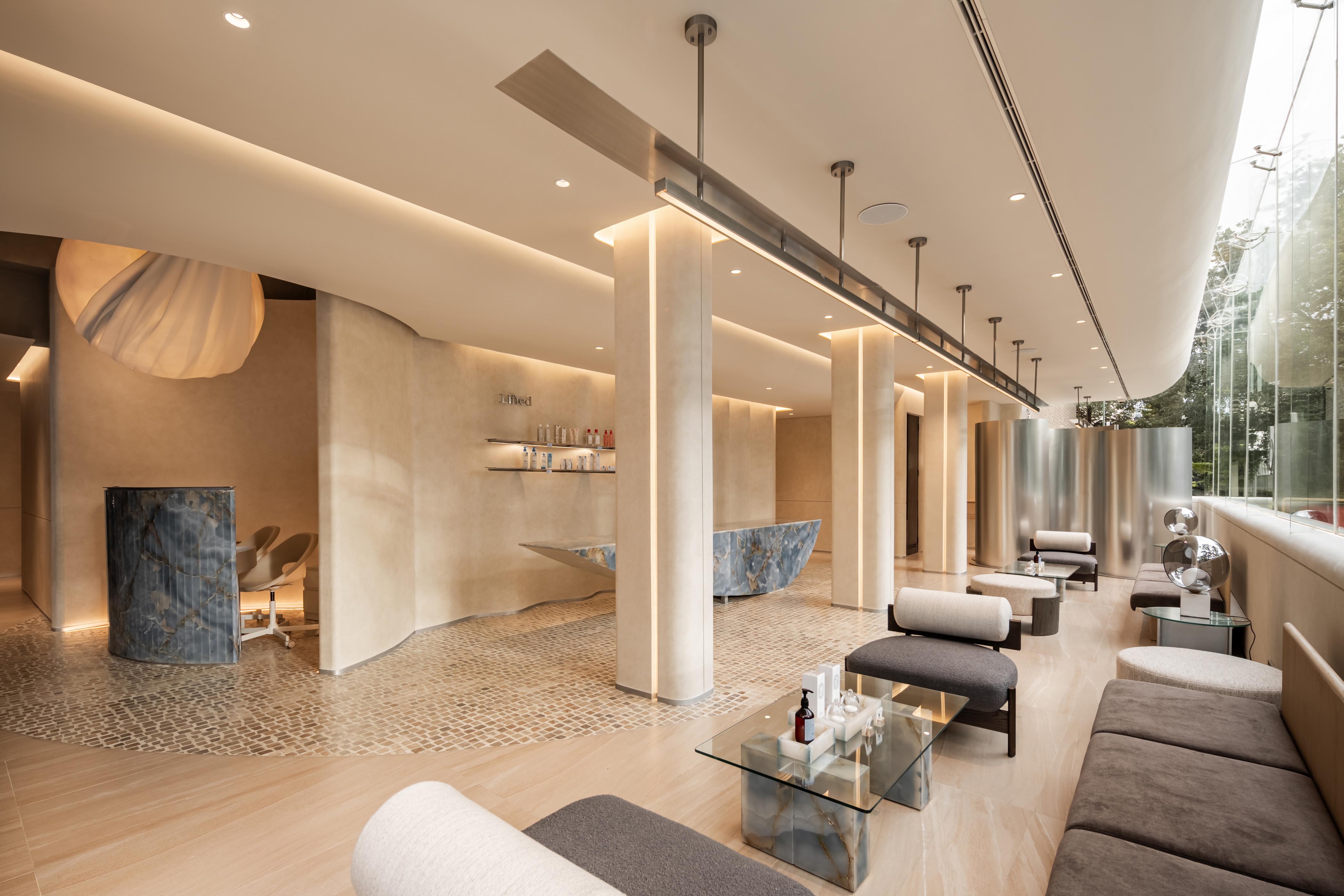 Recessed linear grazers trace the curvature of walls, accentuating the architecture’s fluidity while eliminating harsh shadows. Sculptural focal points, such as the blue marble reception and Gabriel Aries’ syringe-inspired installation, are brought to life with precision spotlights, their textures and forms revealed in rich, true color. Daylight is seamlessly integrated with artificial illumination, ensuring continuity from sunlit lounges to softly lit treatment rooms.