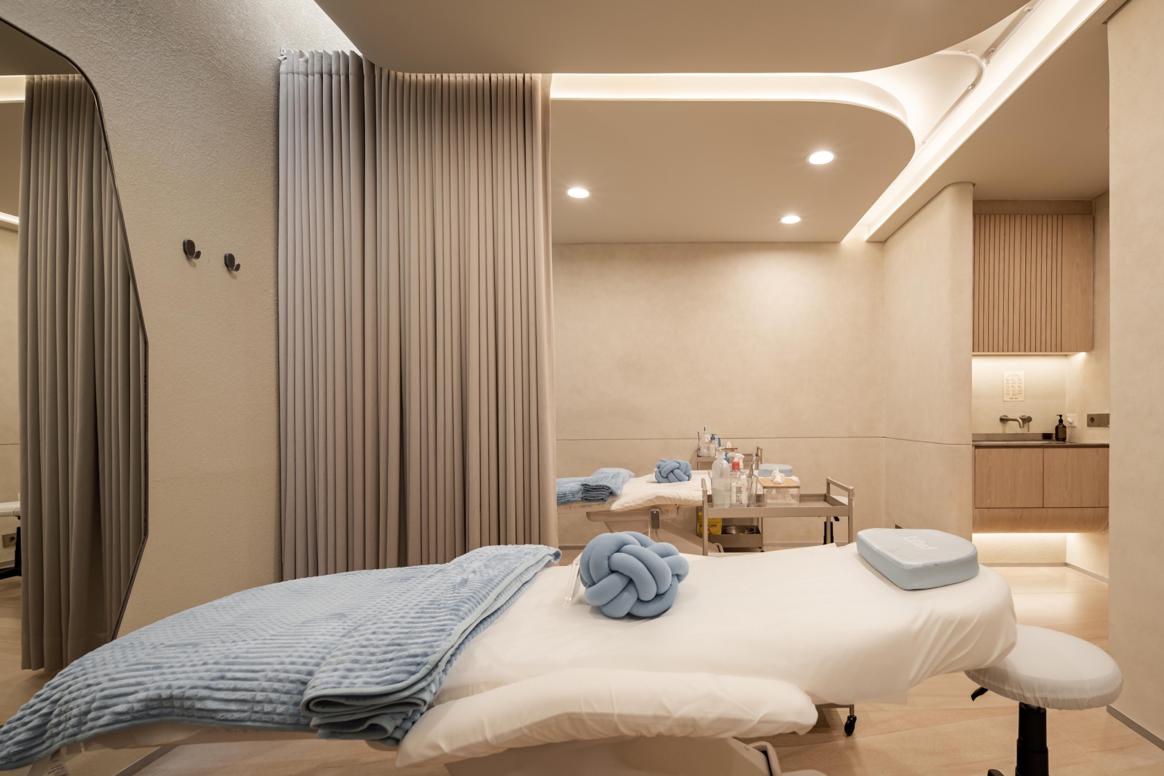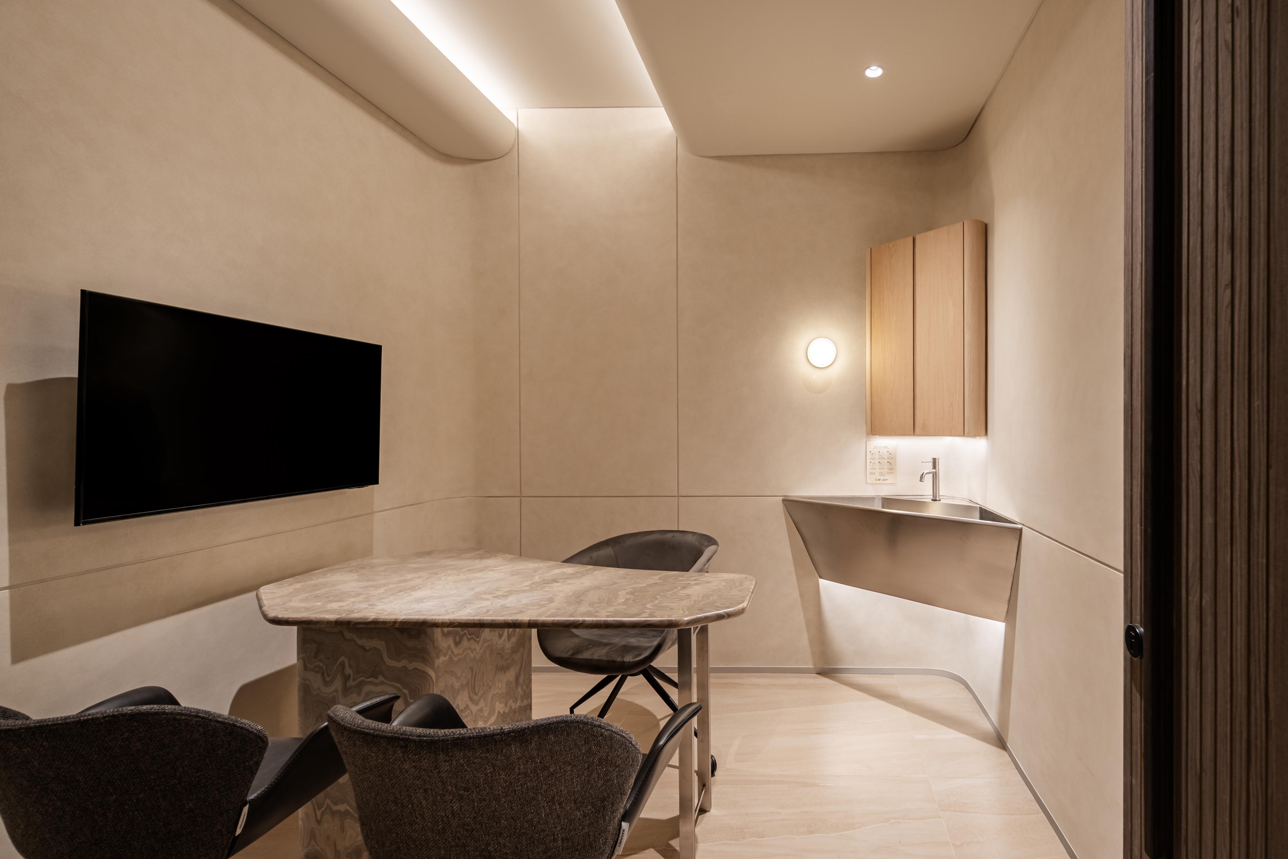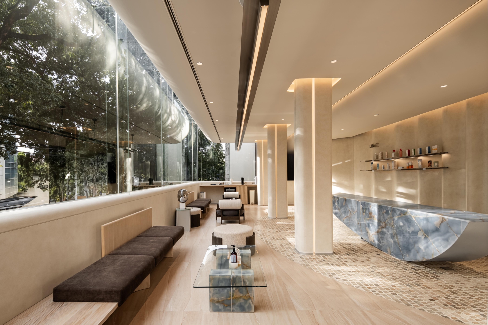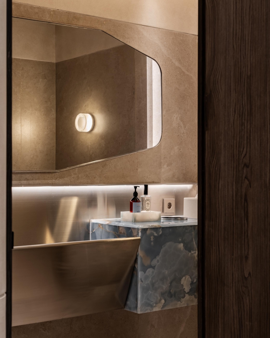 Recessed linear grazers trace the curvature of walls, accentuating the architecture’s fluidity while eliminating harsh shadows. Sculptural focal points, such as the blue marble reception and Gabriel Aries’ syringe-inspired installation, are brought to life with precision spotlights, their textures and forms revealed in rich, true color. Daylight is seamlessly integrated with artificial illumination, ensuring continuity from sunlit lounges to softly lit treatment rooms.