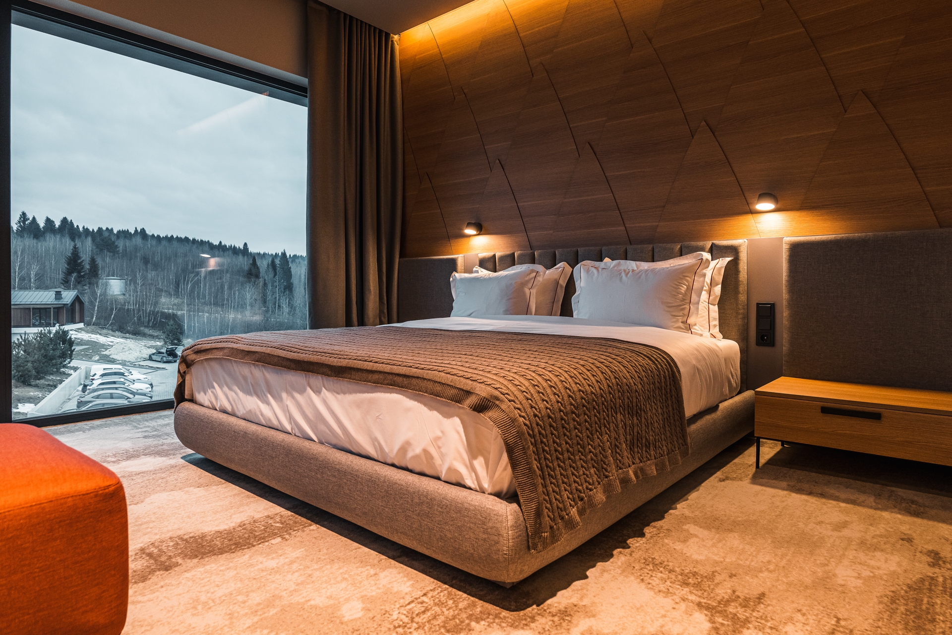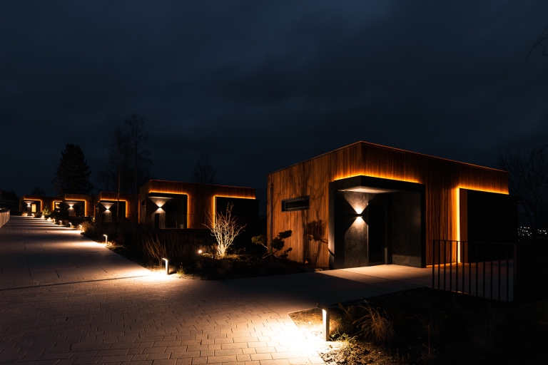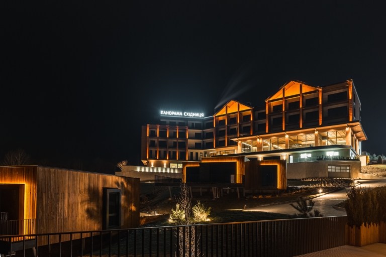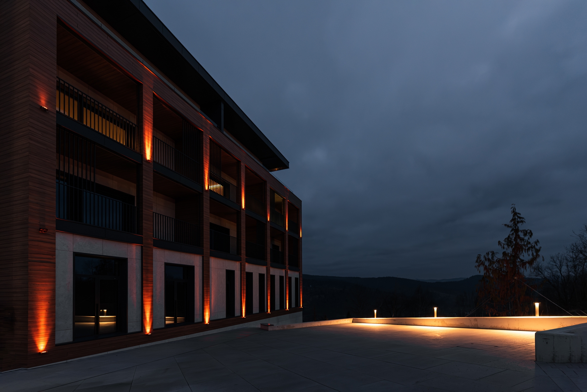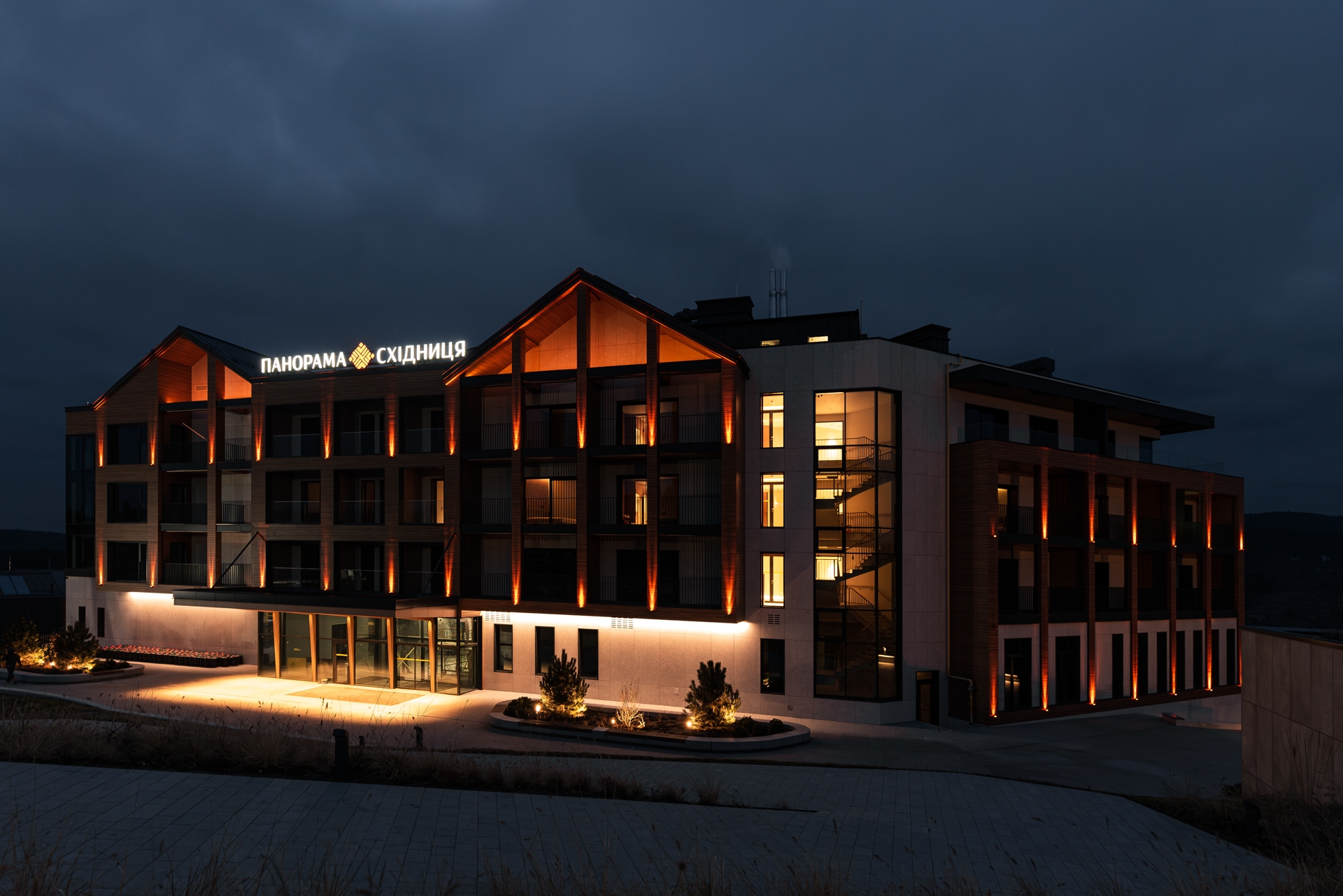 Entry DescriptionThe lighting design of the "Panorama Skhidnytsia" hotel complex was created to harmoniously blend the architecture, the building’s concept, and the mountain landscape. The goal is to highlight wooden architectural forms and integrate the complex into its natural surroundings. Color zoning reflects unity with the landscape: upper floors ("mountains") are illuminated with warm amber light, the ground floor ("foothills") with soft warm white (2700K), and the conference hall and pool ("mountain river") with neutral white for a fresh look.