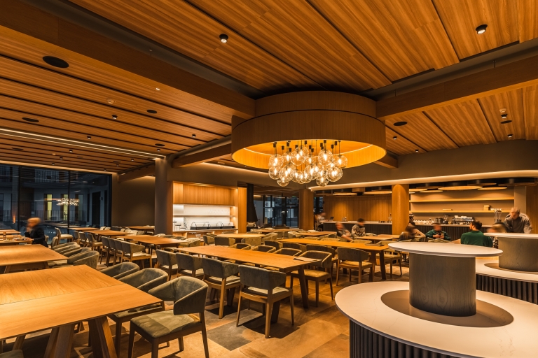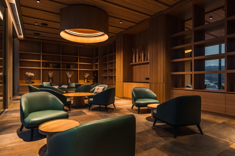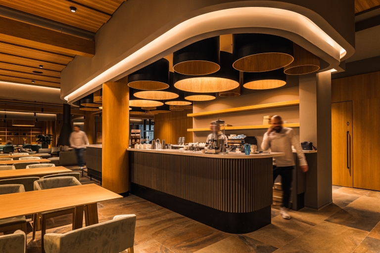 The entrance area is divided into a fireplace zone, reception, and lounge. Cozy lighting from pendant fixtures with individual control creates a warm ambiance. Decorative beams are accented with LED strips, emphasizing architecture. In the restaurant, fixtures with wide light angles and anti-glare grilles ensure comfort. Their random arrangement suits the multifunctional space (restaurant, bar, open kitchen).