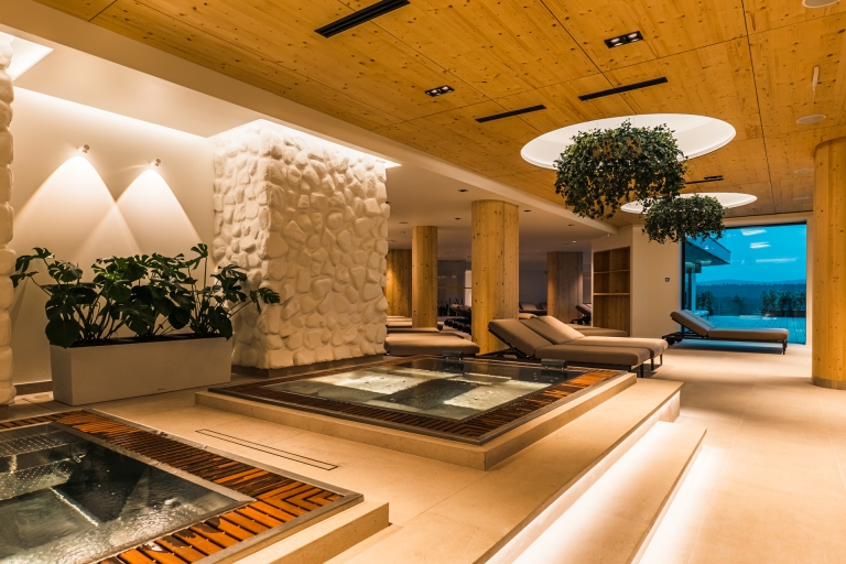 In the SPA and pool, lighting adapts to the time of day via smart control. At night, the pool features contour lighting and water illumination for aesthetic appeal. Waterfalls have colored lighting for visual accents. The lighting design combines functionality with a natural, harmonious atmosphere.