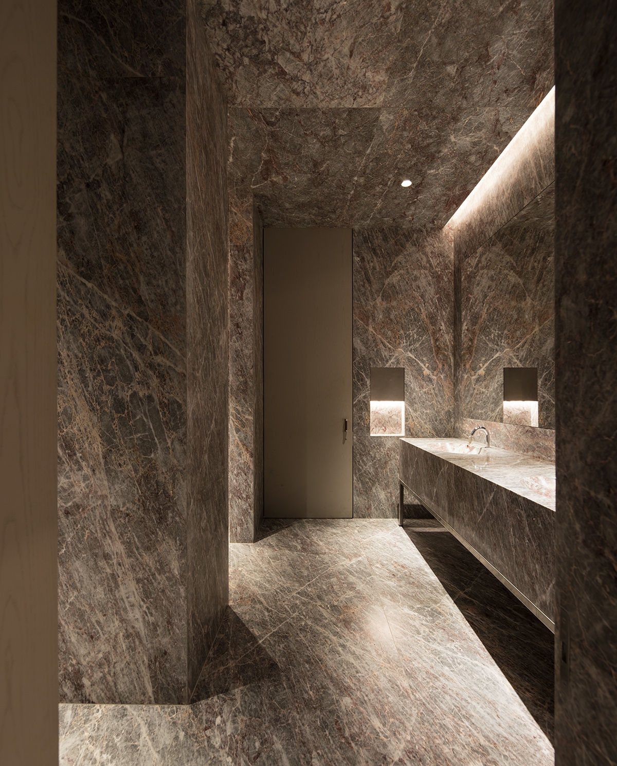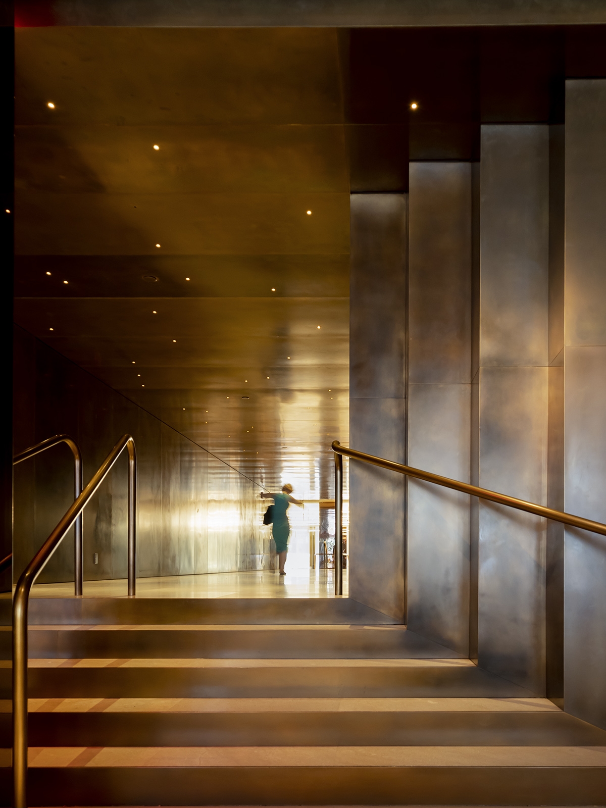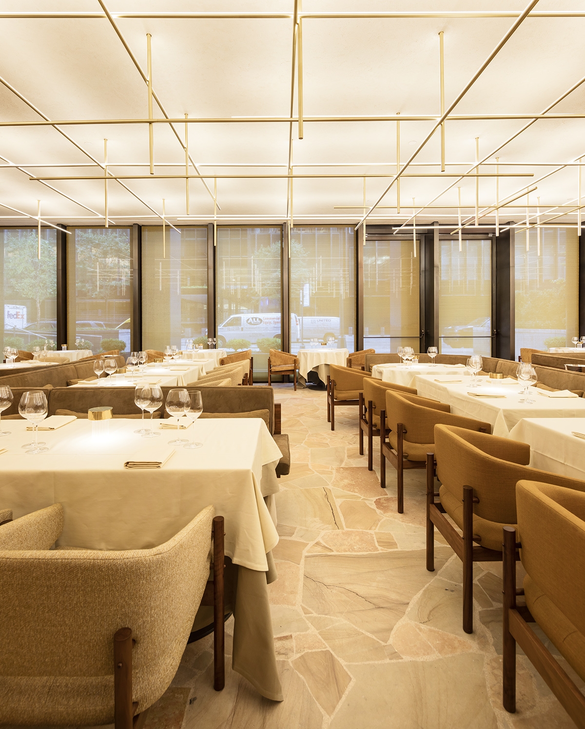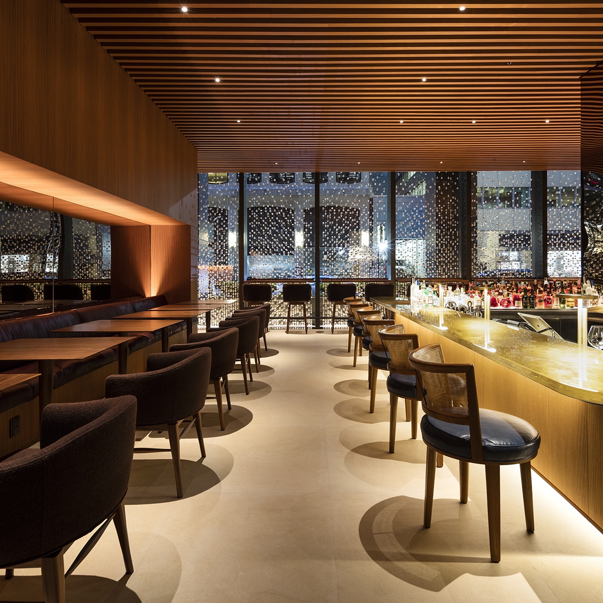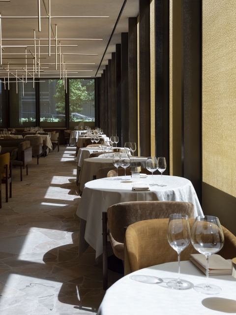 In the procession from the bar, a dimly-lit oxidized brass tunnel with miniature point-lights acts as a runway, emphasizing a feeling of compression before opening up to the brighter main dining room featuring an up- lit ceiling with a custom tubular pendant, creating a soft and diffuse quality of light.