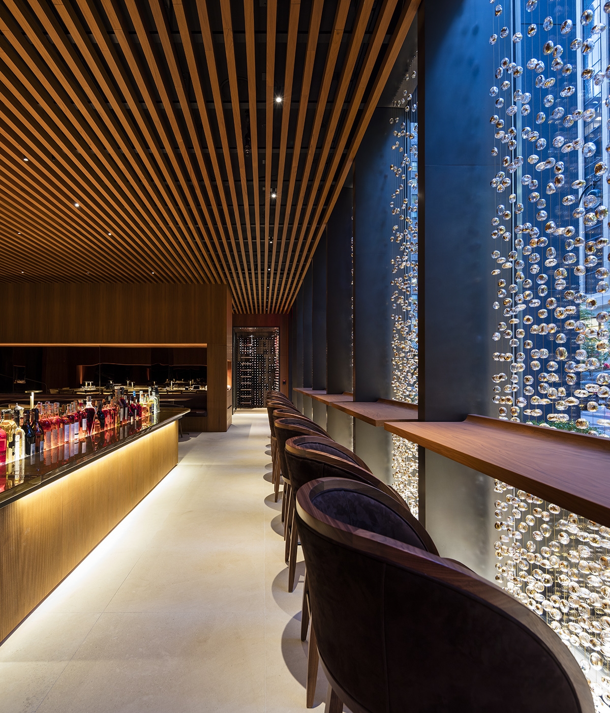 The moody bar space is anchored by a central sunken bar with table lamps highlighting a gold- backed glass bar top. The windows are lined with grazed curtains of hand-blown gold-flecked glass beads, providing sparkle.