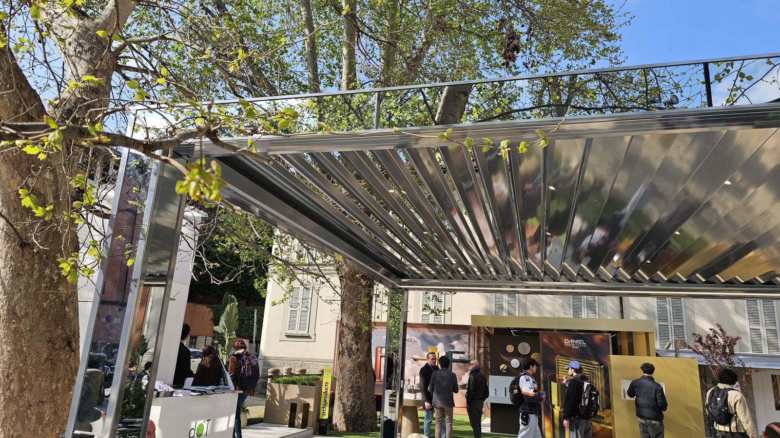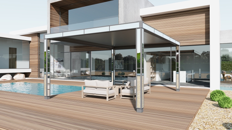 At the moment the bioclimatic pergola is just a prototype, but in the future it will be possible to install walls of mirrored glass with high refractive power to provide thermal insulation and reduce cooling costs in the summer.