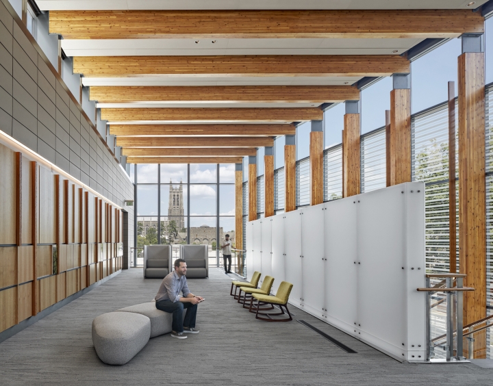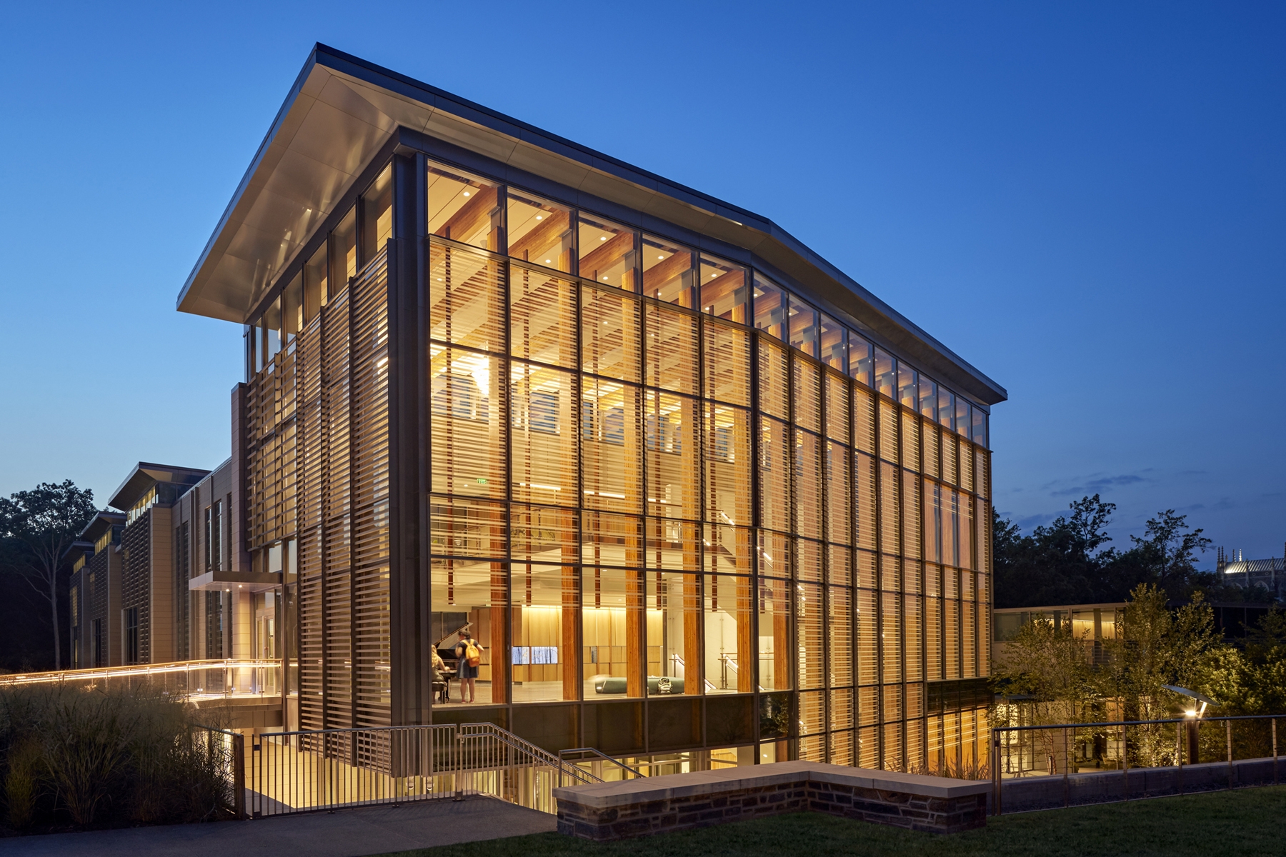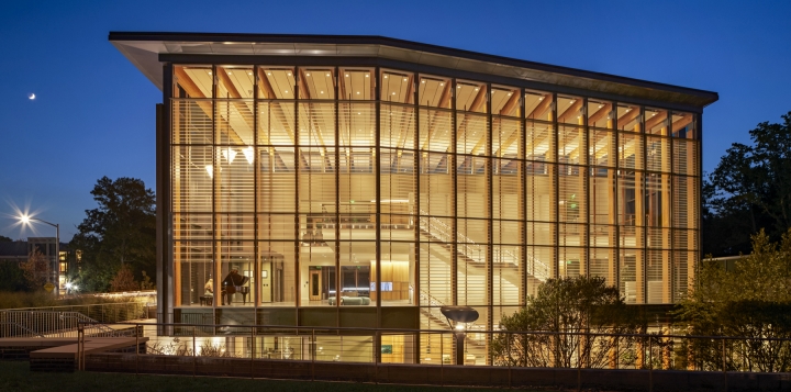 Through its natural materials and expansive, transparent wall, the architecture provides a sanctuary for the student population. The lighting design illuminates the building from within, creating a welcoming presence that emphasizes this commitment. The many layers of light softly illuminate the interior surfaces and effectively dematerialize the exterior glass wall.