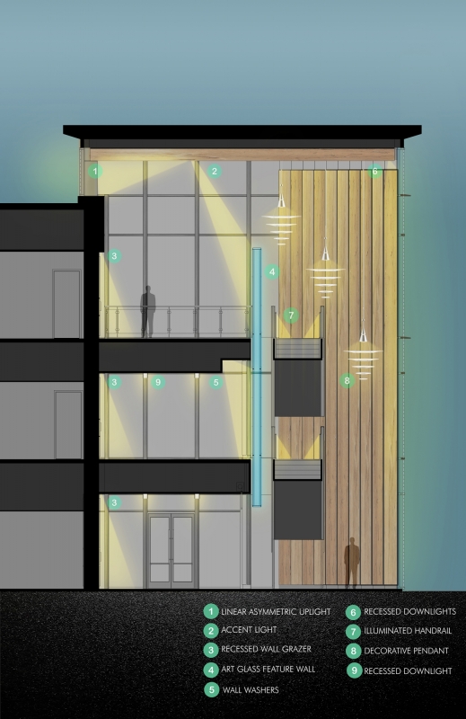 To heighten the effect of the light so it appears to come from the structure itself, the lighting is integrated and hidden into the architecture. The lighting is detailed in a way that prevents direct light-spill from the building into the sky after dark. An astronomical timeclock controls the lighting, dimming it slowly over the evening.