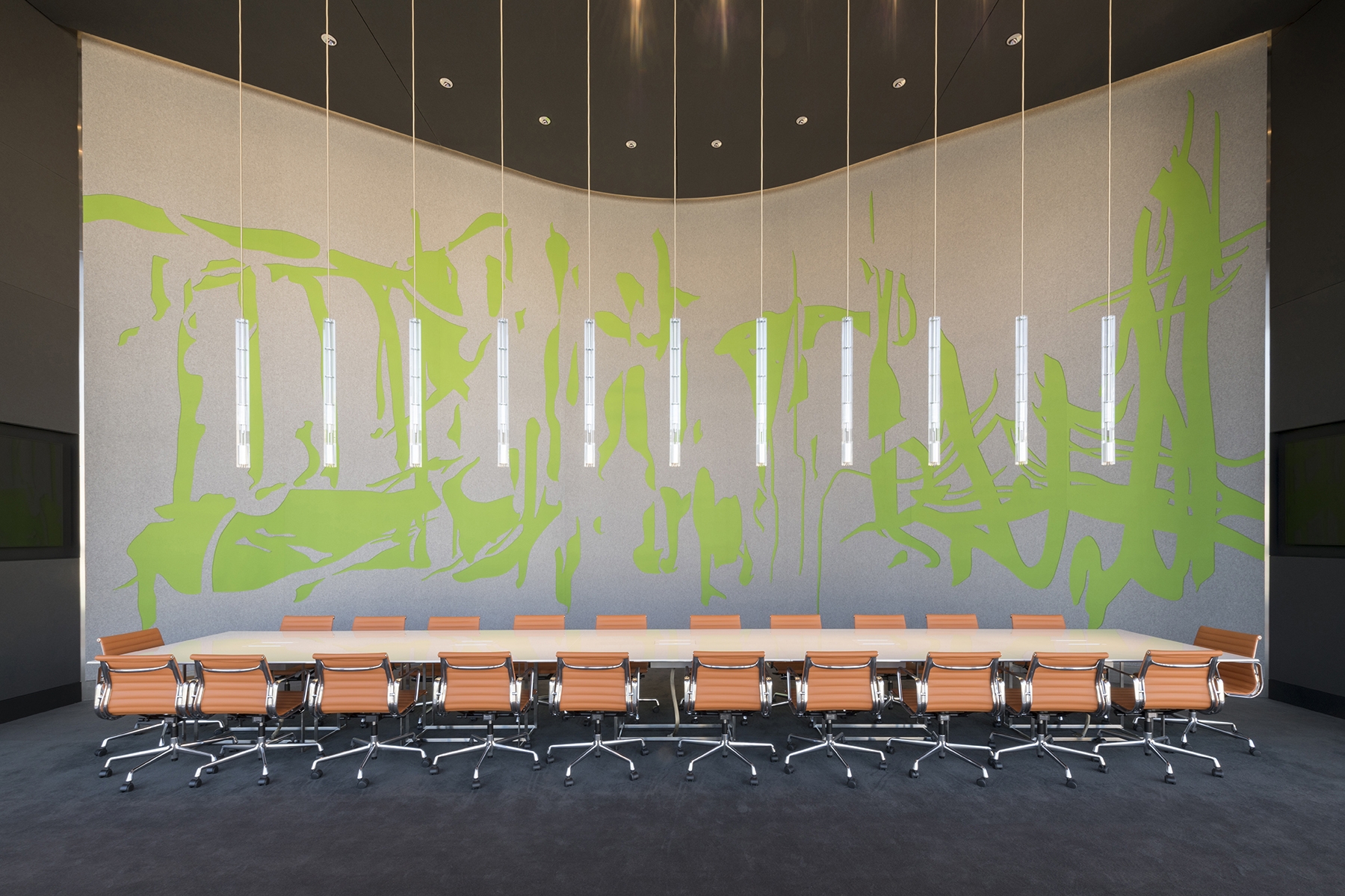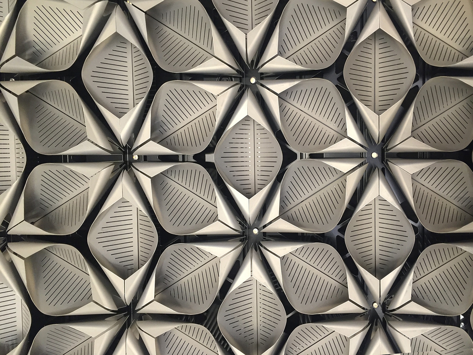 At the interior, the bespoke ceiling system, is created from two million three- dimensional, metal “petals” that house individual LEDs at their intersections. This low-brightness system is calibrated at a reduced output to minimize wattage consumption while still achieving the desired 300 lux on the working plane throughout.