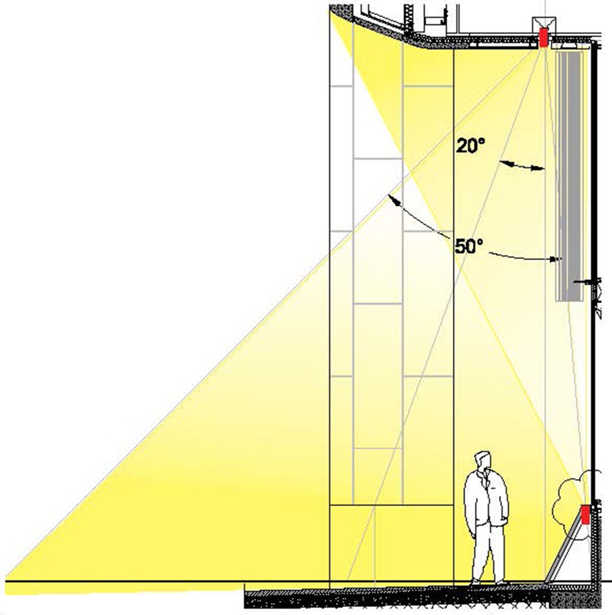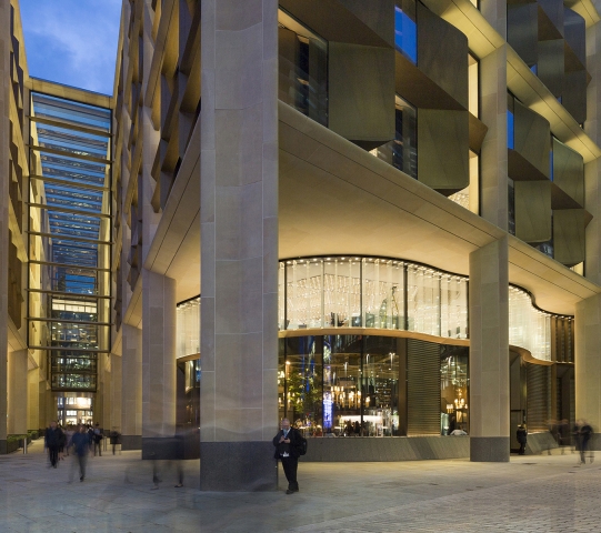 The public realm around the building is topped with a ribbon of crystalline fins, edge-lit with concealed LED’s adding a sparkle of light that creates a unique identity for the two lower floors. LED accent-lights located between the fins, tilted minimally out towards the carriageways, provide soft illumination while linear LED’s, with carefully selected optics for each unique application, are regressed within the top of the stone plinth to uplight the stone soffits.