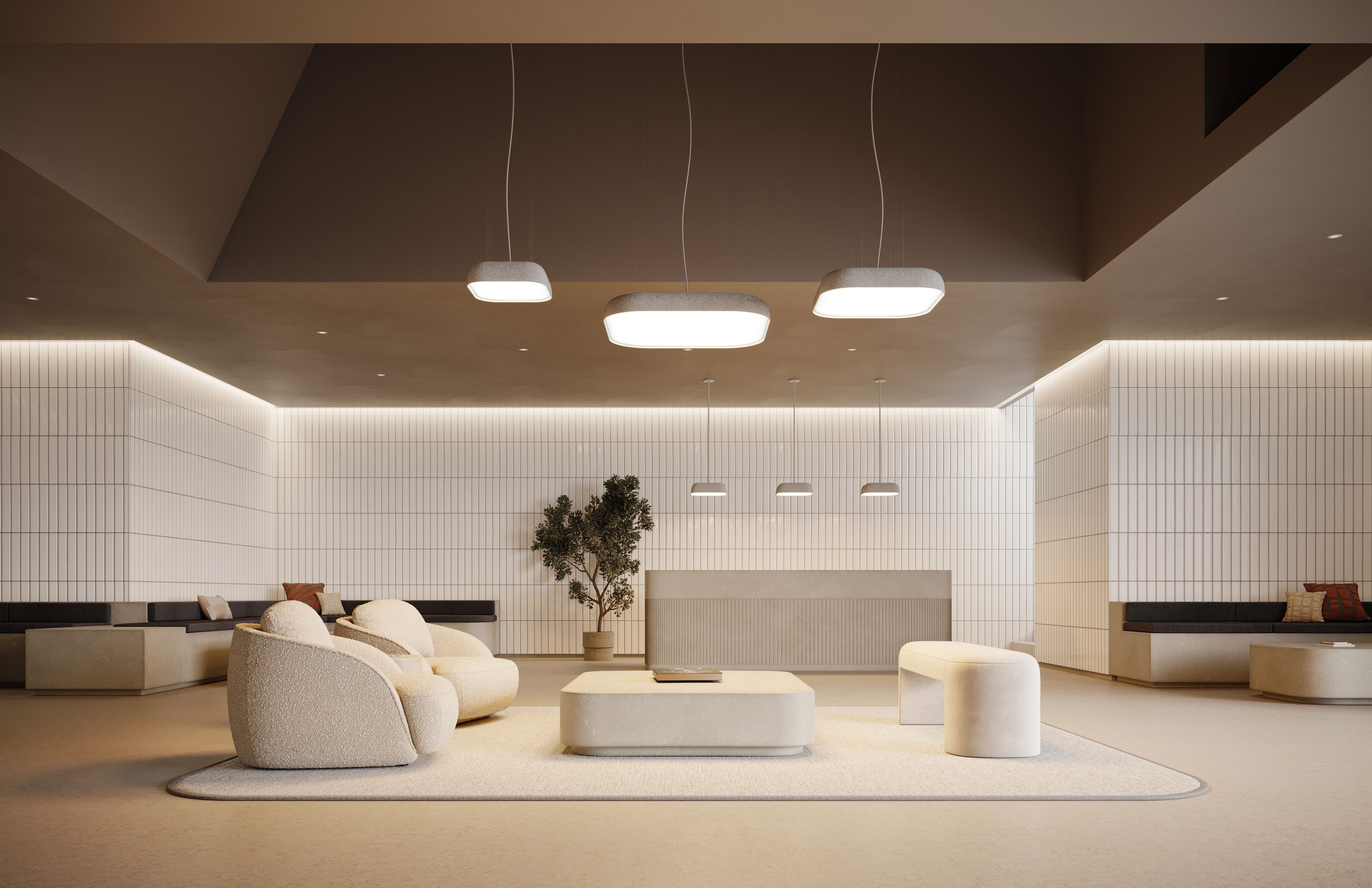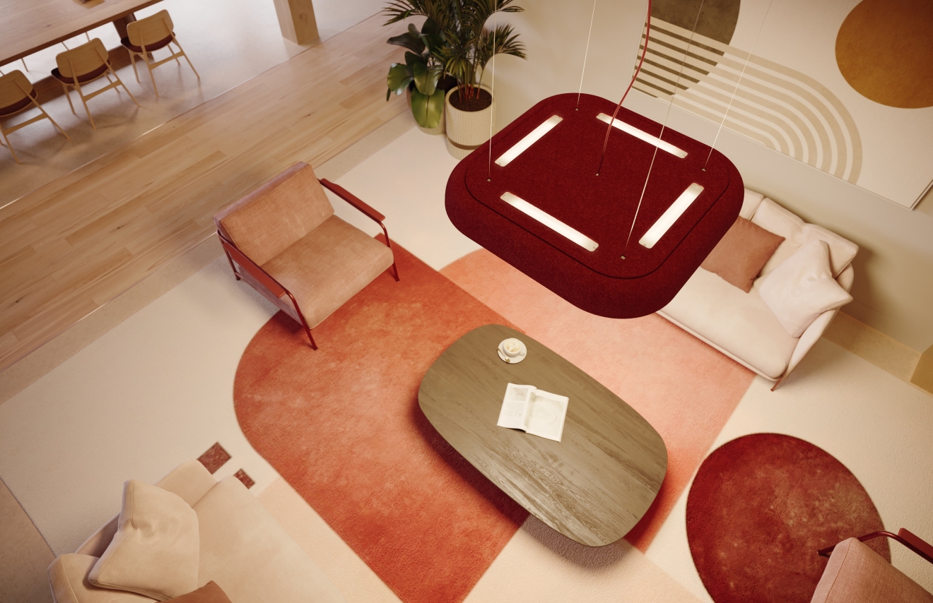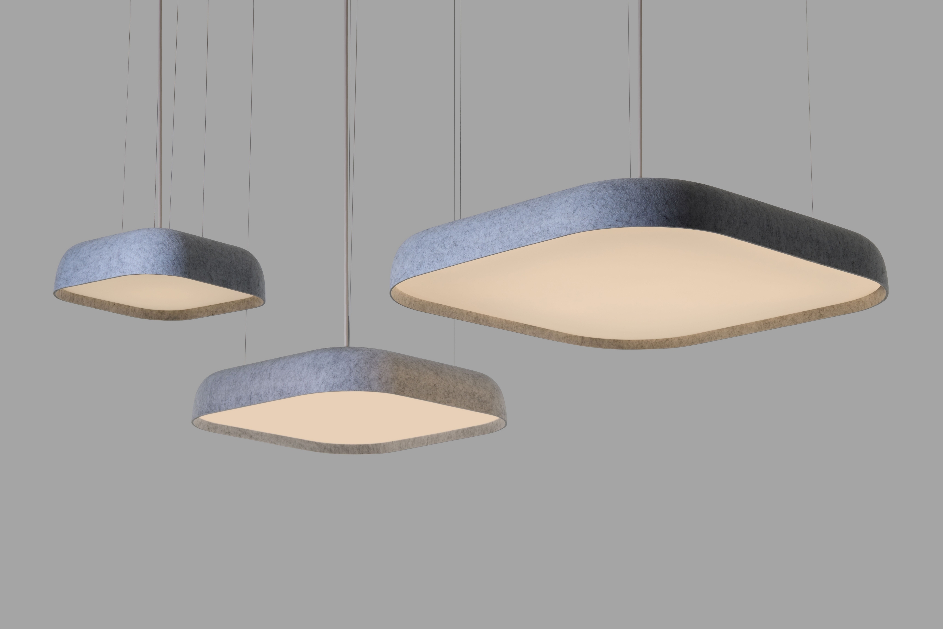Cirra luminaire is square, with soft, rounded edges, creating a unique shape that adds a welcoming feel to modern spaces. Clean lines and hidden hardware contribute to a seamless, refined aesthetic. In 15", 24", or 35" diameters, Cirra is offered as a cable mount pendant or surface mount; the smaller 15" version may also be selected with a pendant stem mount. The luminaire is 4.2" in height, contributing to a minimalist look and feel, regardless of size. Cirra’s outer form is synthetic felt composed of 50% (by weight) recycled polyethylene (PET) felt, which helps to reduce ambient sound and comes in 24 different color options. A thermoformed acrylic diffuser reduces glare, creating soft, direct illumination. The 35" version of Cirra delivers more than 16,000 lumens of direct, low-glare, lighting that is powerful yet comfortable.