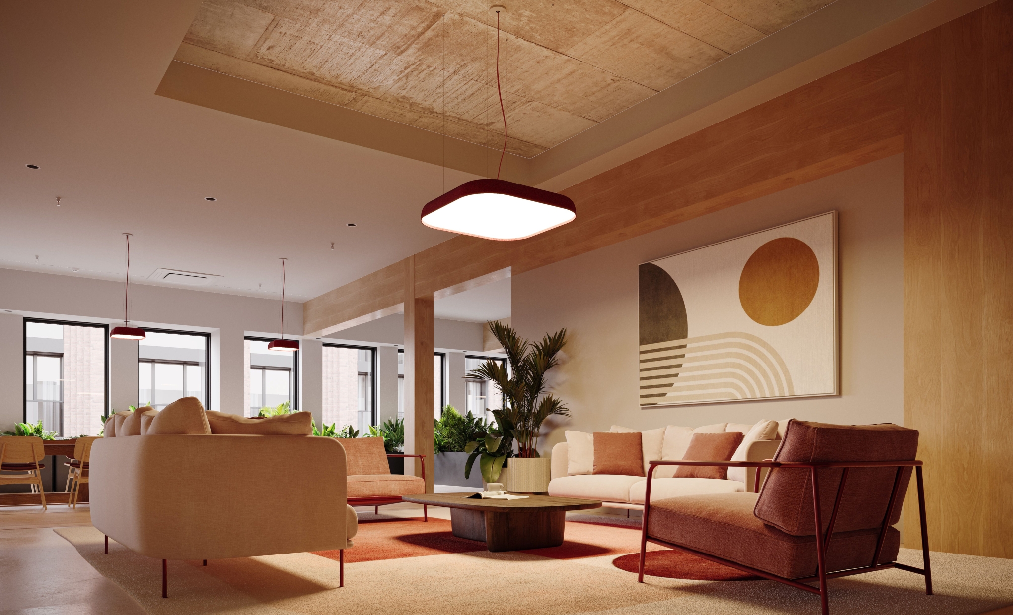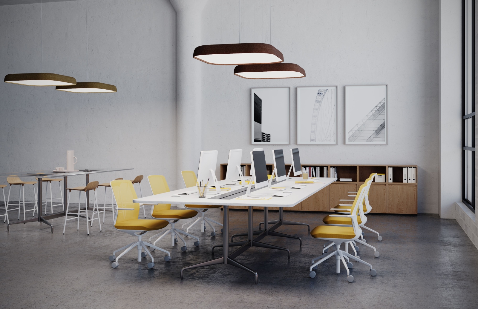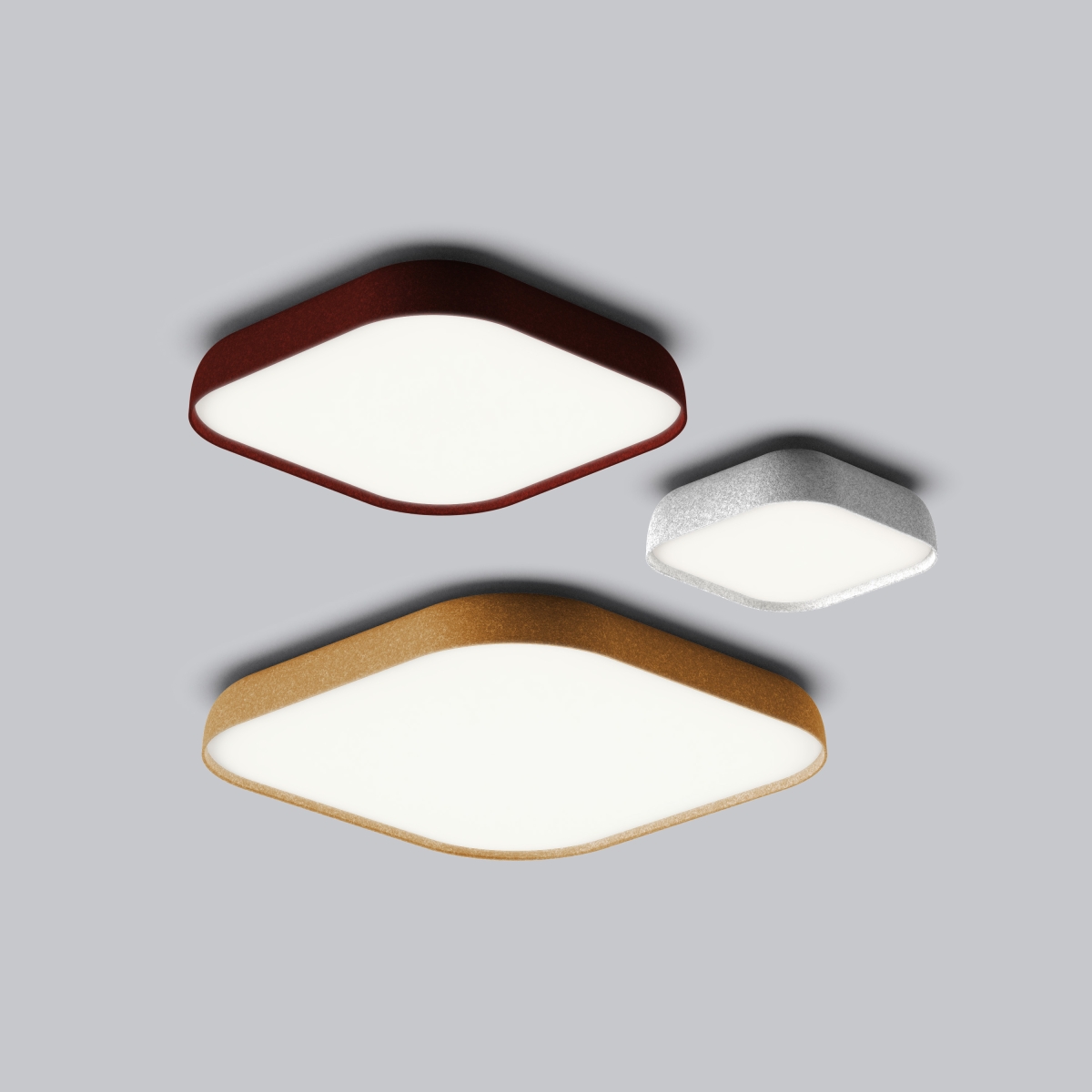 Cirra luminaire is square, with soft, rounded edges, creating a unique shape that adds a welcoming feel to modern spaces. Clean lines and hidden hardware contribute to a seamless, refined aesthetic. In 15", 24", or 35" diameters, Cirra is offered as a cable mount pendant or surface mount; the smaller 15" version may also be selected with a pendant stem mount. The luminaire is 4.2" in height, contributing to a minimalist look and feel, regardless of size. Cirra’s outer form is synthetic felt composed of 50% (by weight) recycled polyethylene (PET) felt, which helps to reduce ambient sound and comes in 24 different color options. A thermoformed acrylic diffuser reduces glare, creating soft, direct illumination. The 35" version of Cirra delivers more than 16,000 lumens of direct, low-glare, lighting that is powerful yet comfortable.