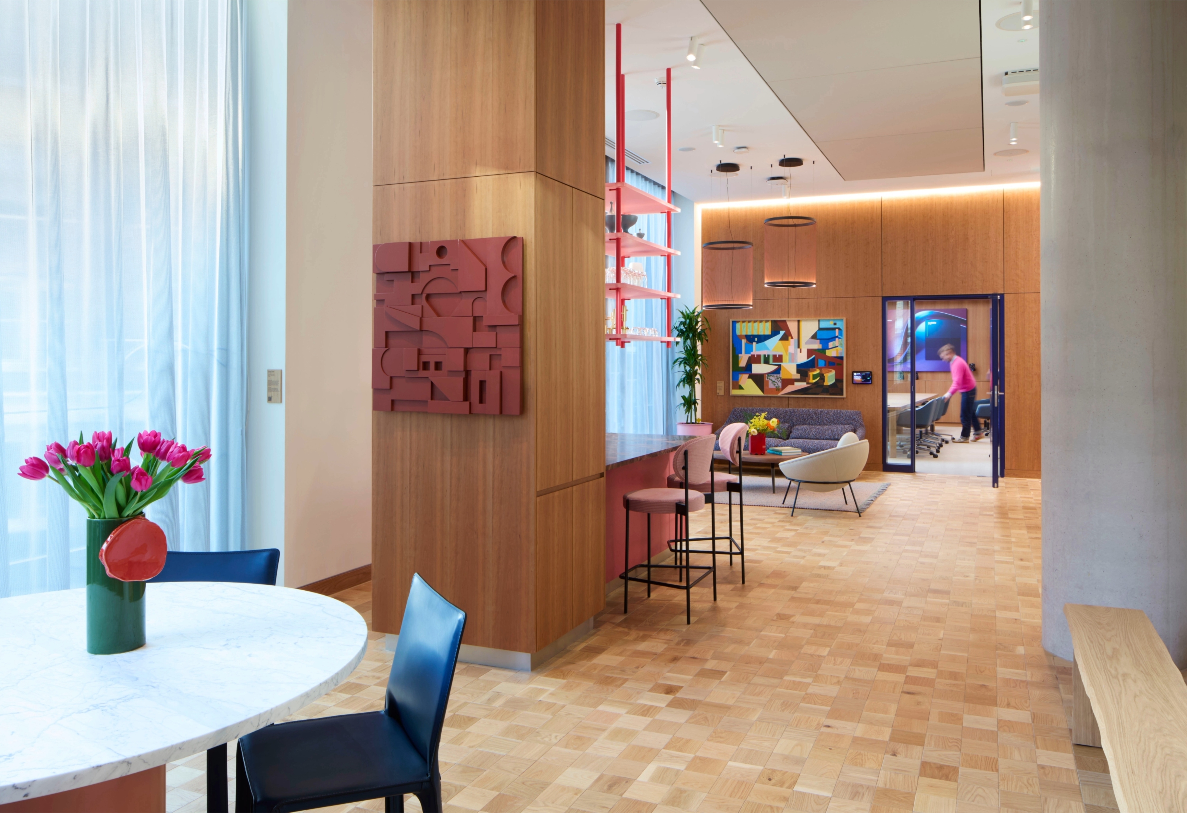 In The Executive Briefing Centre, the lighting reflects a shift in character to a chic, residential-style space. Cove lighting washes the timber verticals, adding depth and warmth, while pendants above soft seating create intimacy. Meeting rooms feature tuneable white technology and high colour rendering, creating ideal conditions that users can tailor via a control system.