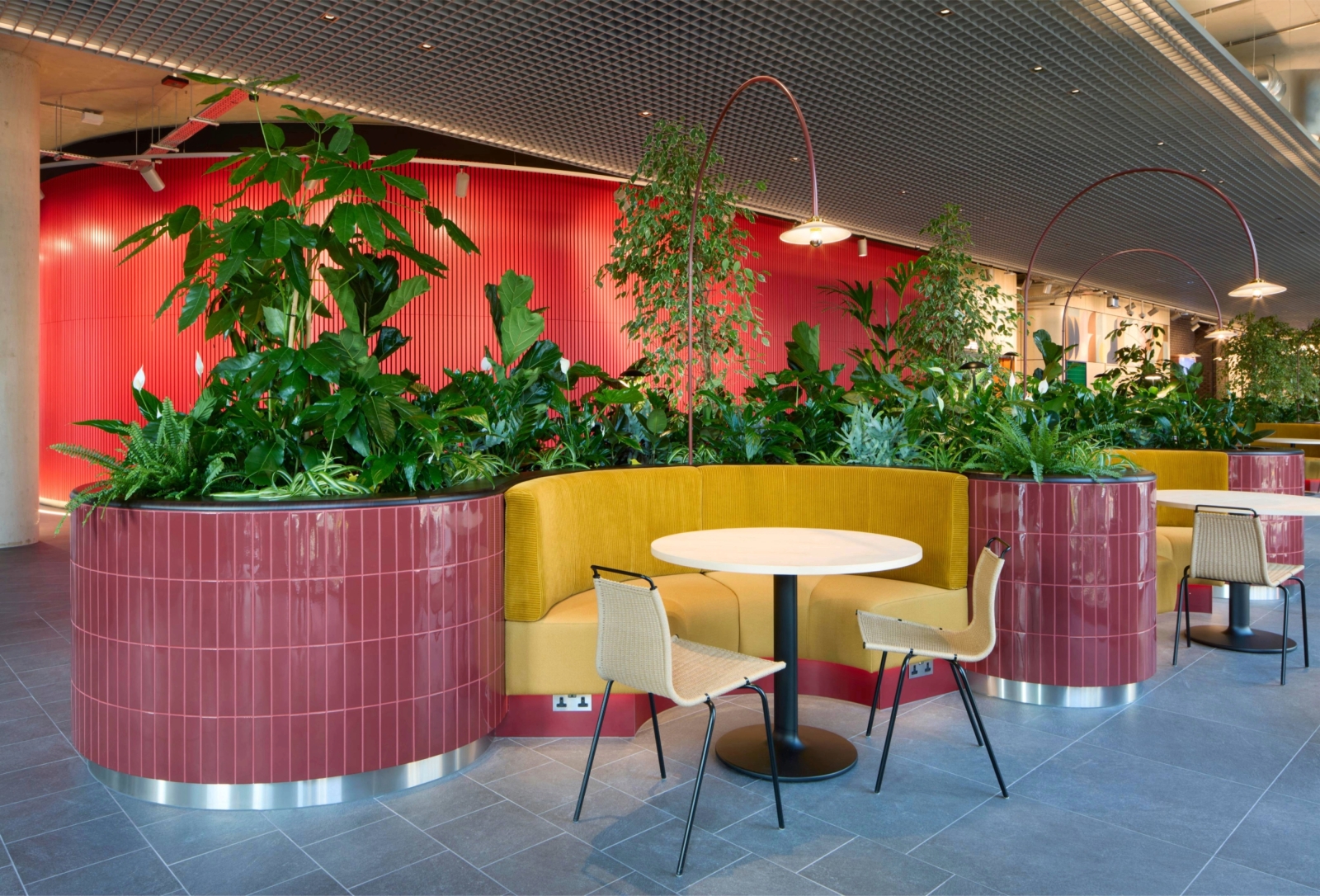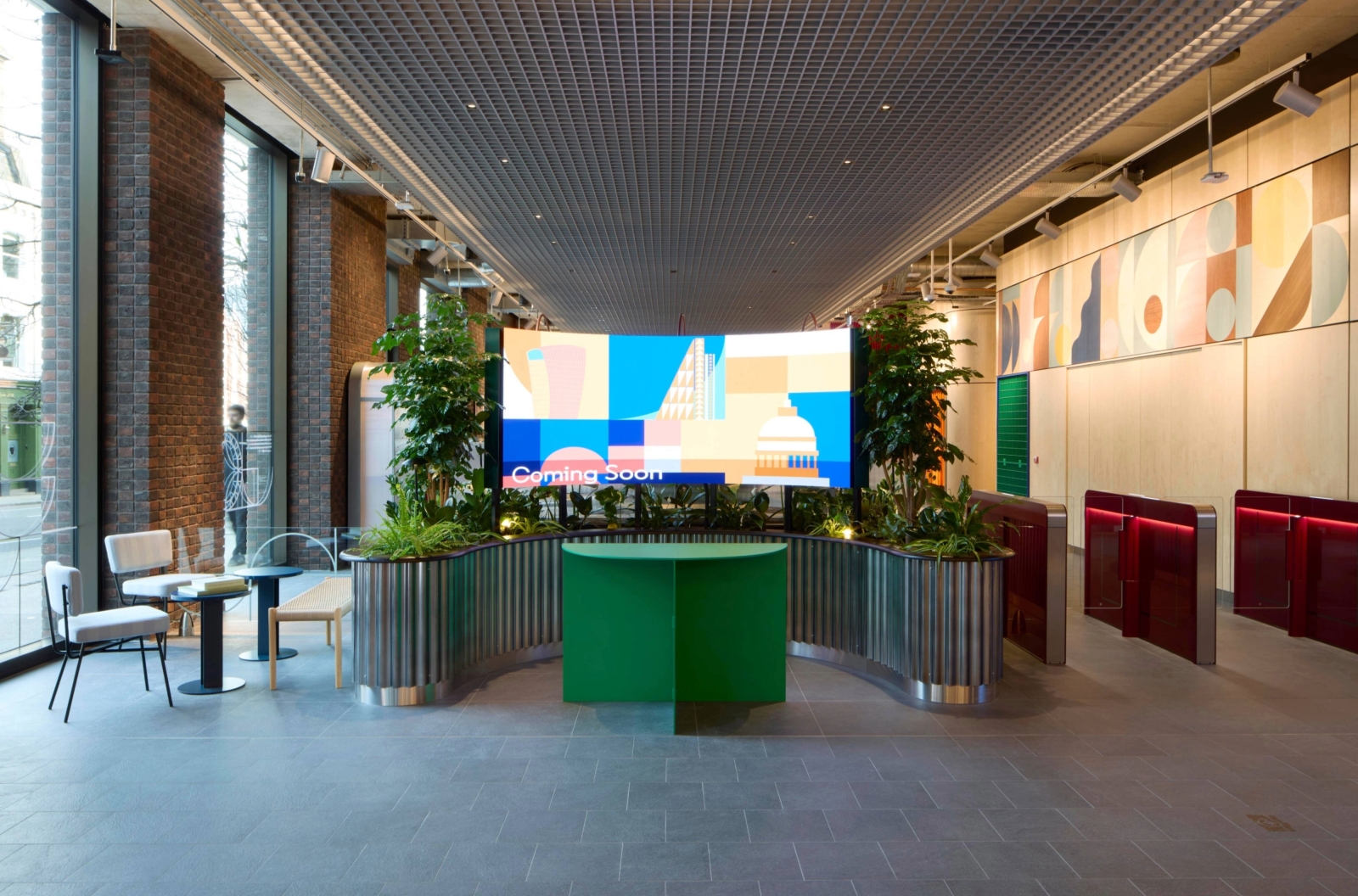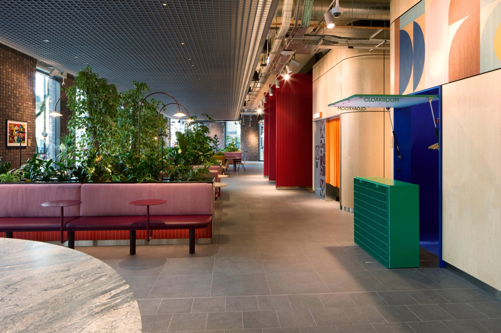 The Arcade is a lively ‘street’ with meeting spots, lush planting, and playful design elements. Lighting accentuates artwork, exposed brickwork, greenery, and the bold exterior of The Theatre. A perforated raft ceiling features lighting details that add drama and ambient illumination, while decorative lamps, paired with joinery lighting, create intrigue.