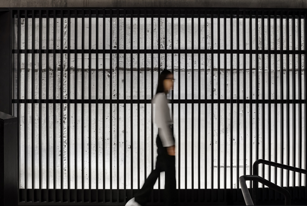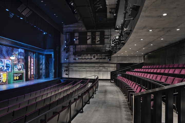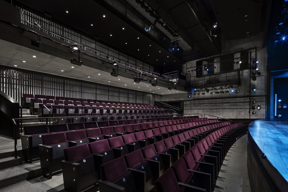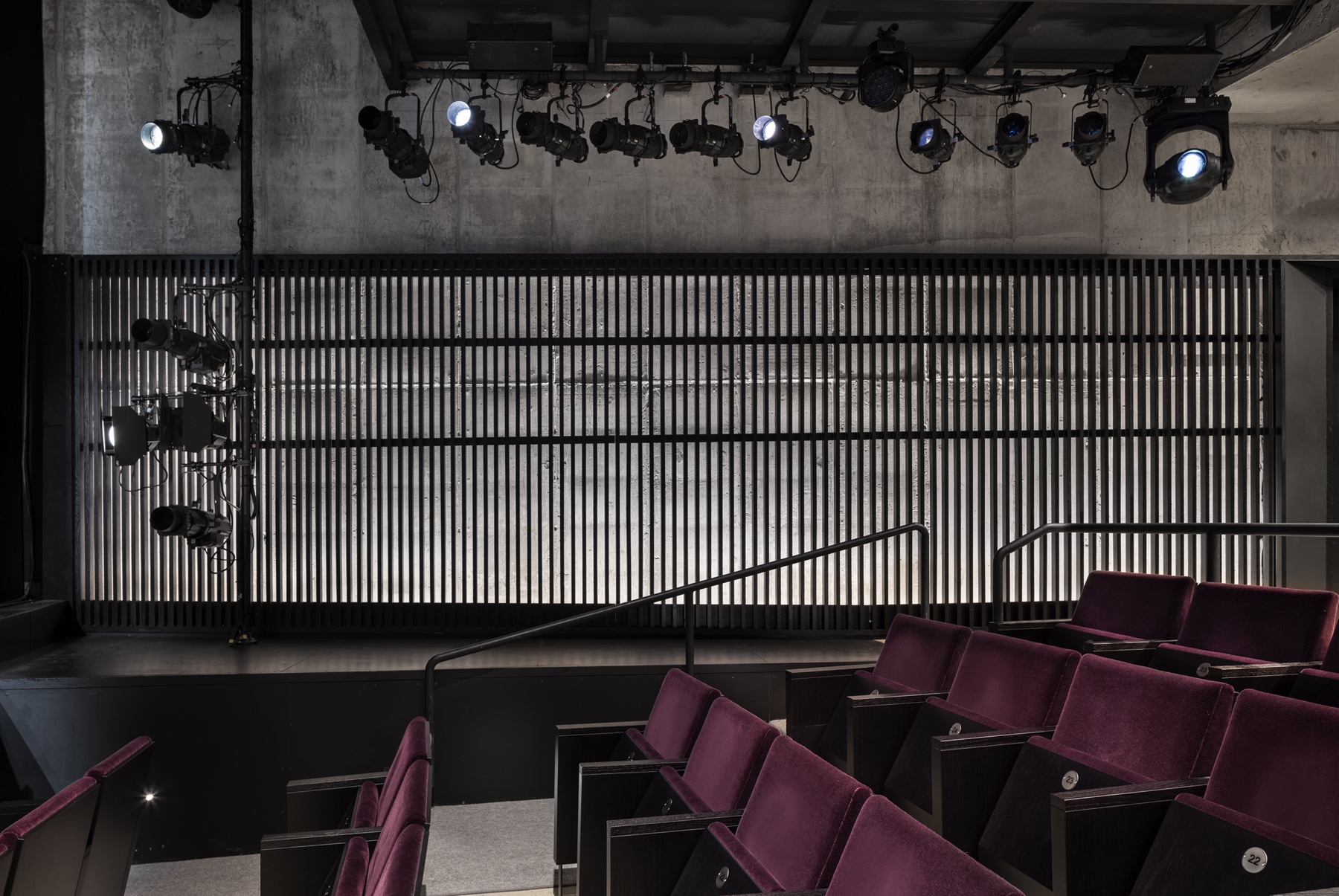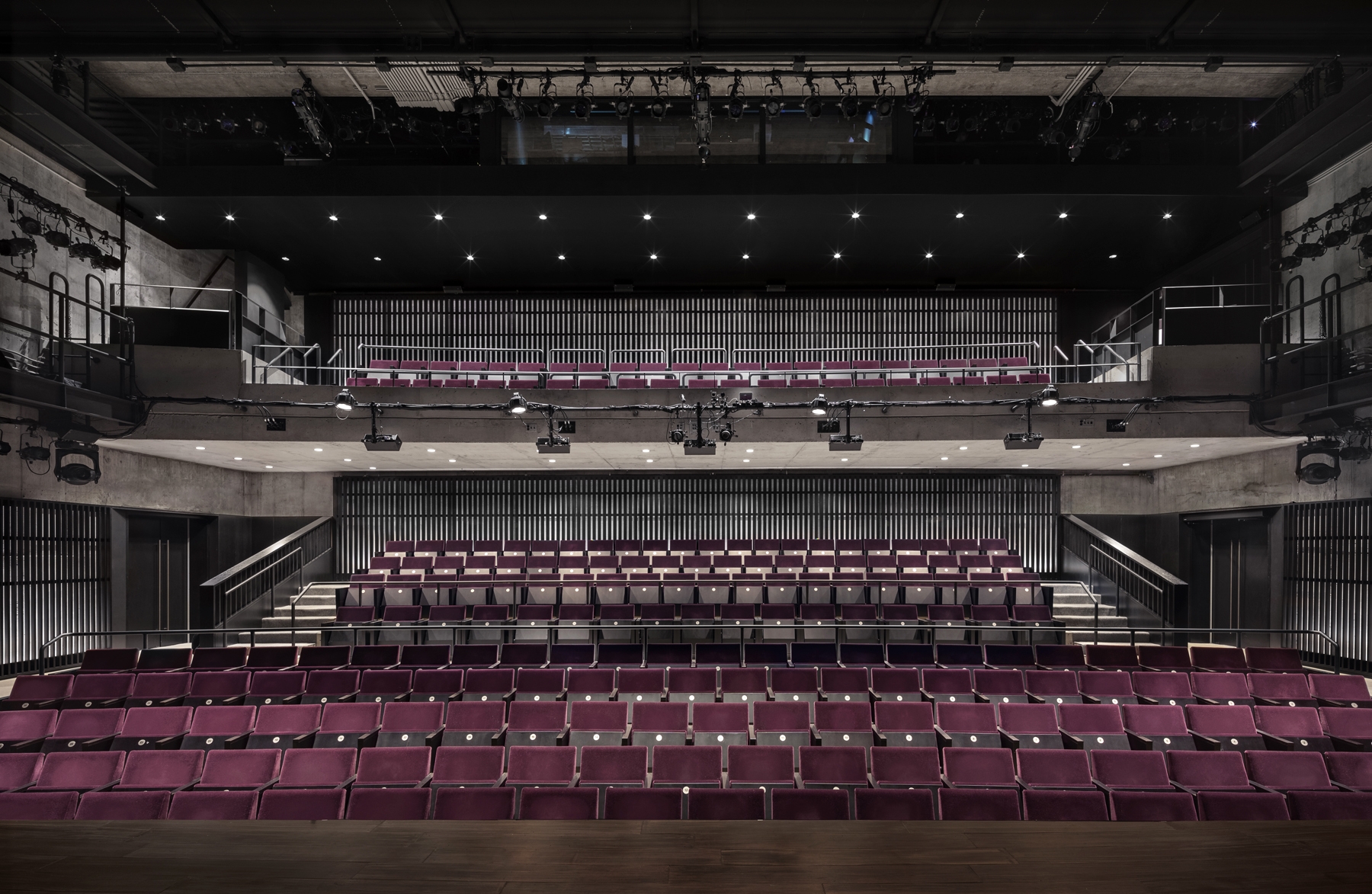 The main theater continues the dialog between materials. The unfinished concrete box is outfitted with painted wood perimeter screens. Lit from behind by concealed wall grazers, the concrete is visible and celebrated, yet softened by the silhouetted screens.