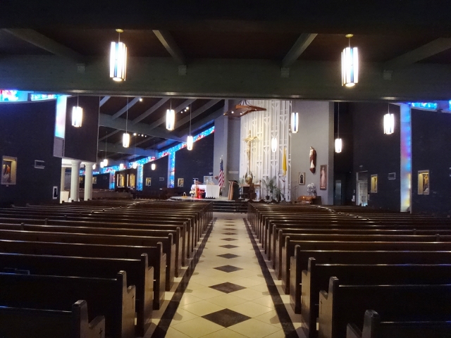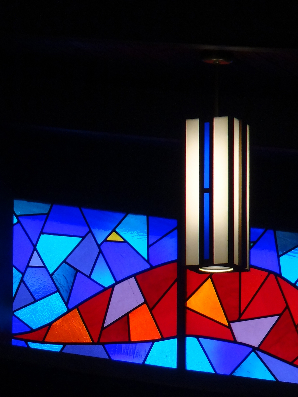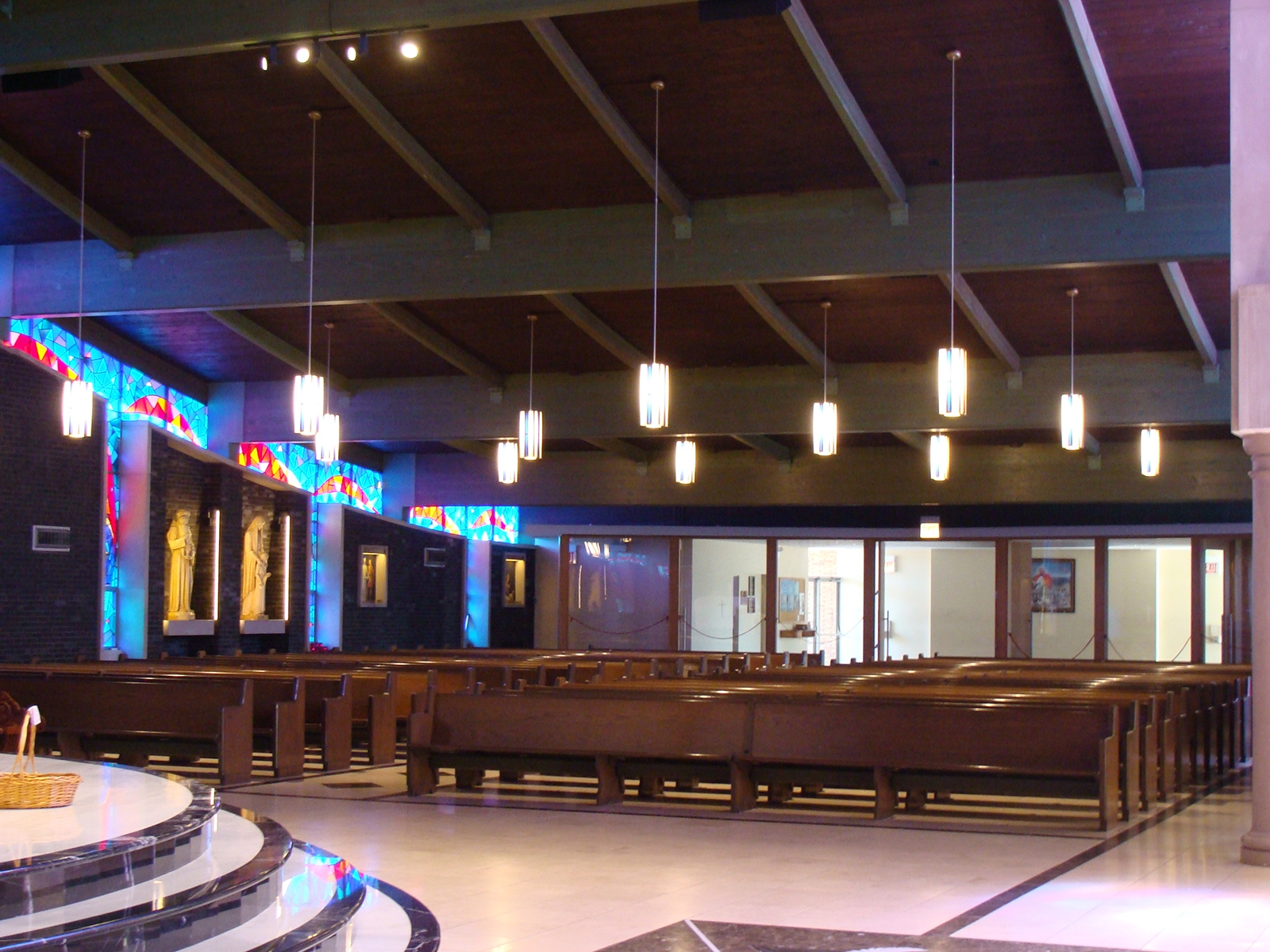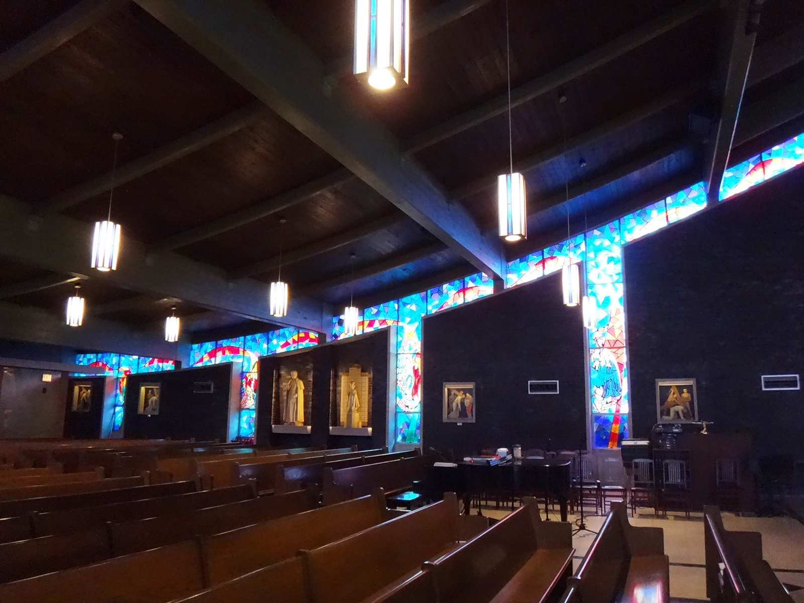 Entry DescriptionLighting was the final step in the renovation of a church built in 1964. The space is shaped like a “V” that is 49m from end to end, with a central altar. The ceiling is vaulted from 4.2m at both ends to 12.5m in the center. The space also includes stained glass, dark brick walls, and a dark green exposed wooden beam ceiling. Stewardship is achieved through the use of efficient technology and understanding of client needs. All custom luminaires used on this project are LED’s, designed to last 60,000 hours to L70. This energy saving design reduced energy consumption by 90%, from 35,280W to just 3,600W, and consumes only 1.49 W/per square meter, 1/3 the IECC limit. The new design delivers a uniform 430 lux in the seating areas. In addition, by pre-programming scenes based on client needs, all the lights in the church will no longer be on when only one part of the church is being used. Design goals addressed a more welcoming environment, visibility, glare, aesthetics, energy efficiency, controls, multiple uses, and maintenance. Custom designed pendants, task lighting, accent lighting and control system resulted in a more beautiful, functional, and energy efficient space.