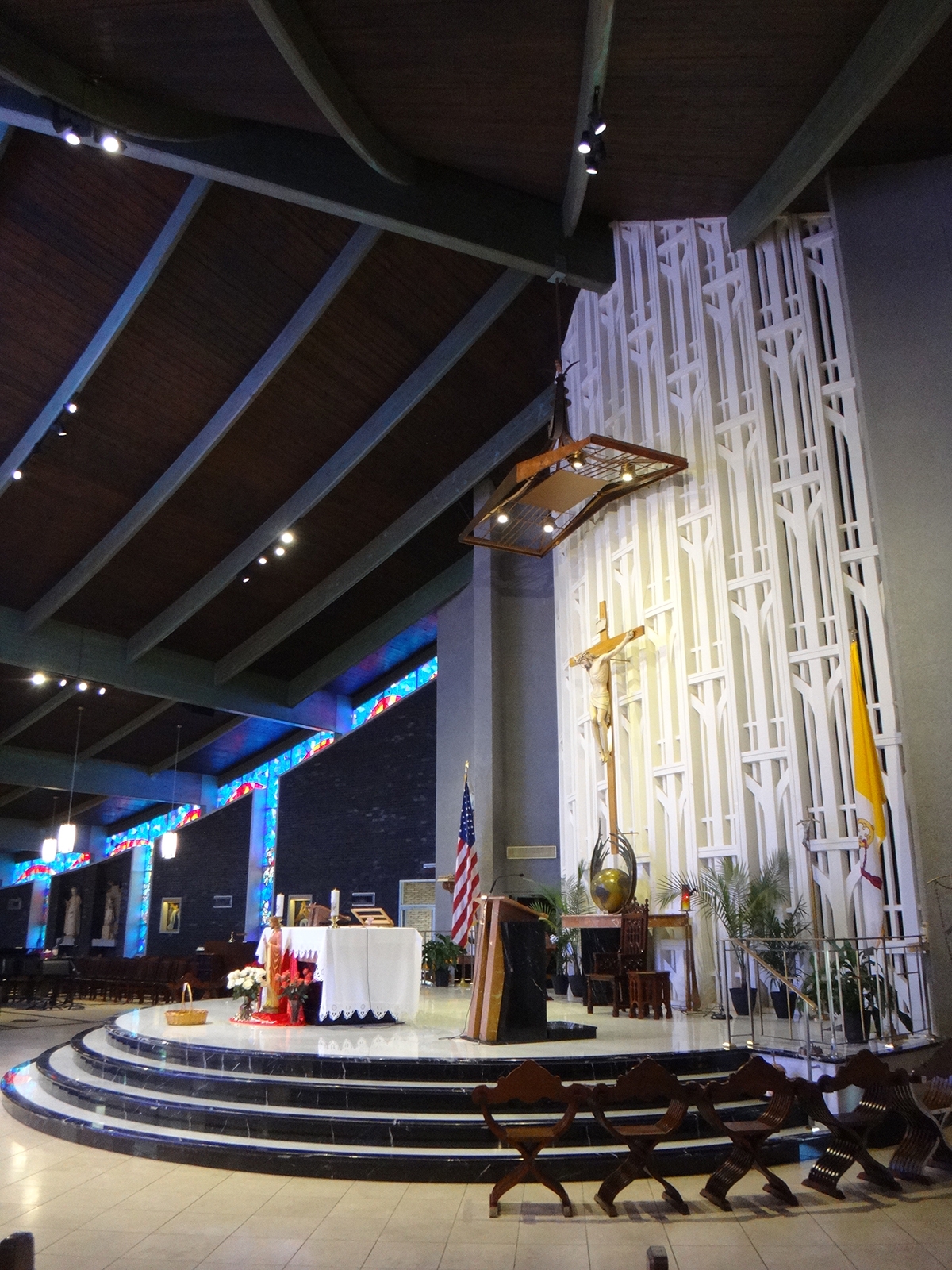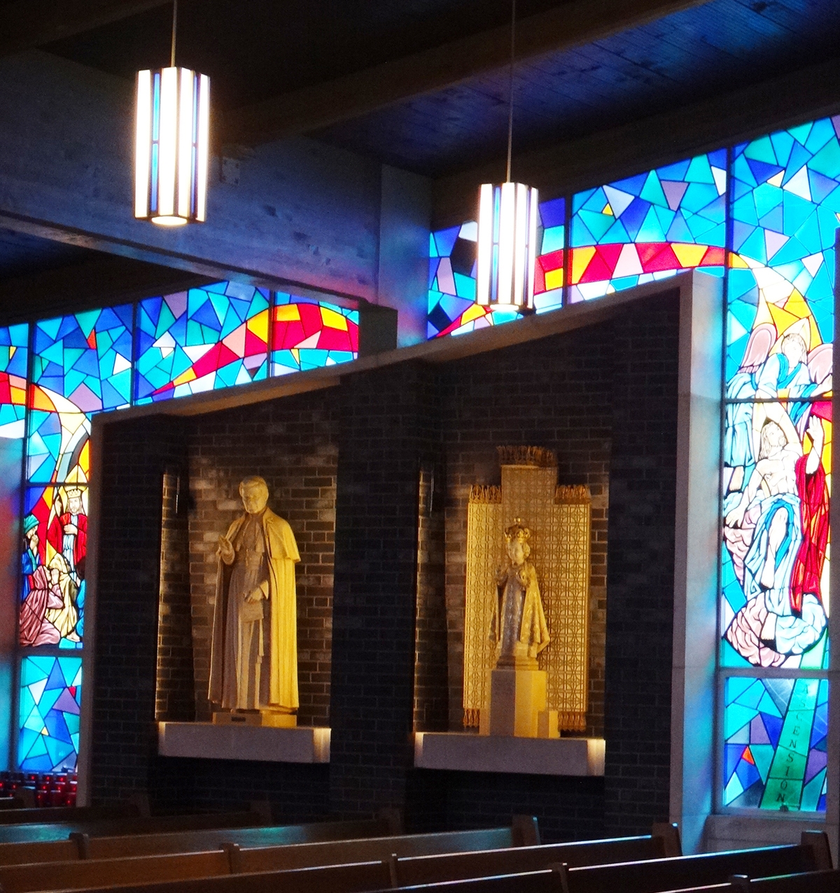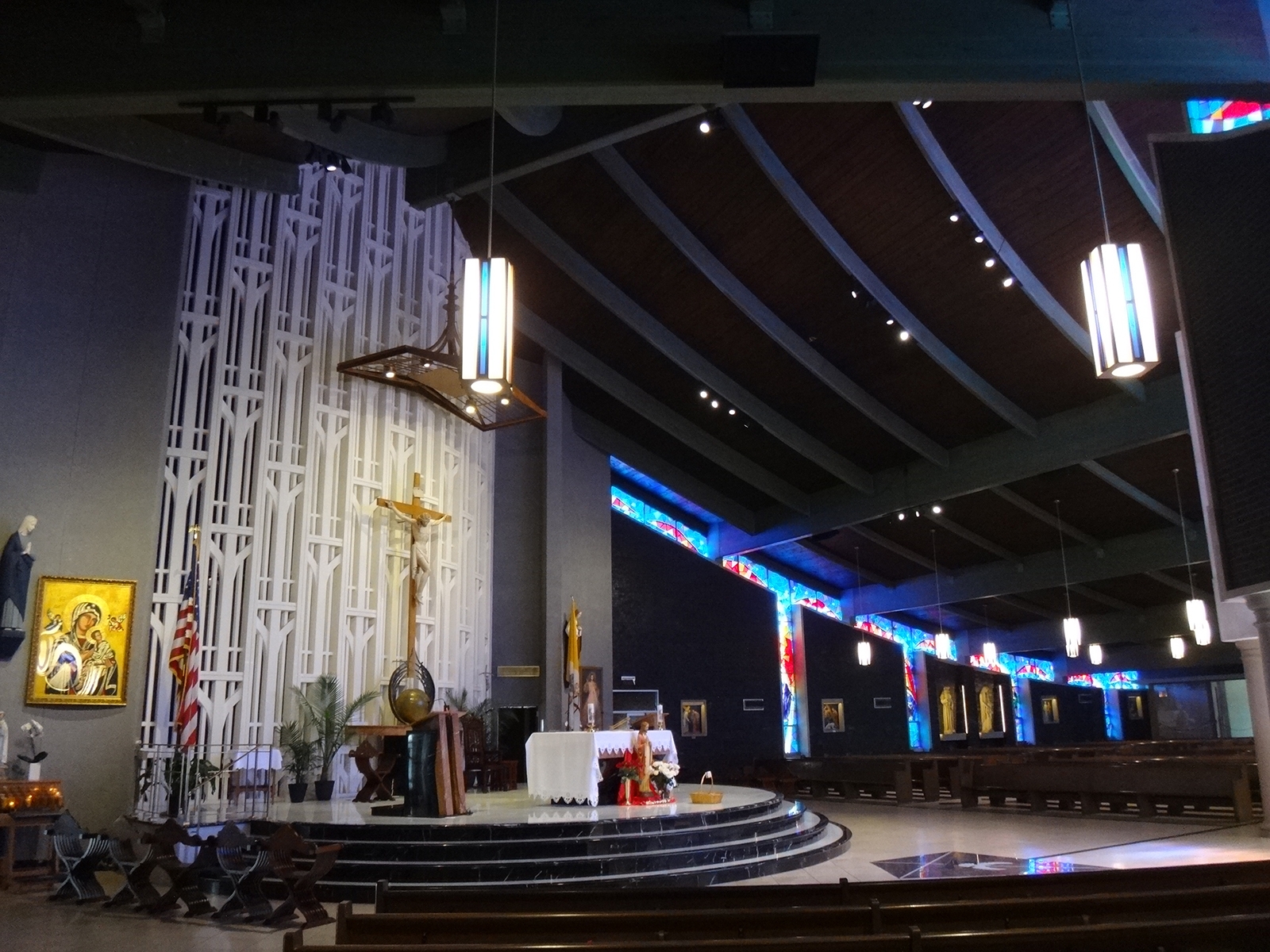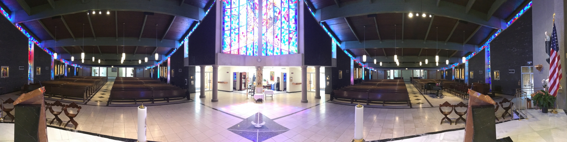 Entry DescriptionLighting was the final step in the renovation of a church built in 1964. The space is shaped like a “V” that is 49m from end to end, with a central altar. The ceiling is vaulted from 4.2m at both ends to 12.5m in the center. The space also includes stained glass, dark brick walls, and a dark green exposed wooden beam ceiling. Stewardship is achieved through the use of efficient technology and understanding of client needs. All custom luminaires used on this project are LED’s, designed to last 60,000 hours to L70. This energy saving design reduced energy consumption by 90%, from 35,280W to just 3,600W, and consumes only 1.49 W/per square meter, 1/3 the IECC limit. The new design delivers a uniform 430 lux in the seating areas. In addition, by pre-programming scenes based on client needs, all the lights in the church will no longer be on when only one part of the church is being used. Design goals addressed a more welcoming environment, visibility, glare, aesthetics, energy efficiency, controls, multiple uses, and maintenance. Custom designed pendants, task lighting, accent lighting and control system resulted in a more beautiful, functional, and energy efficient space.