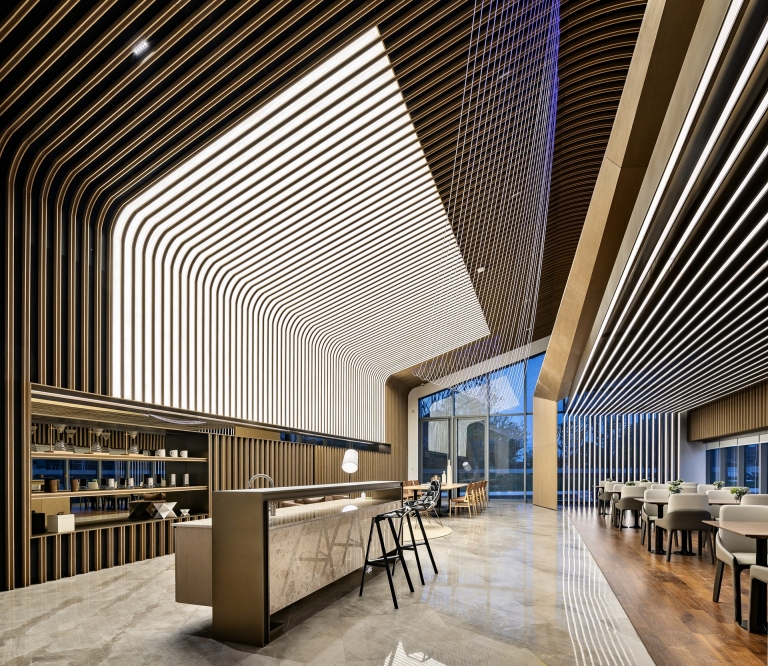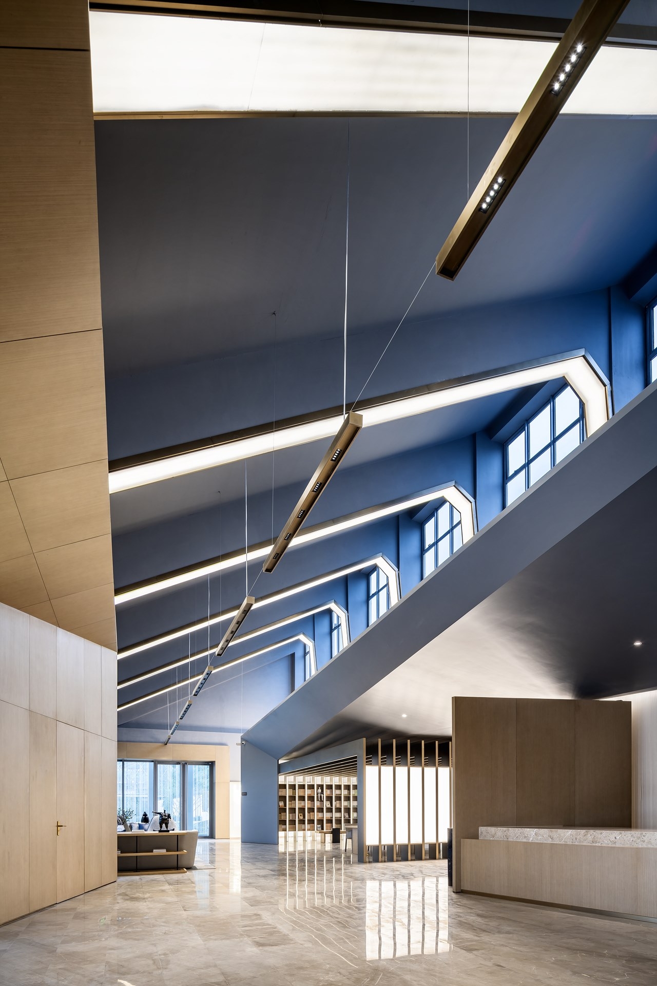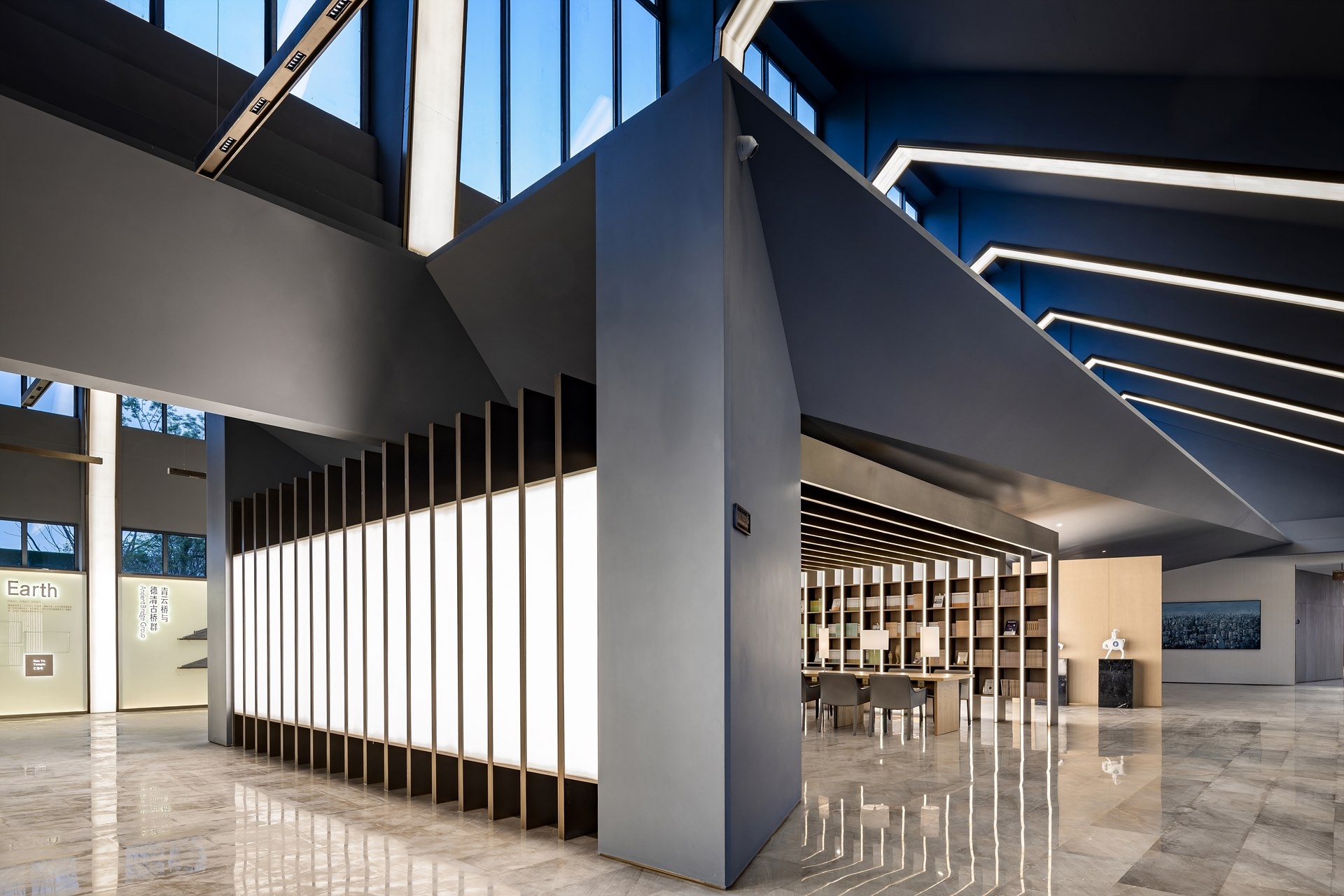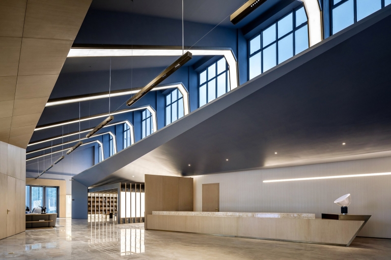 The roof of the art gallery continues the historical elements. The designer hopes to preserve the memory of its history and culture. He wants to translate the yarn elements of the textile machine into a modern design language, combined with the light to present the top and façade design of the space. The light formed from the yarn is related to the cultural context from ancient times to the present, and at the same time gives the space a modern simplicity and order aesthetics. It seems to tell the centuries-old textile culture of Leidian Town, and people and space can reunite with the times.