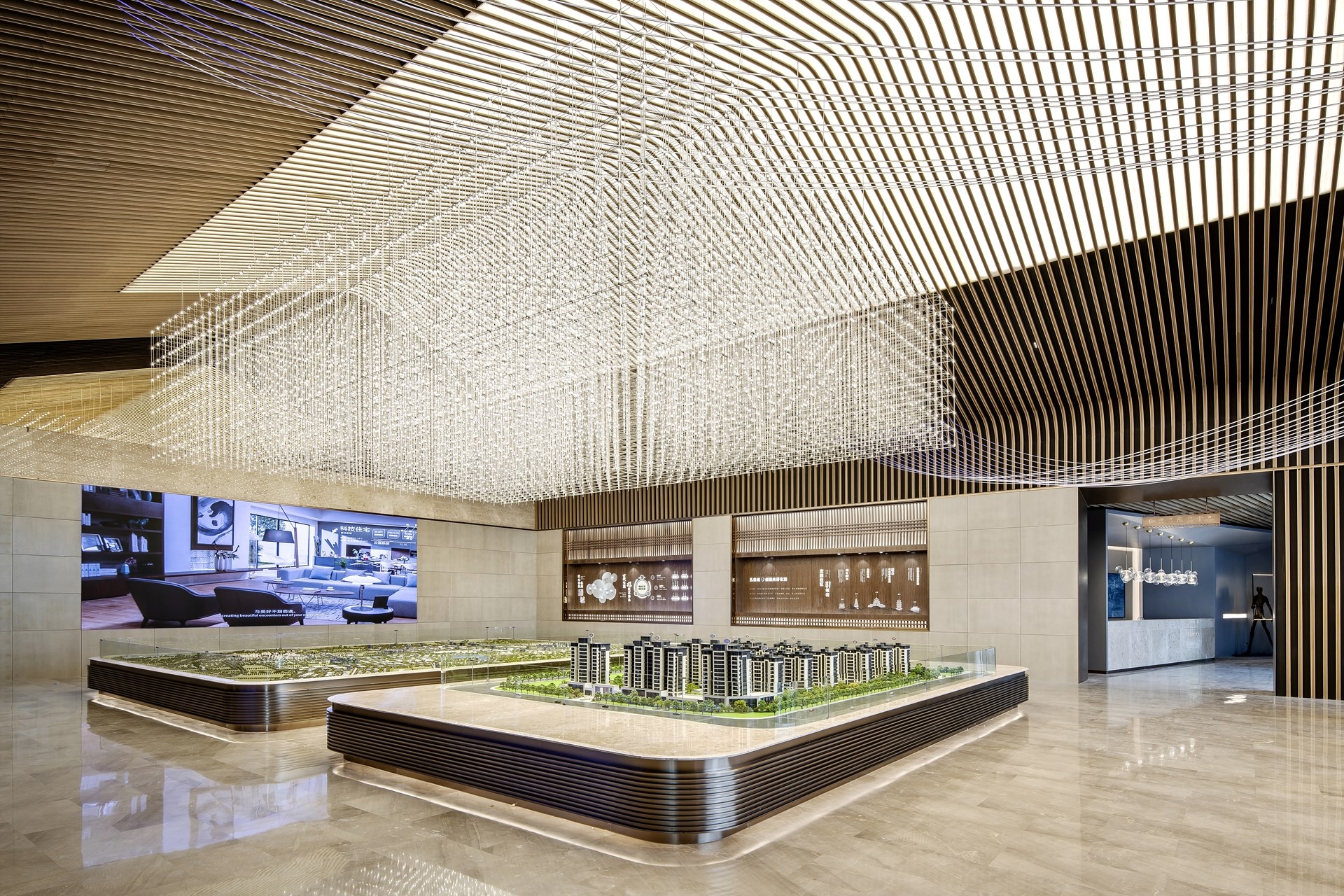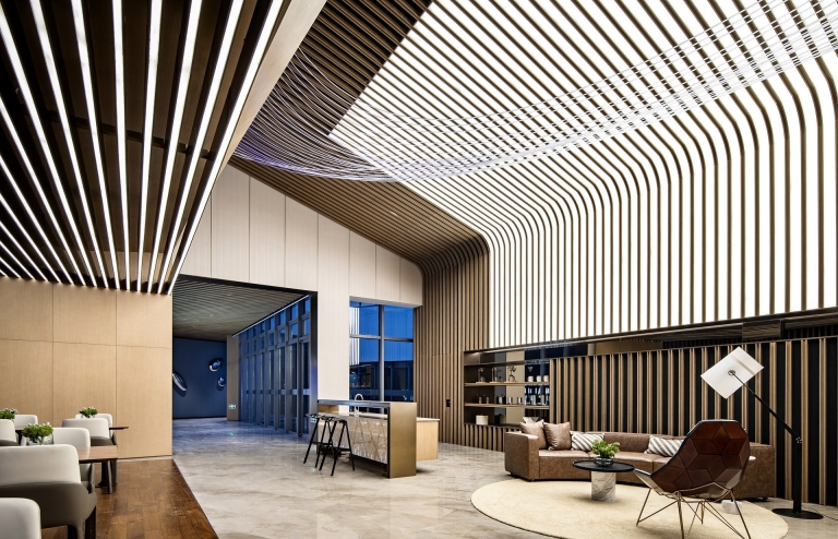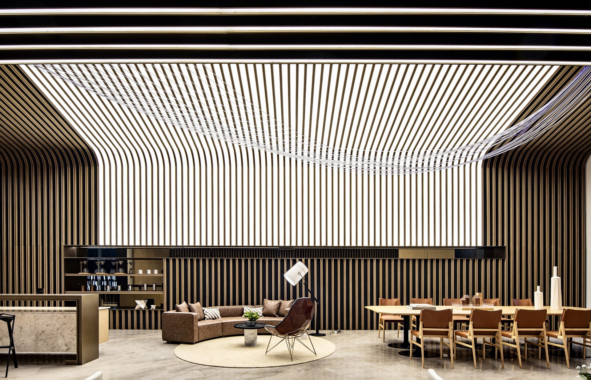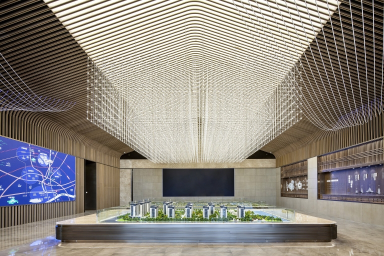 The roof of the art gallery continues the historical elements. The designer hopes to preserve the memory of its history and culture. He wants to translate the yarn elements of the textile machine into a modern design language, combined with the light to present the top and façade design of the space. The light formed from the yarn is related to the cultural context from ancient times to the present, and at the same time gives the space a modern simplicity and order aesthetics. It seems to tell the centuries-old textile culture of Leidian Town, and people and space can reunite with the times.