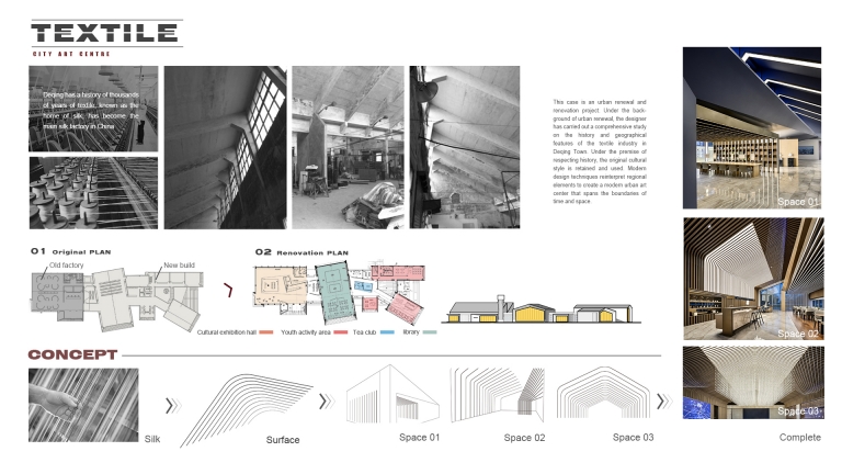 This case is an urban renewal and renovation project. Under the background of urban renewal, the designer has carried out a comprehensive study on the history and geographical features of the textile industry in Leidian Town. Under the premise of respecting history, the original cultural style is retained and used. Modern design techniques reinterpret regional elements to create a modern urban art center that spans the boundaries of time and space.