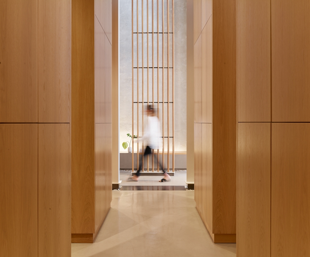 A bench runs the length of the waiting area, where detailed lighting illuminates the textured walls. Wood trellises separate the bench and procedure rooms while maintaining openness. Custom monopoints are integrated into trellis elements providing downlighting into the waiting and circulation areas.