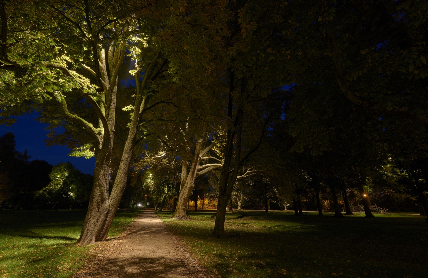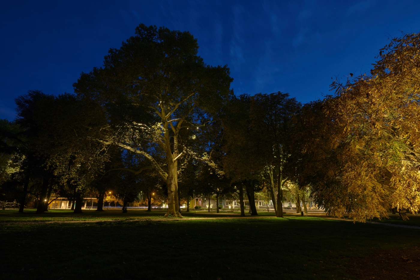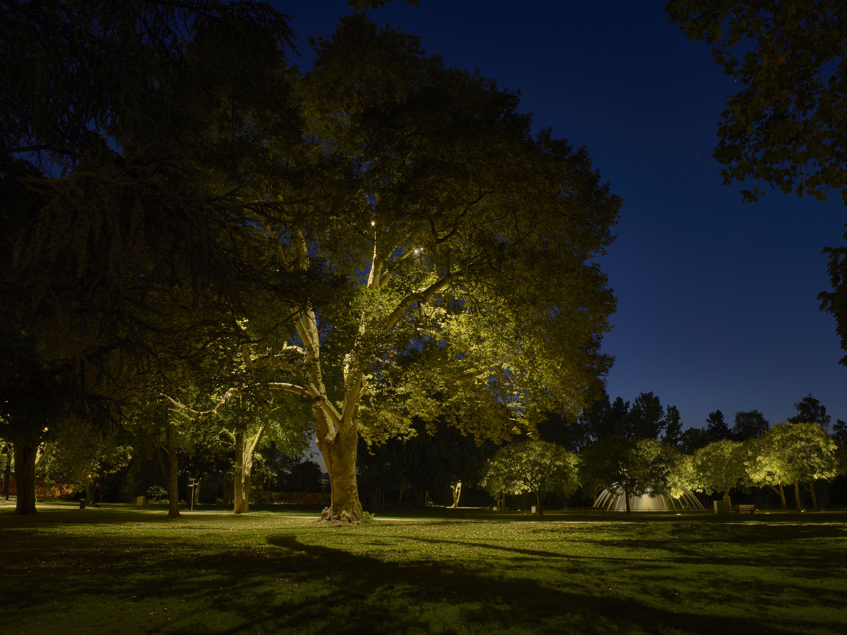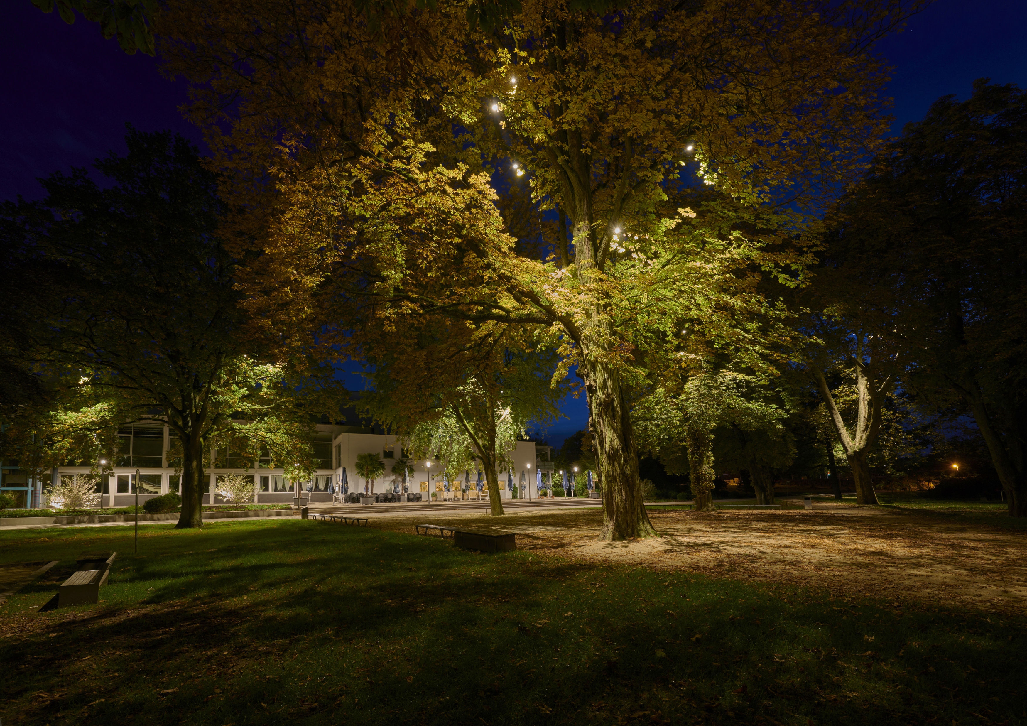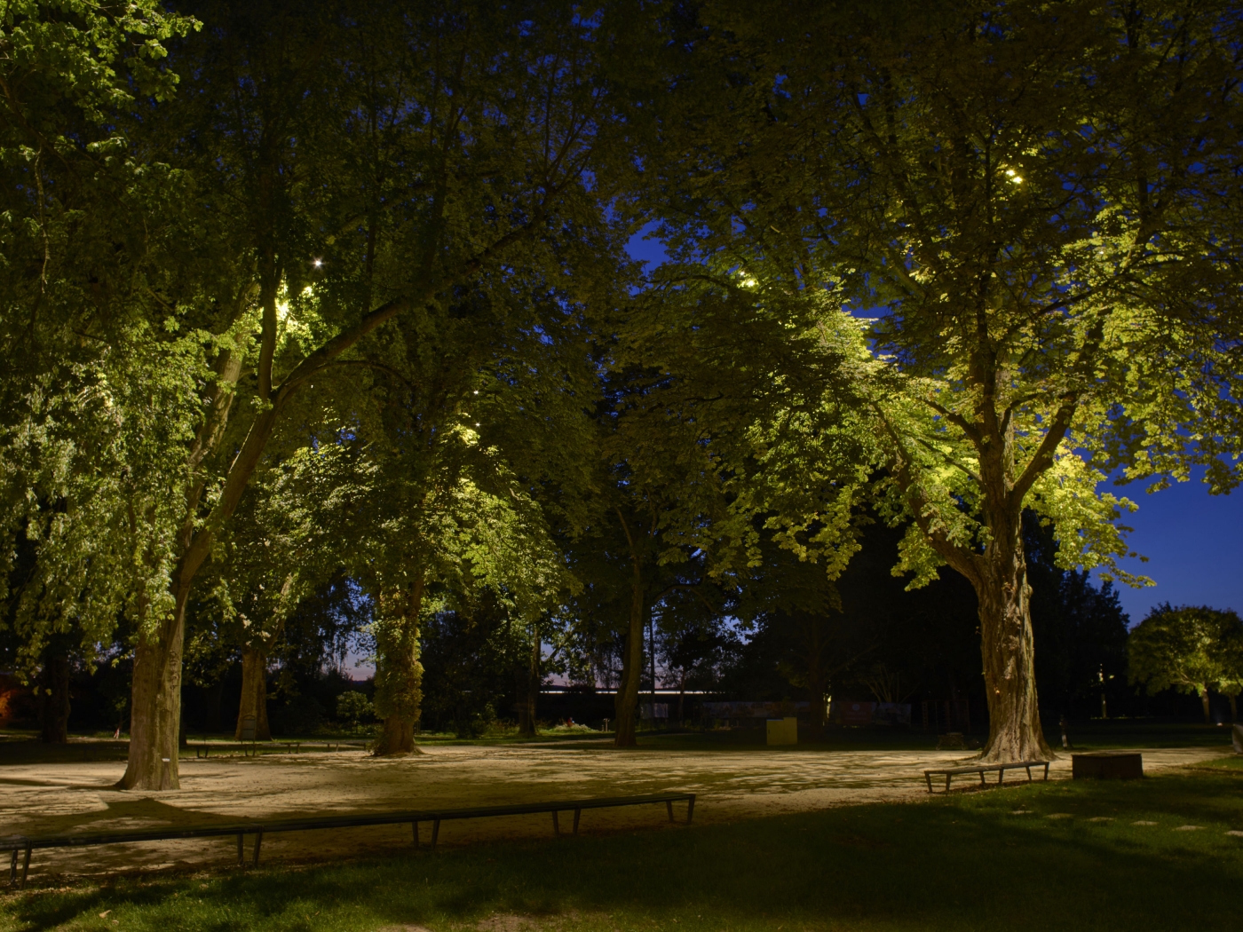 It was our intention to create a pleasant, poetic lighting mood for the city park. We use the beautiful tree population to let the light shine through it.