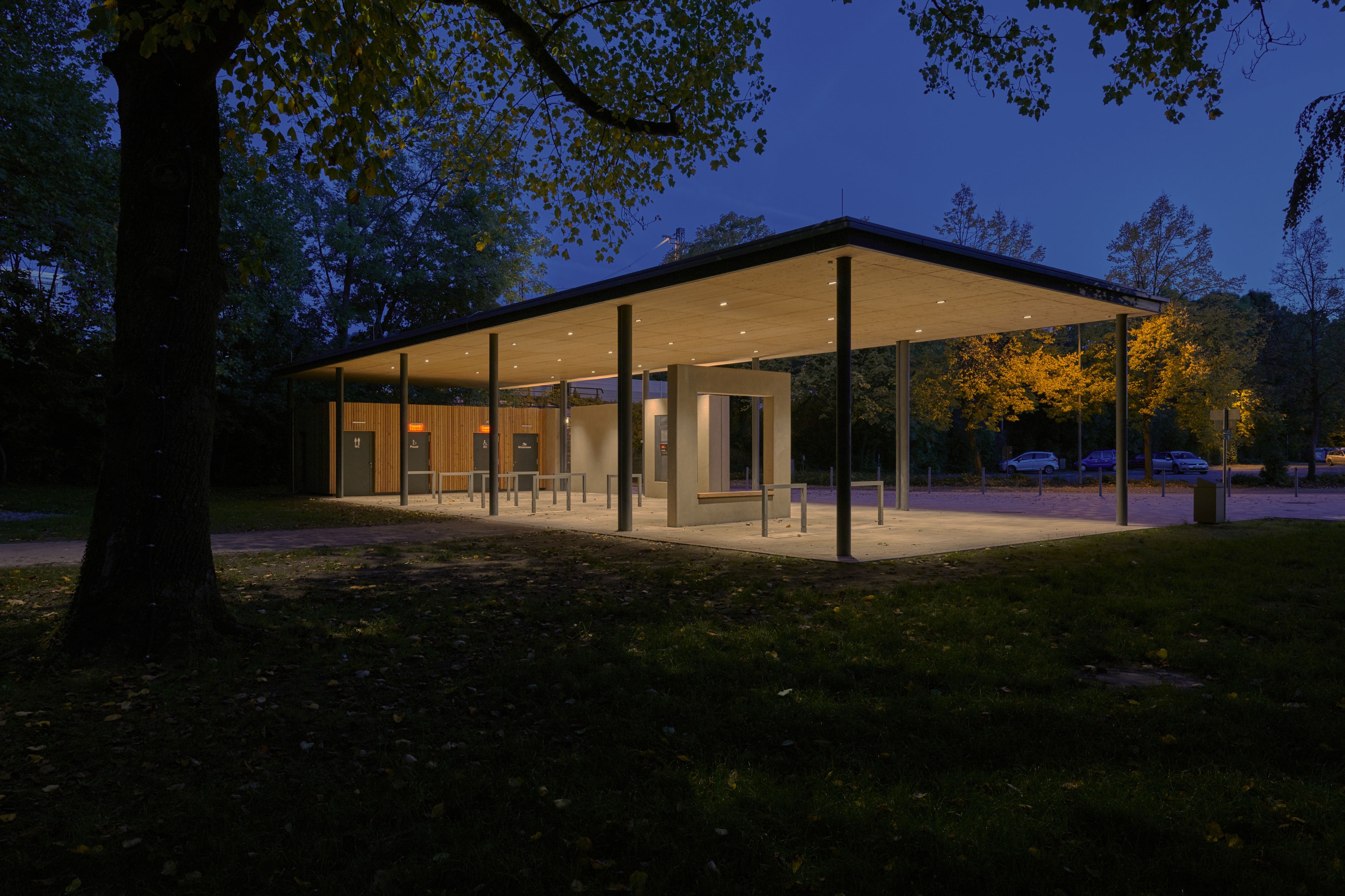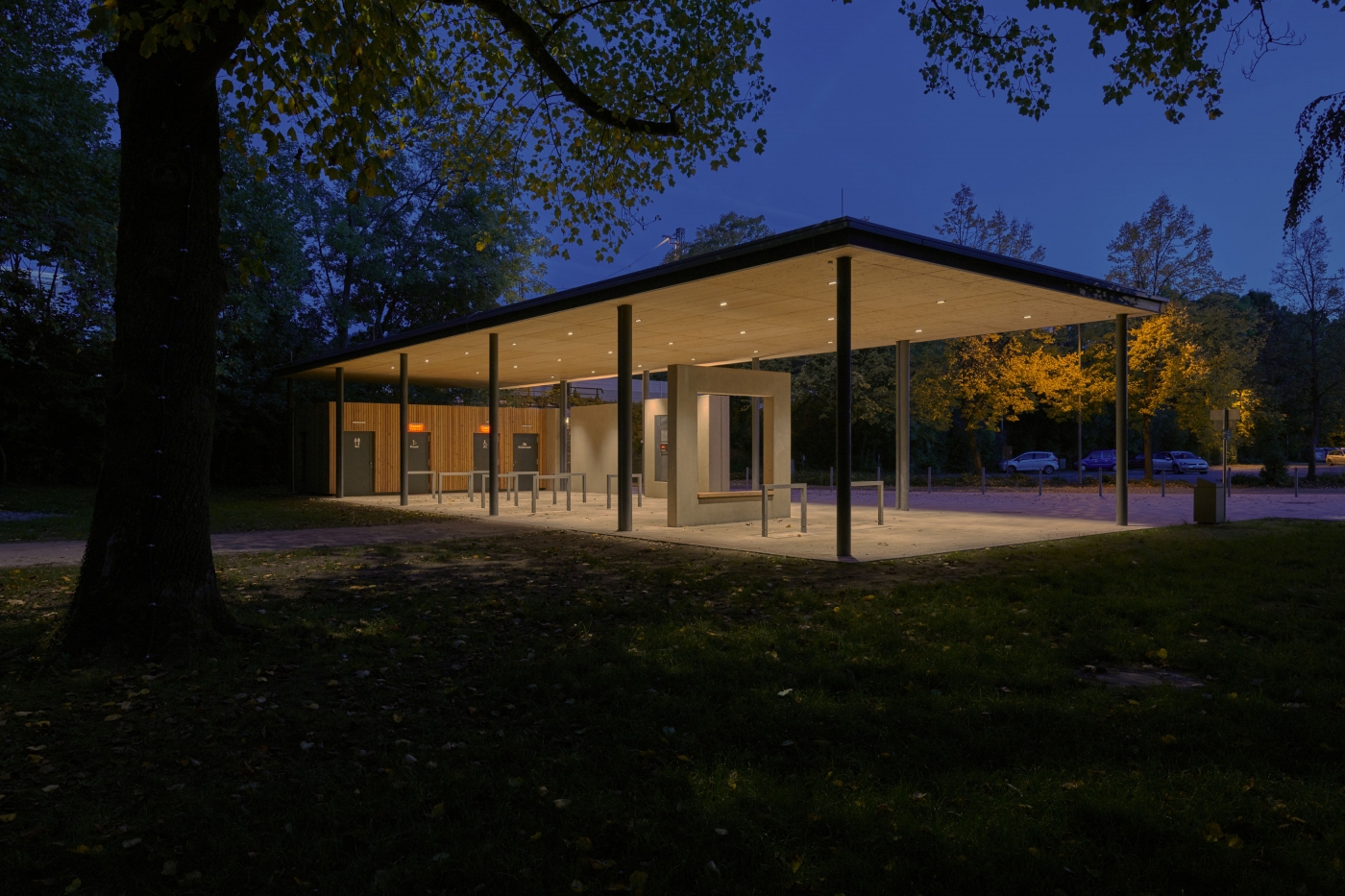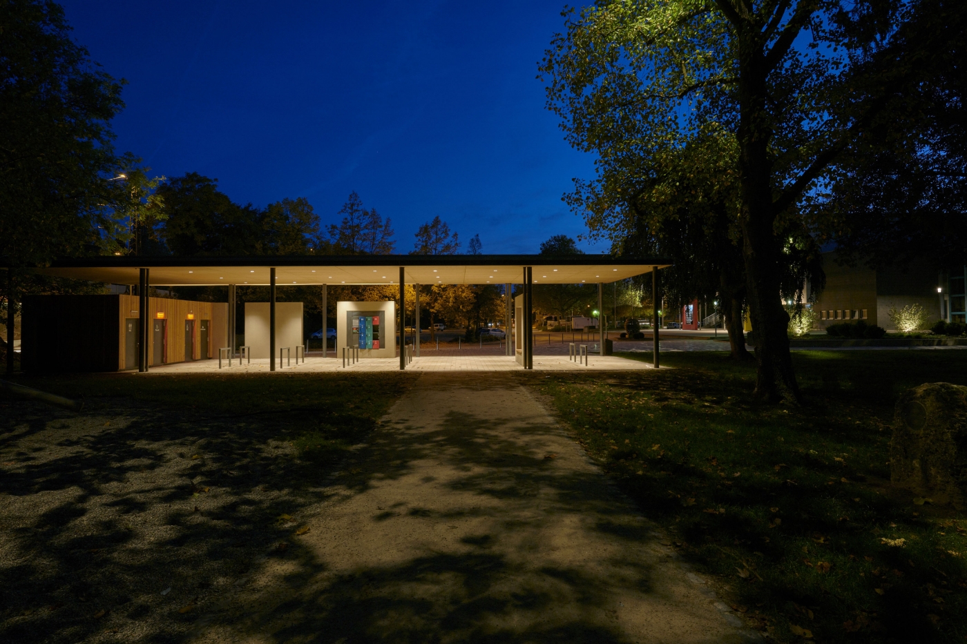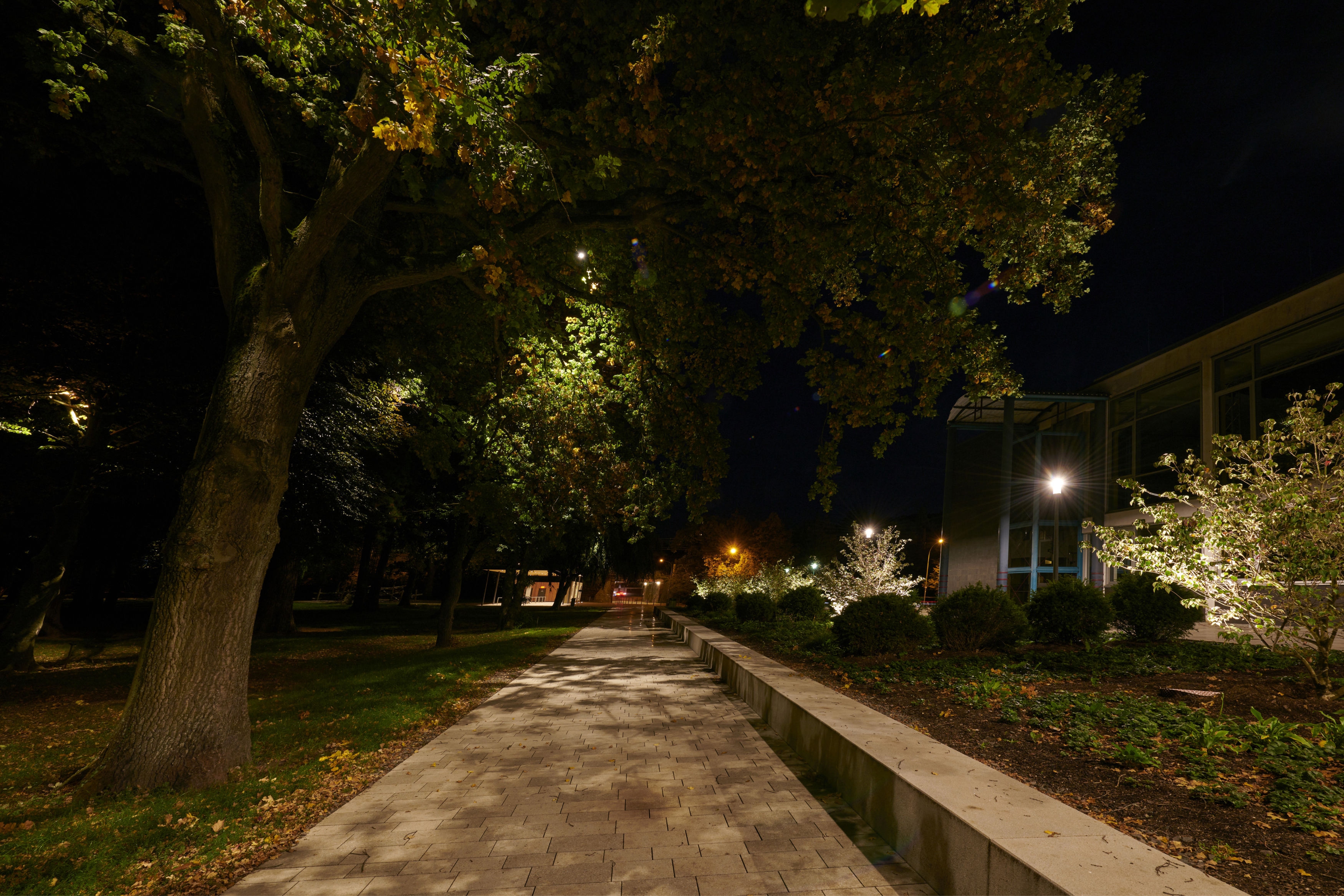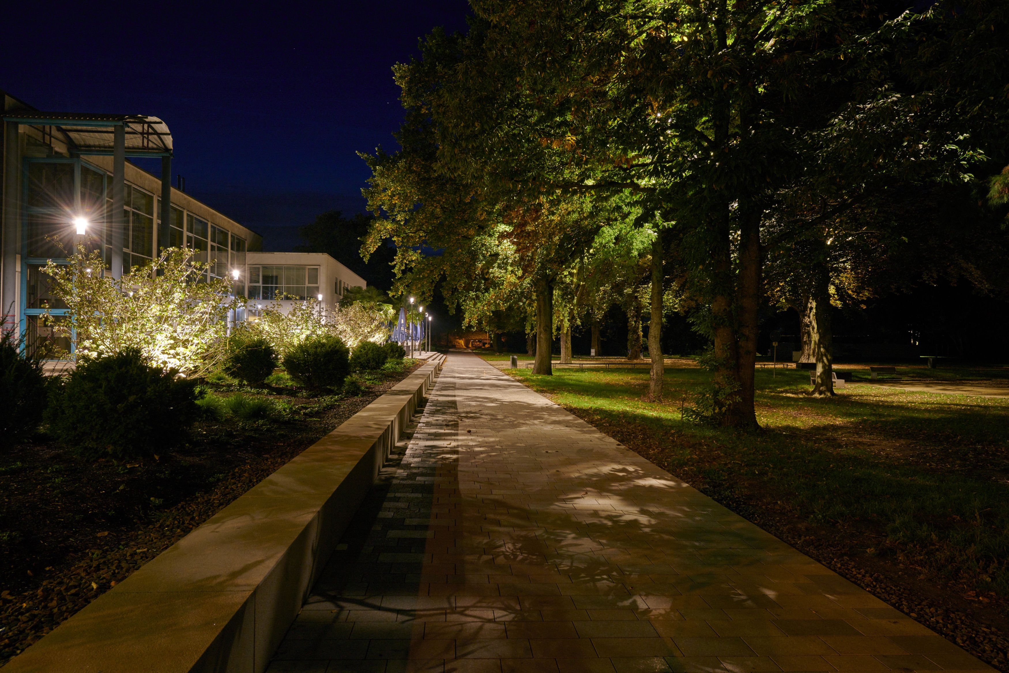 It was our intention to create a pleasant, poetic lighting mood for the city park. We use the beautiful tree population to let the light shine through it.