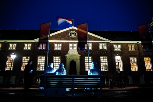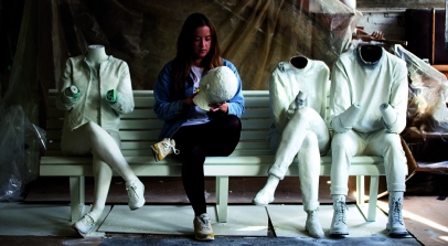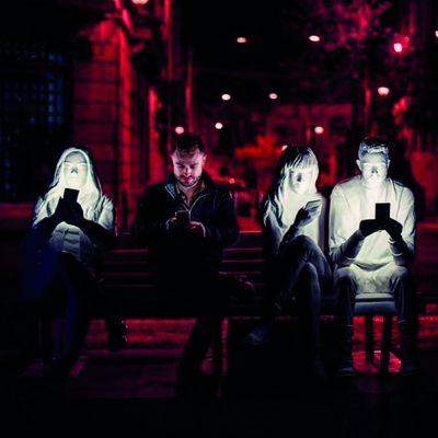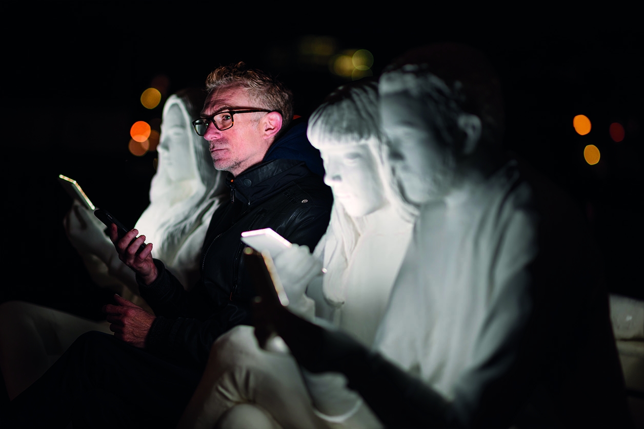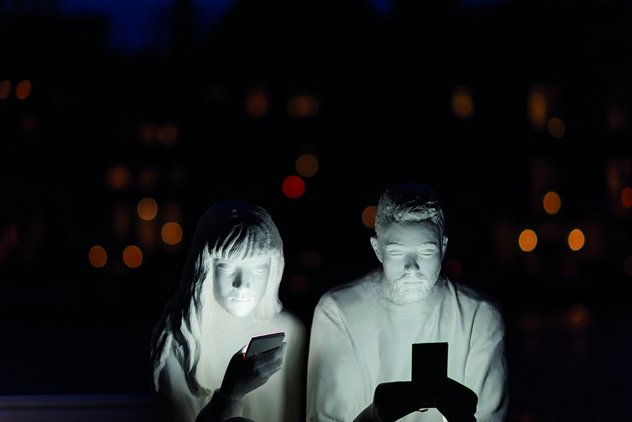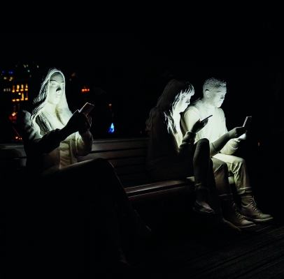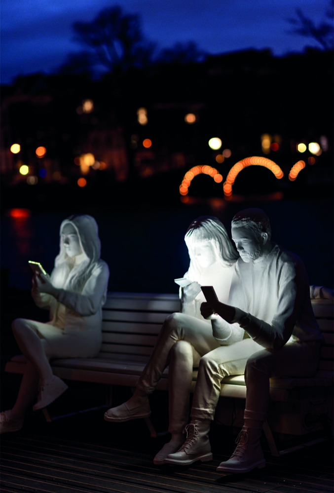 The installation itself sees 3 figures sitting next to each other on a bench, displaying the typical characteristics of smartphone users: heads bent, fingers typing and swiping, faces glowing in reflected light. While their bodies are physically present their minds are elsewhere. Like moths to a flame, we are drawn to the screens that illuminate our lives. Yet this light that brings us information also draws us away from the tangible world. It is a false beacon.