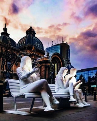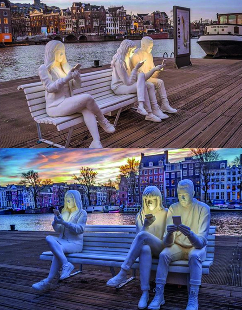 The sculpture aims to comment on how digital technology engrosses us and takes people away from reality. As a spectator, you too can join the narrative by taking up a position amongst the figures.