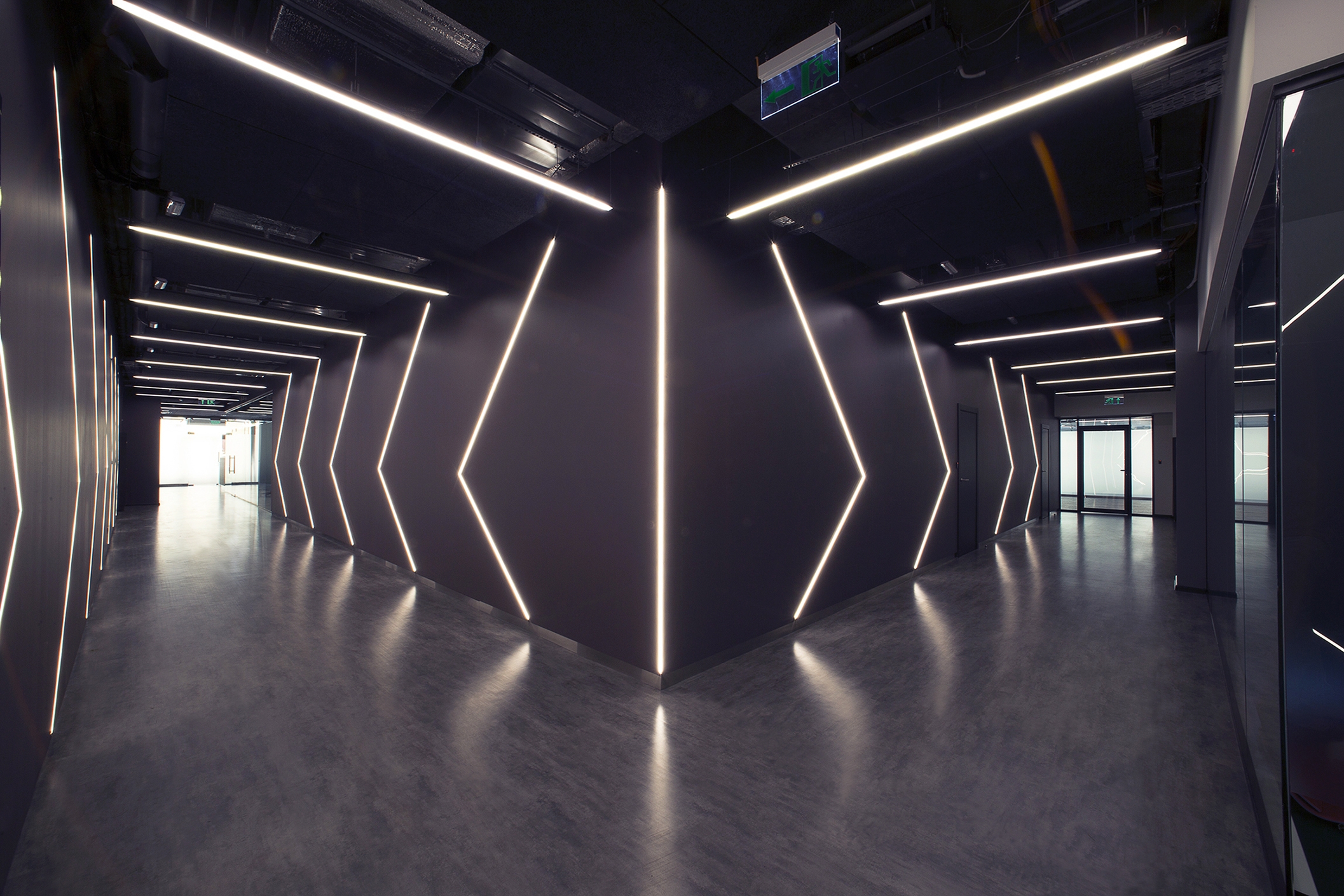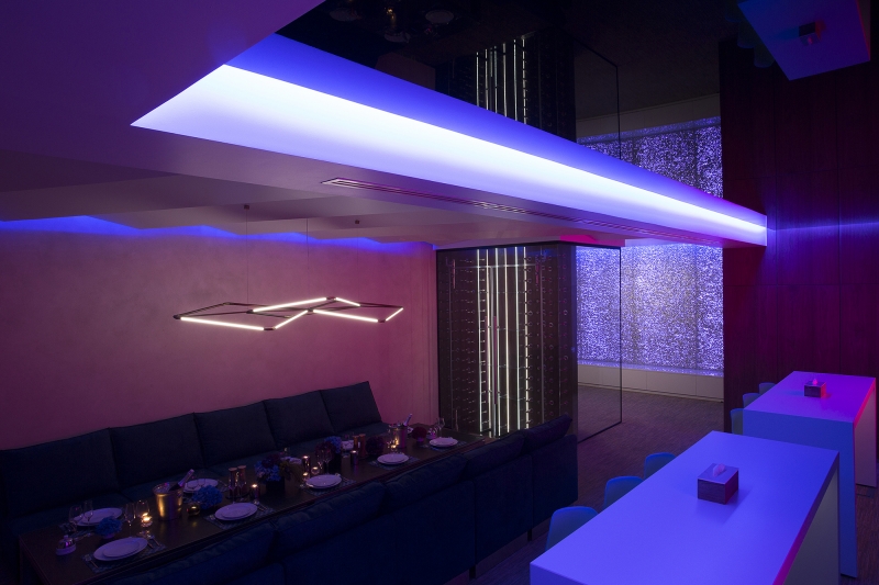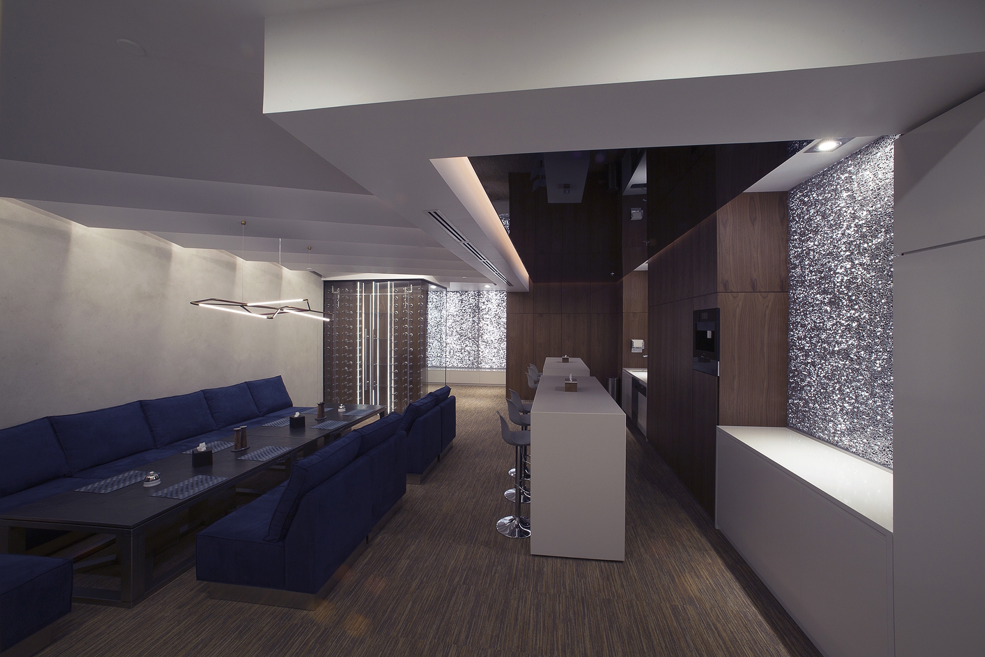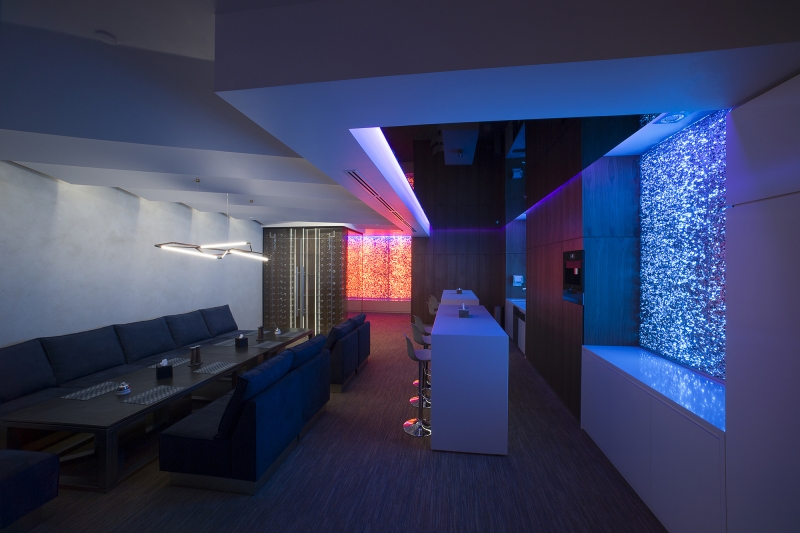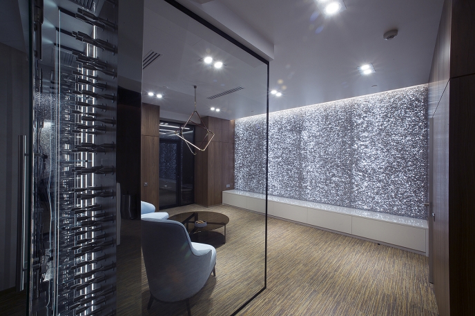 «A» class business center «LEONARDO» in which the On a total office area of 1300m2. Meeting rooms and recreation areas "Lounge" for holding business meetings of top management persons.To achieve effect of natural lighting of recreation area "Lounge", light screens were designed with the use of foamed auminum Alusion (Canada). Alusion mesh structure reflects and transmits light chaotically. Various light effects are achieved. Light installations - adjustable brightness and a wide color palette of RGBW LED lighting - allow creating the necessary atmosphere. Lighting installation has synchronization with music accompaniment. The geometry of space and use in the interior design of dynamic methods open up new views from different angles. The use of reflective surfaces in the interior creates a sense of refraction of space.The complex use of the technical capabilities of the recreation area "Lounge" allows transforming the premises for the necessary functional purpose: a meeting room, a living room, a bar and even a nightclub. When you are in the lounge, the sensation of the flow of time is lost. It seems that you are in another reality - It is The Another World!