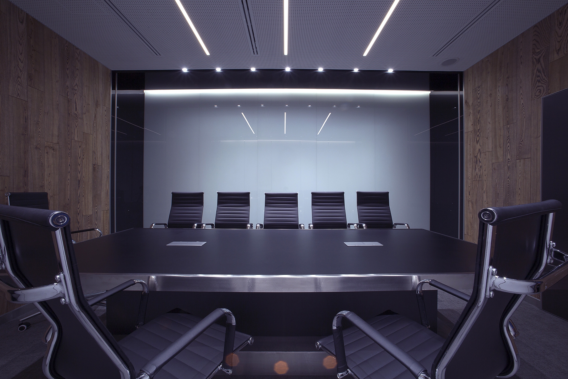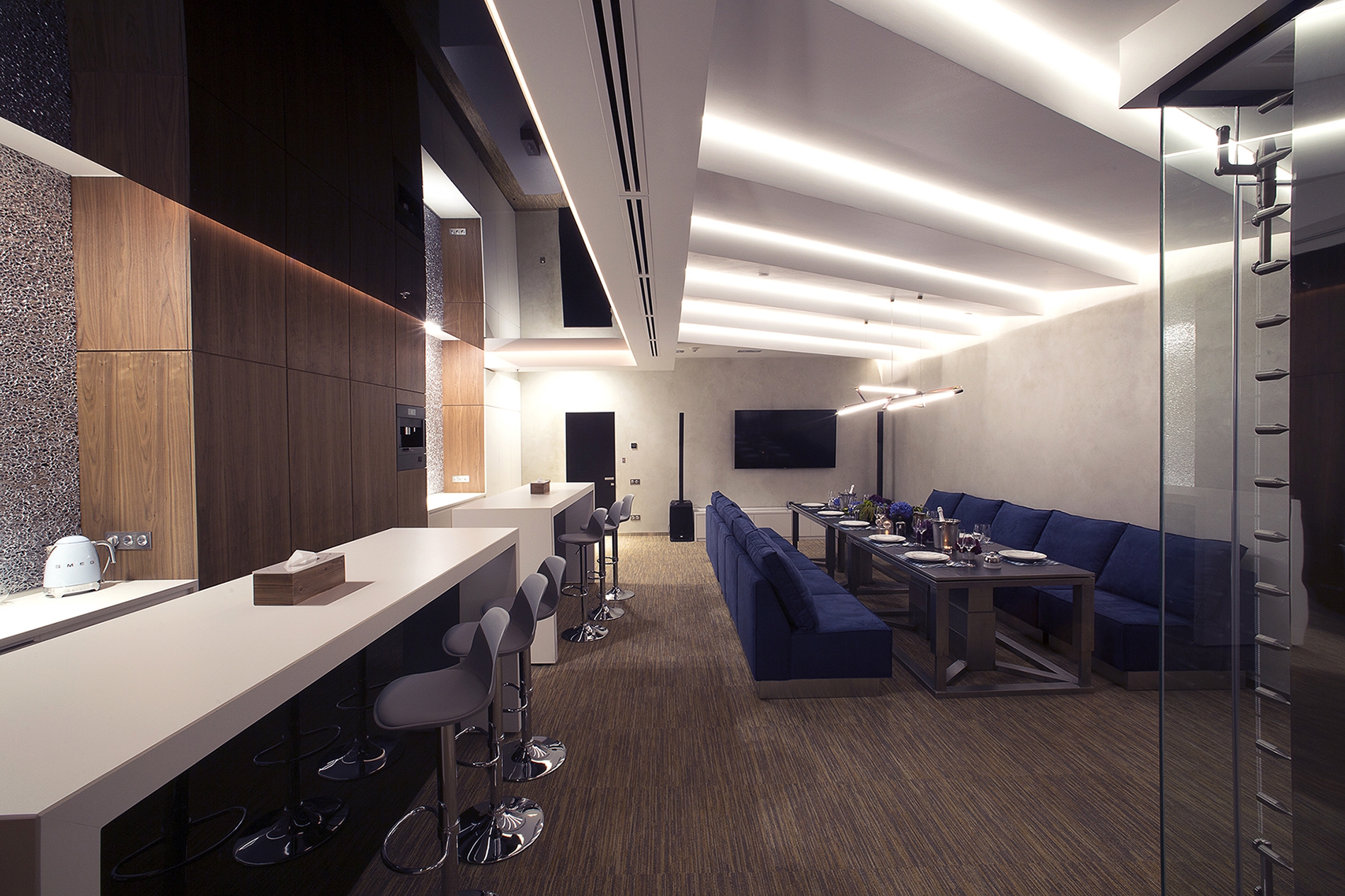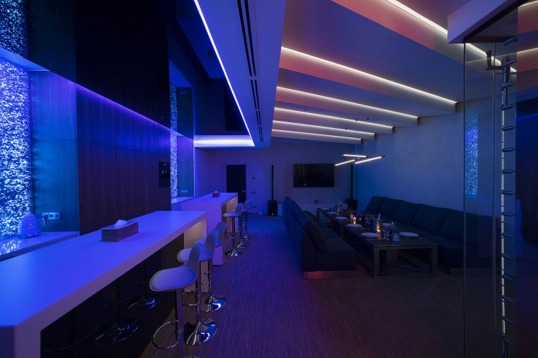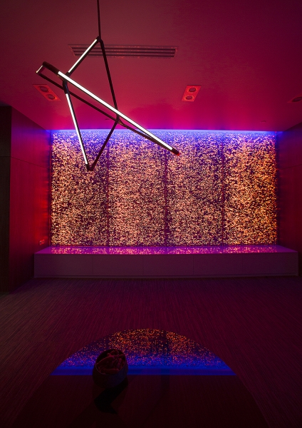 «A» class business center «LEONARDO» in which the On a total office area of 1300m2. Meeting rooms and recreation areas "Lounge" for holding business meetings of top management persons.To achieve effect of natural lighting of recreation area "Lounge", light screens were designed with the use of foamed auminum Alusion (Canada). Alusion mesh structure reflects and transmits light chaotically. Various light effects are achieved. Light installations - adjustable brightness and a wide color palette of RGBW LED lighting - allow creating the necessary atmosphere. Lighting installation has synchronization with music accompaniment. The geometry of space and use in the interior design of dynamic methods open up new views from different angles. The use of reflective surfaces in the interior creates a sense of refraction of space.The complex use of the technical capabilities of the recreation area "Lounge" allows transforming the premises for the necessary functional purpose: a meeting room, a living room, a bar and even a nightclub. When you are in the lounge, the sensation of the flow of time is lost. It seems that you are in another reality - It is The Another World!