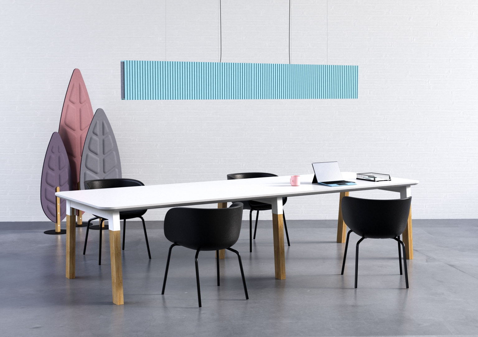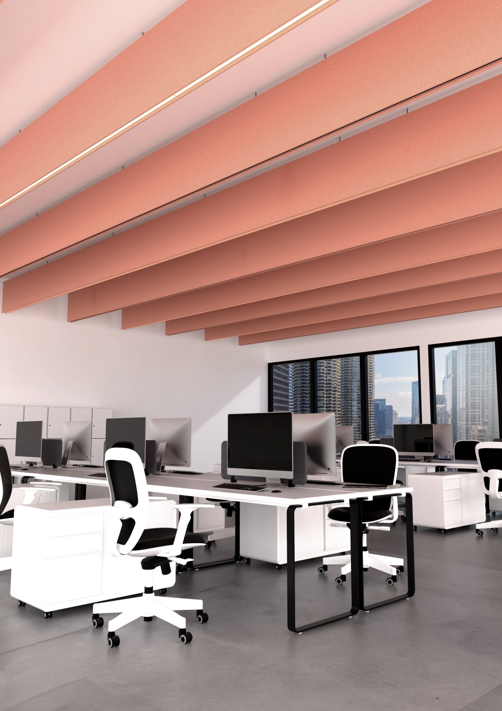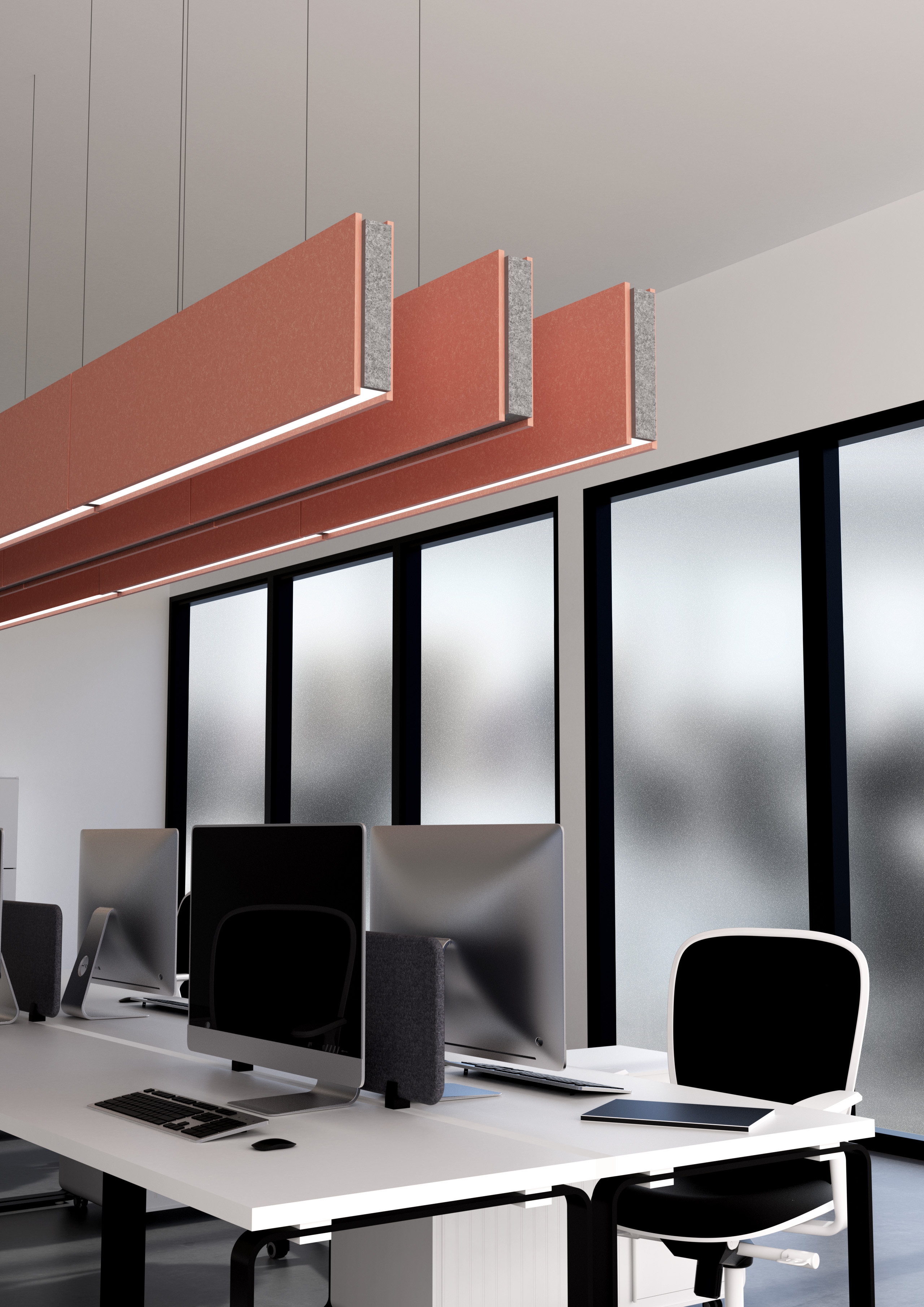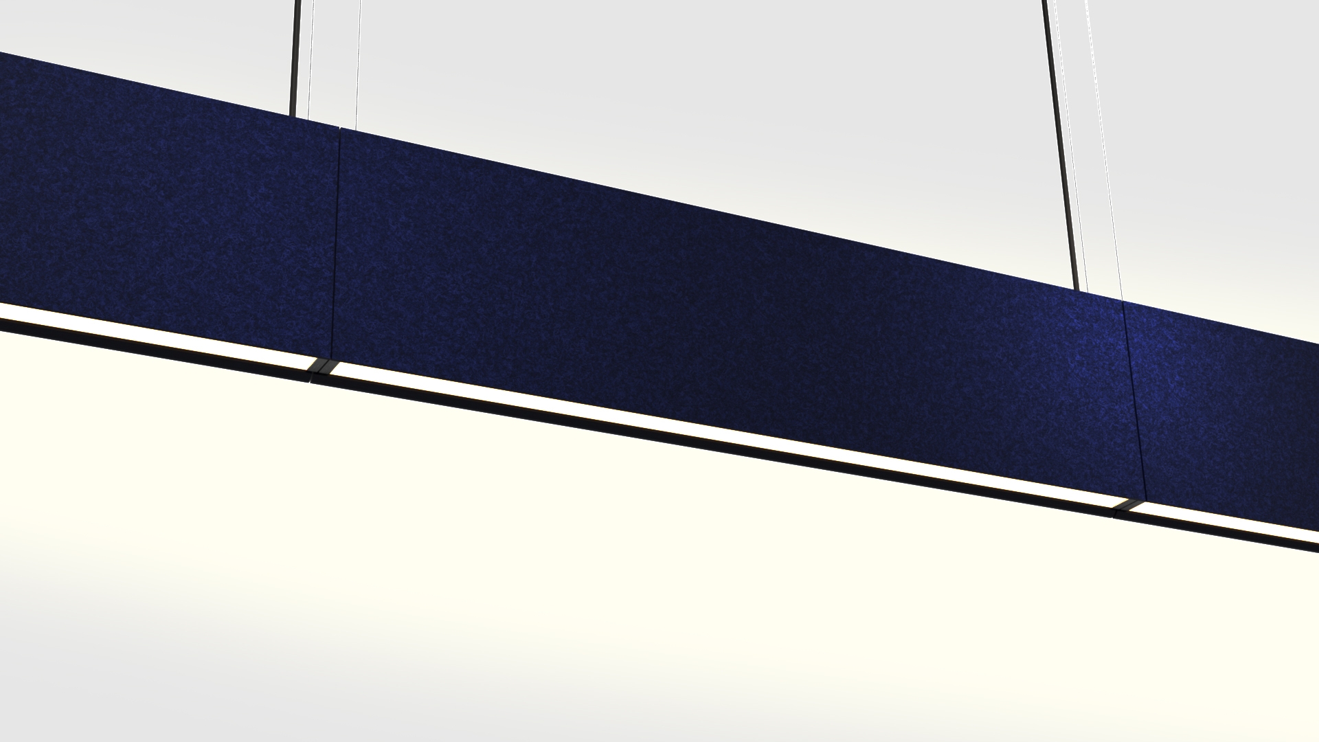 Unique to Linea, internal magnets and complementary ends allow multiple fixture to be easily connected supporting infinite run lengths for highly effective noise reduction and illumination. The specifically designed ribbed finish of Linea effectively triples the fixture’s surface area, bolstering its acoustical performance. Making full use of the void between ceiling and surfaces below, Linea capitalizes on wasted space in open plan design with high-output, functional LED illumination. . Serving this dual-purpose, Linea offers a more cost-effective acoustic solution than traditional methods, outperforming ceiling and wall-mounted acoustic treatments of similar size and material because both sides of the pendant are exposed, doubling functional surface area for noise absorption.