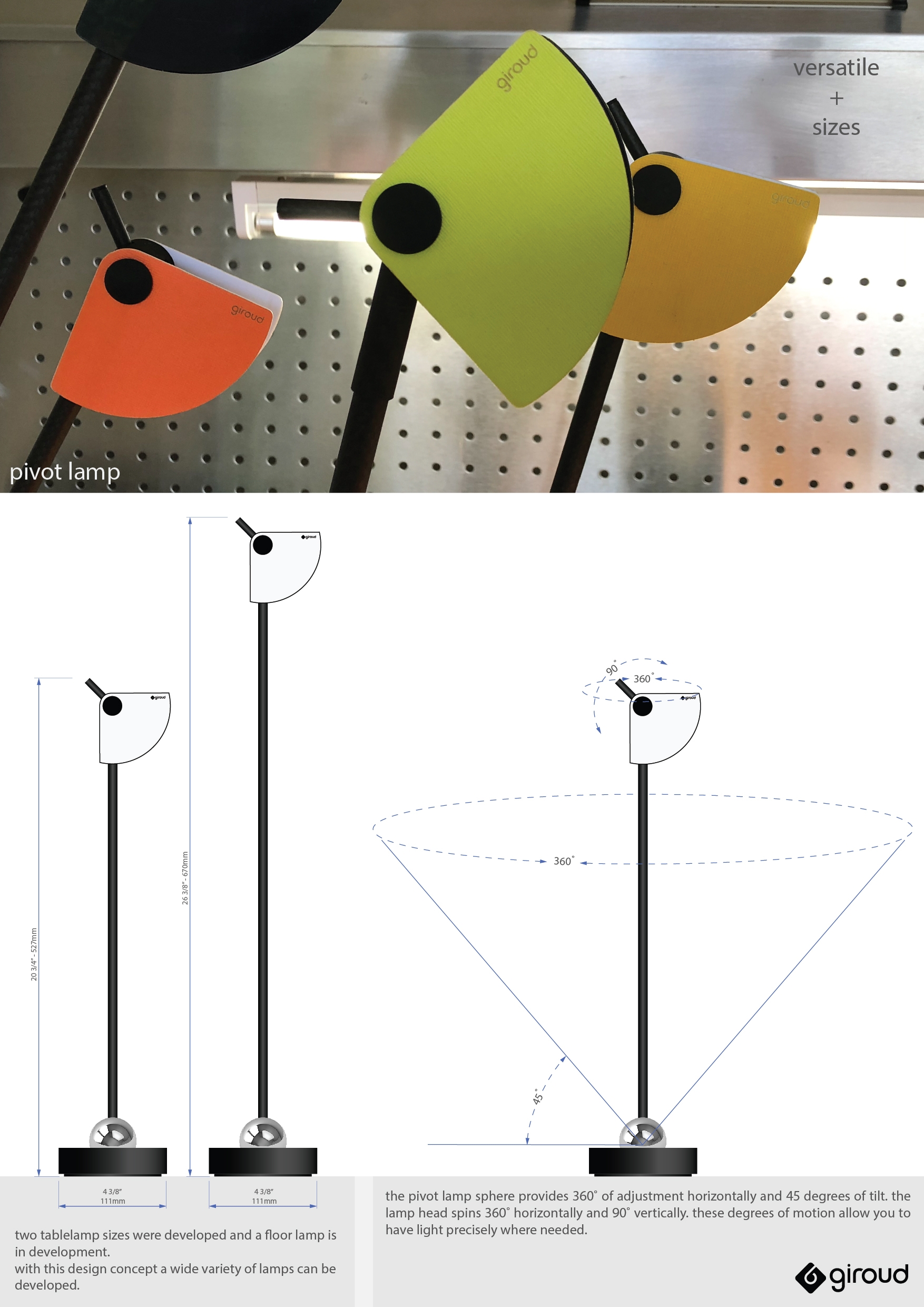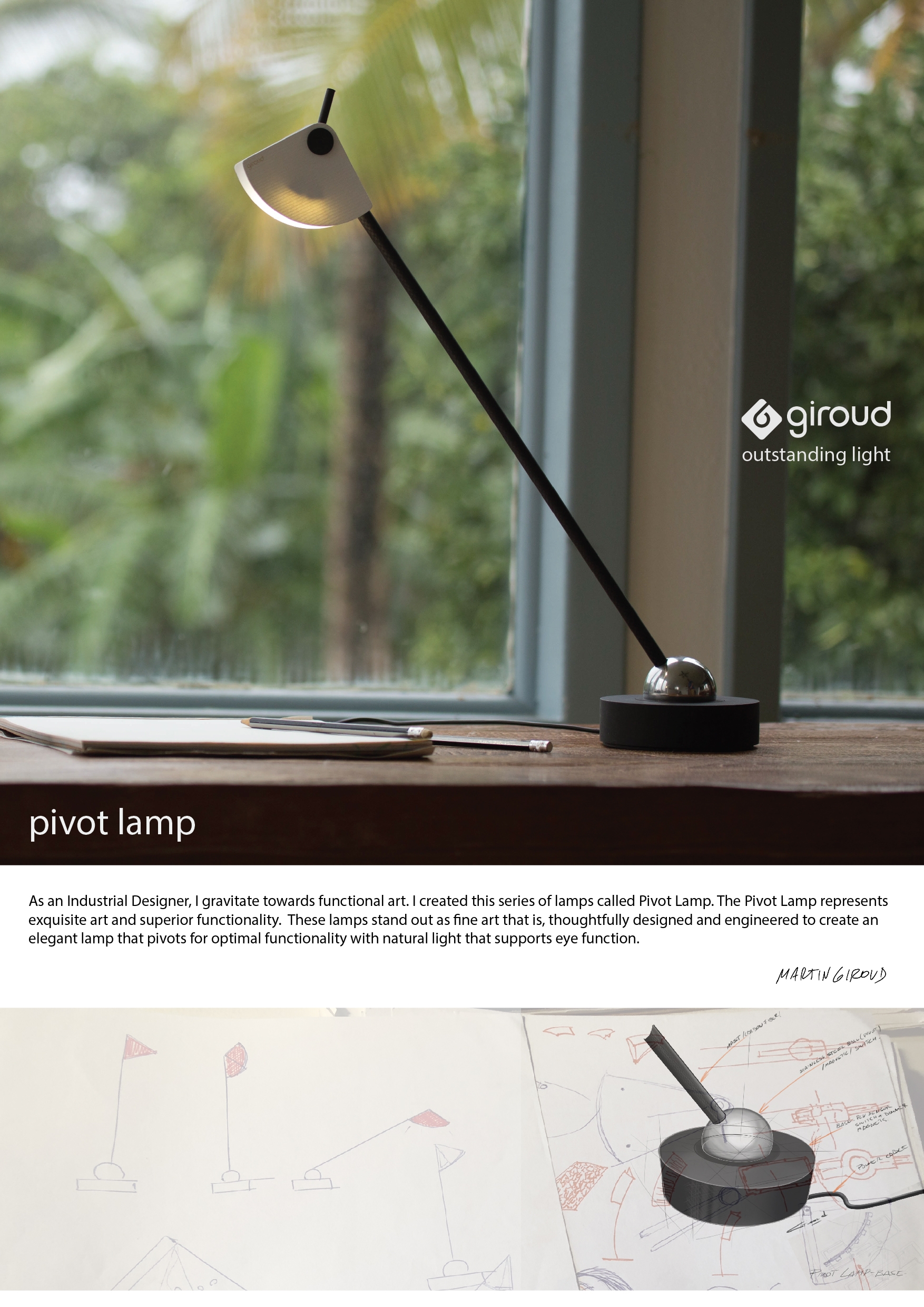 As an Industrial Designer, I gravitate towards functional art. I created this series of lamps called Pivot Lamp. The Pivot Lamp represents exquisite art and functionality. These lamps stand out as fine art that is, thoughtfully designed and engineered to create an elegant lamp that pivots for optimal functionality with natural light that supports eye function.