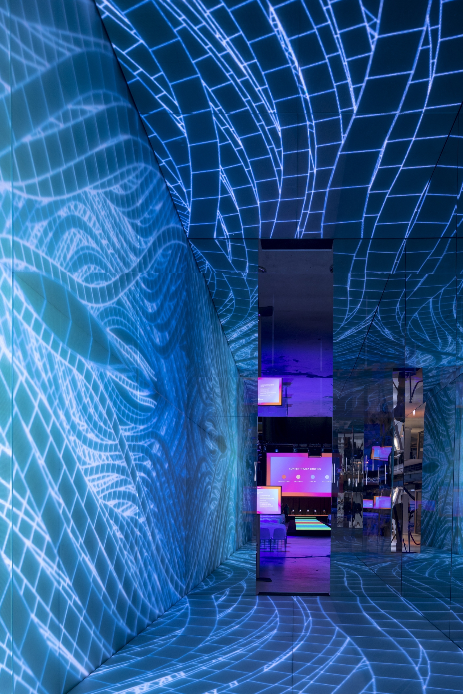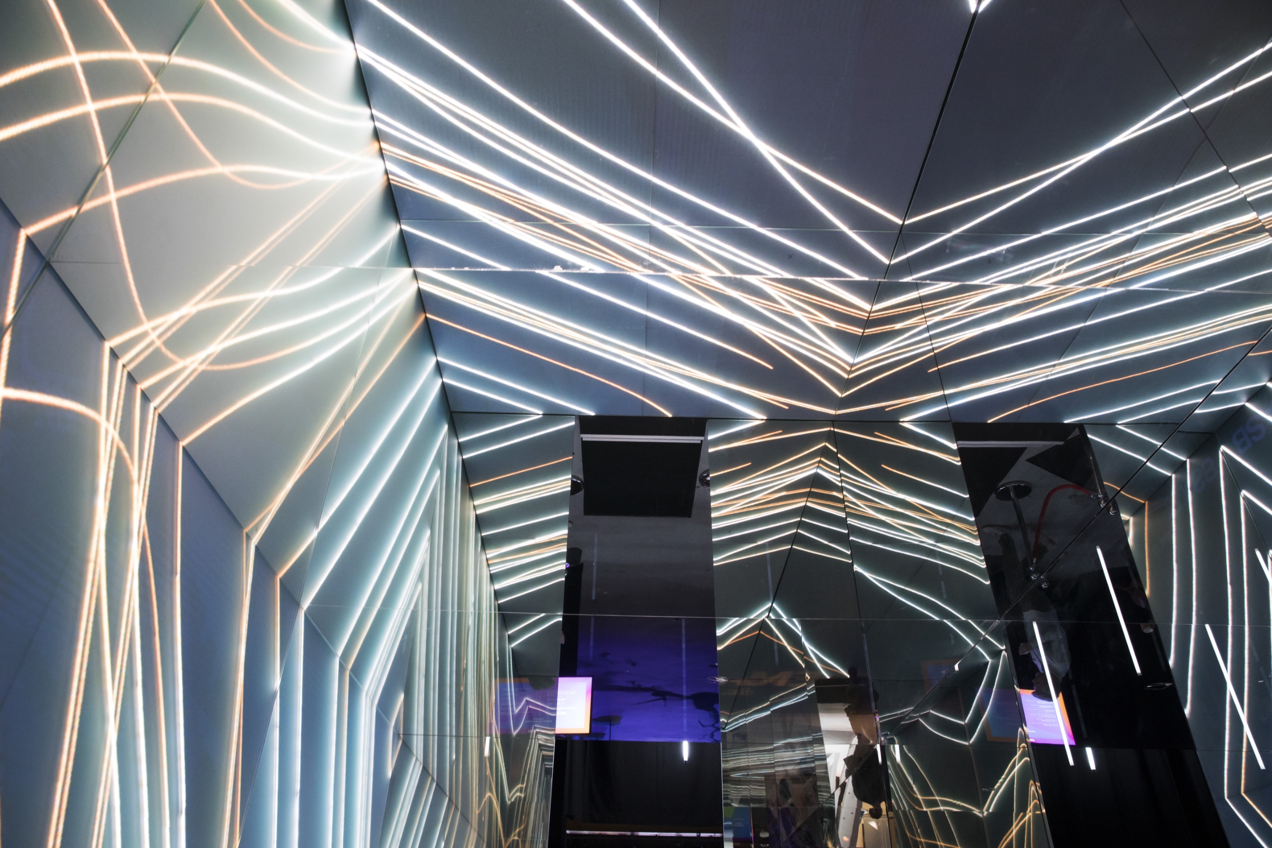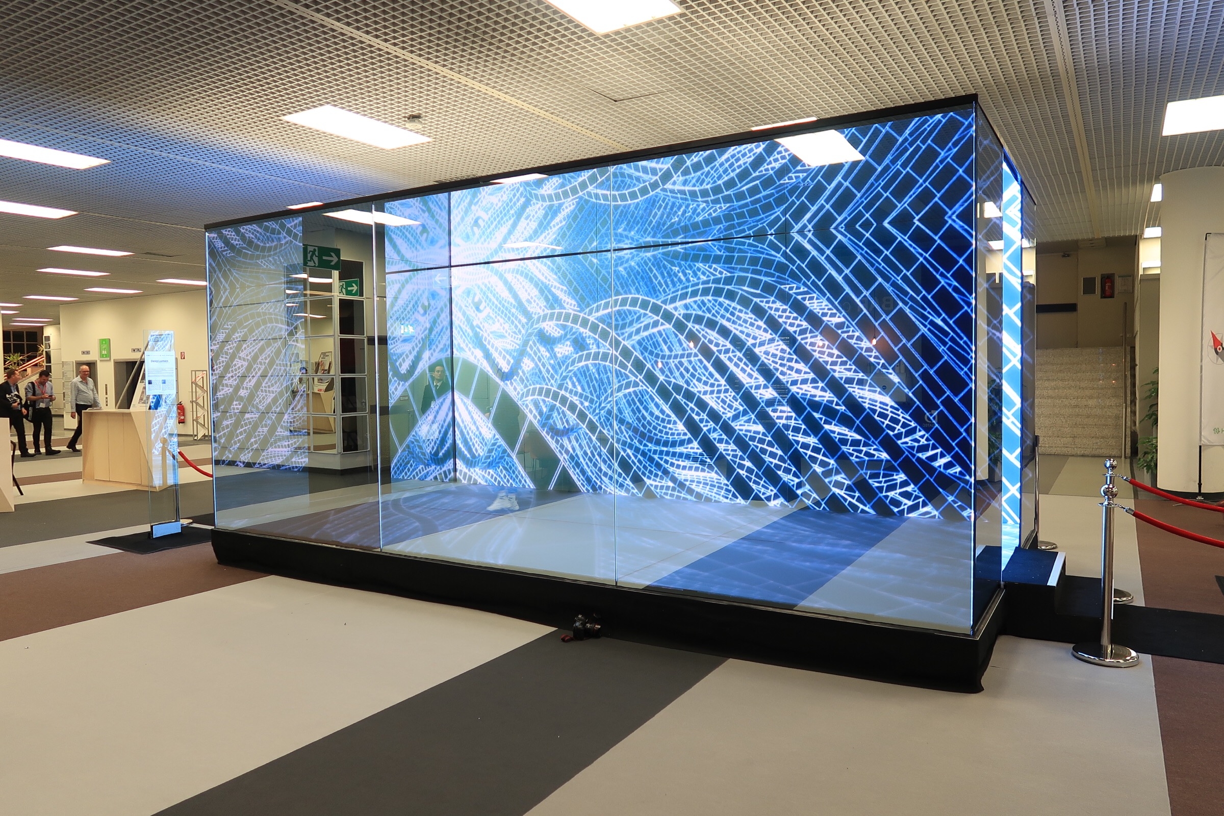 The 3m x 6m self-supporting cube with an internal height of 2.5m is entirely designed from specially engineered glass on all walls and the floor. Whilst three walls and the ceiling are reflective, the floor and one side wall are the translucent screens for over 800,000 LEDs. The LEDs are installed behind opaque glass, providing a natural screen rather than an LED wall installation.