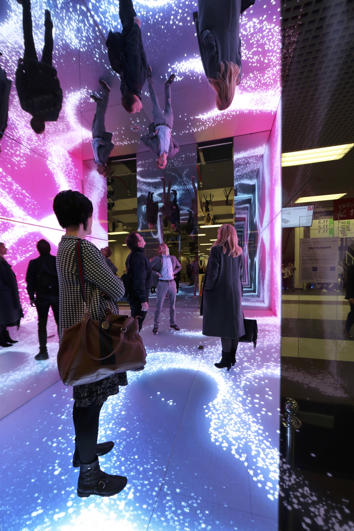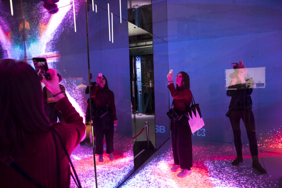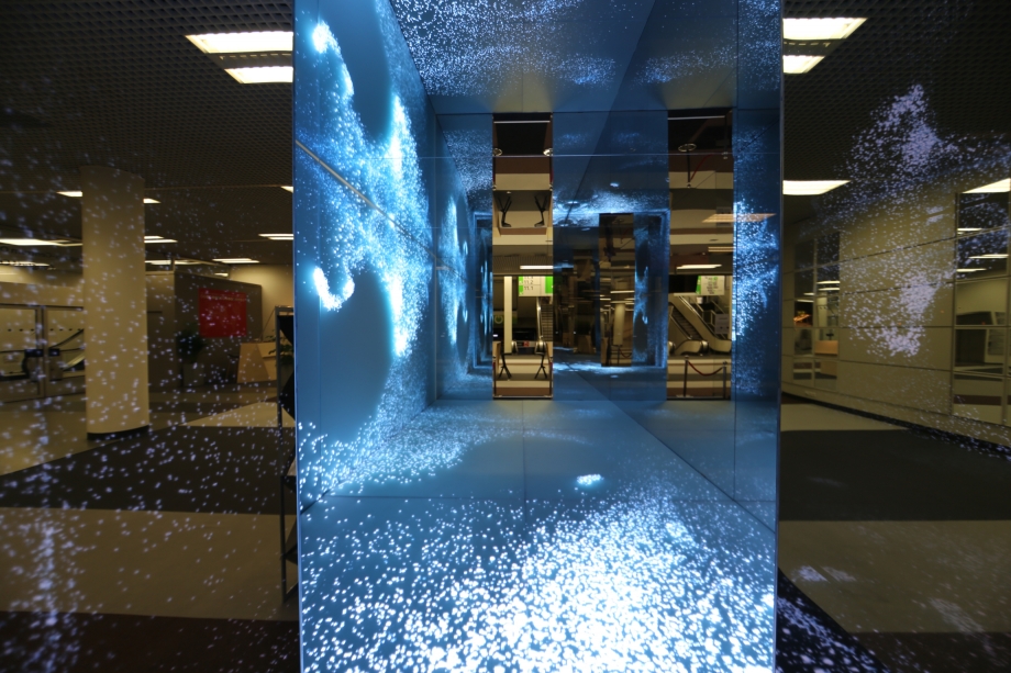 The reflective glass walls allow the artist to harness the reflection of illuminated surfaces in order to create an abstract and fascinating virtual environment. The translucent mirror walls create a miraculous space that is sealed away from its surroundings, so the spectator inside the cube cannot see out, however passers-by can see in. Witnessing the spectator exploring and experiencing inside the cube, due to the properties of the glass used.