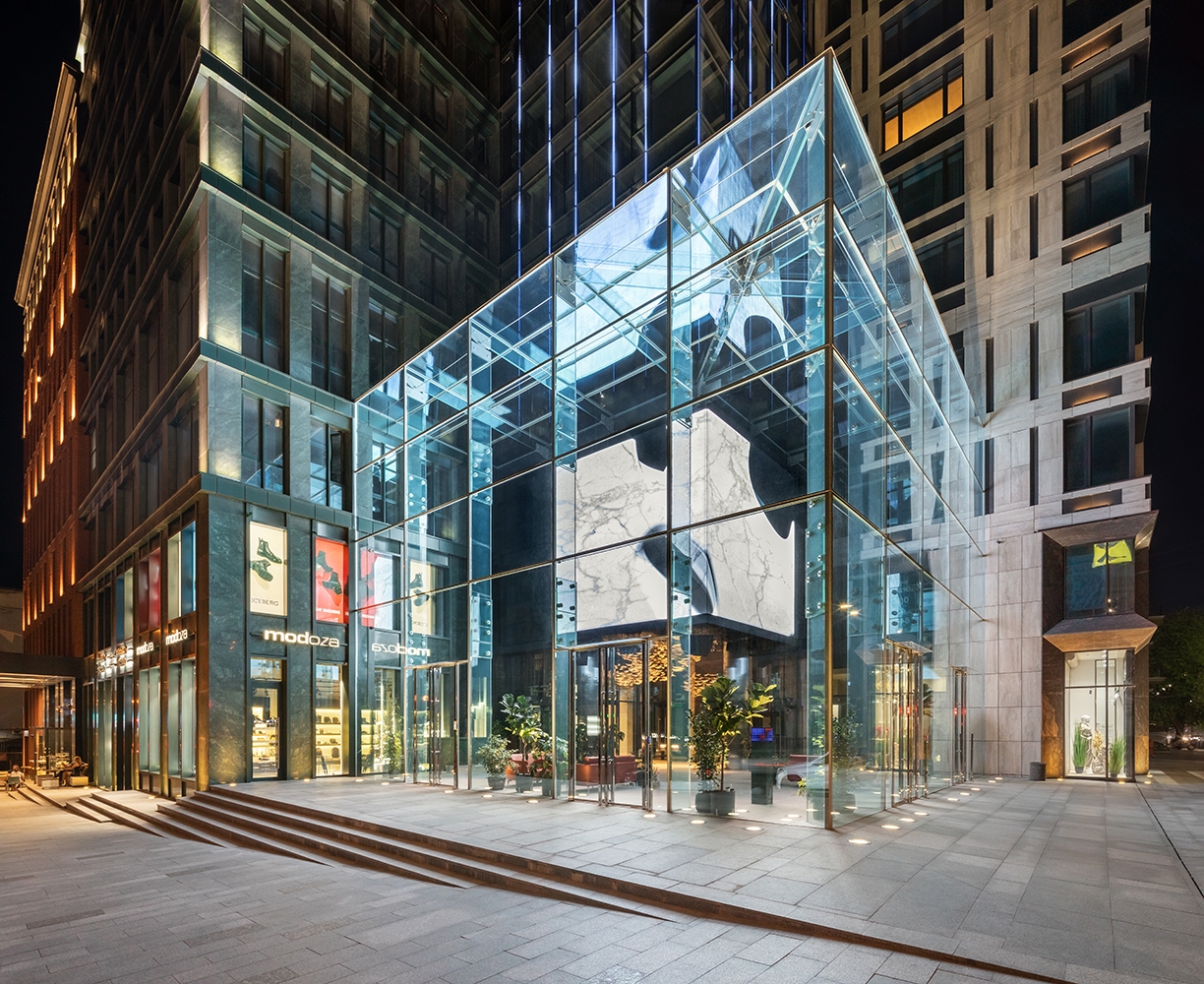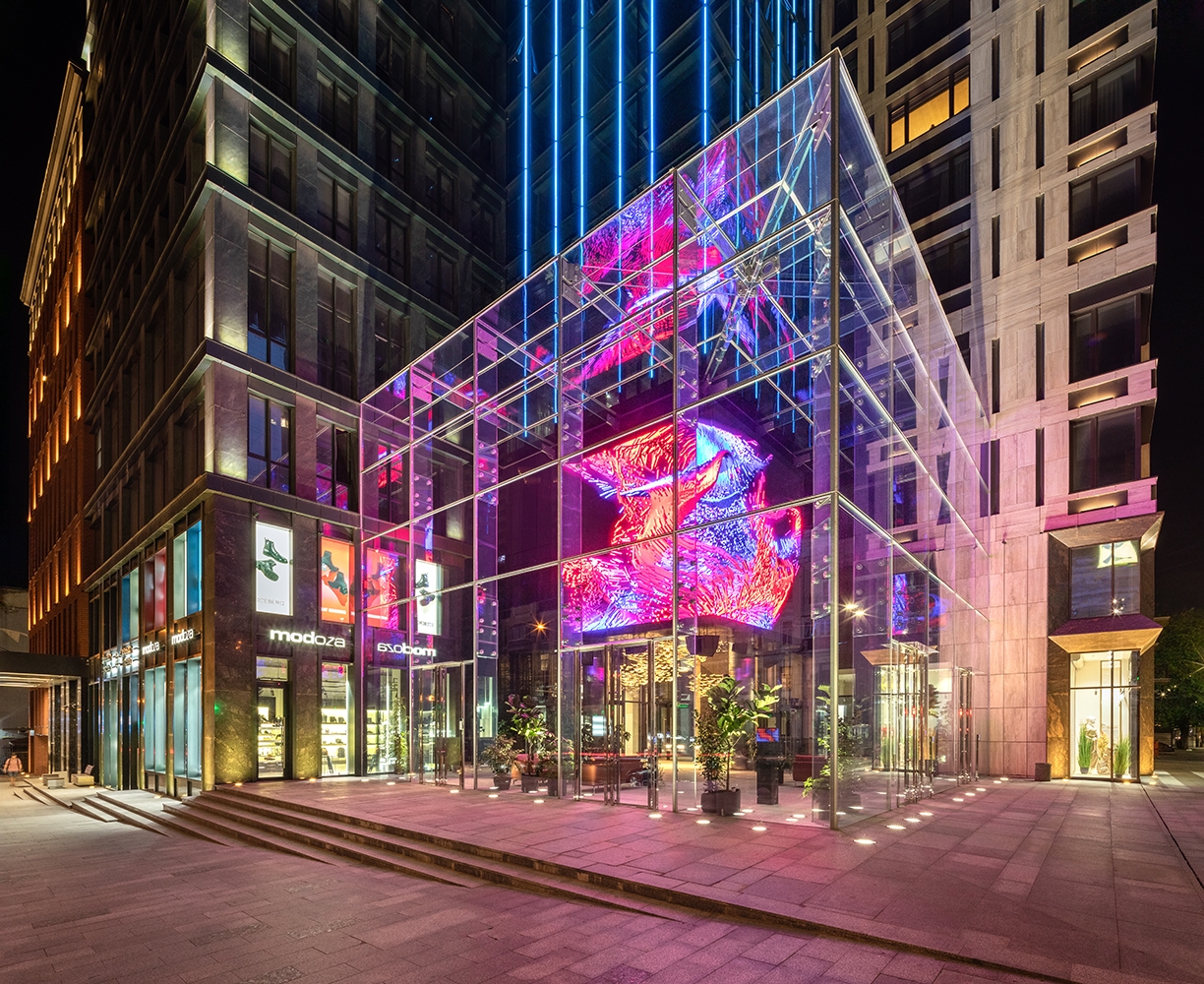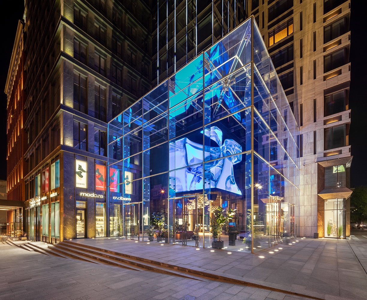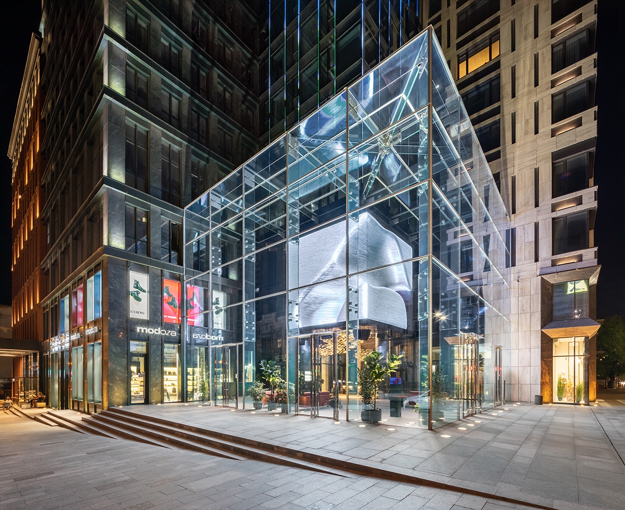 The Cube made of led screens sized 5*5m displays the dynamic shapes in a particular material.