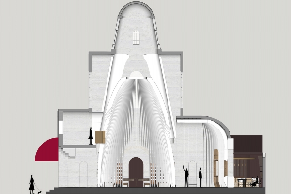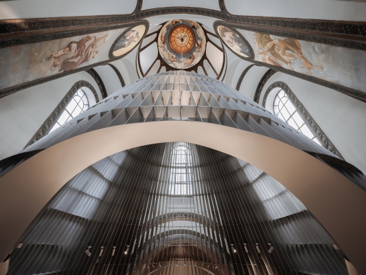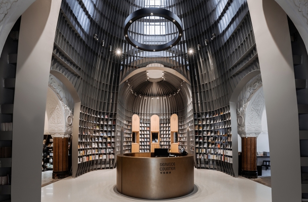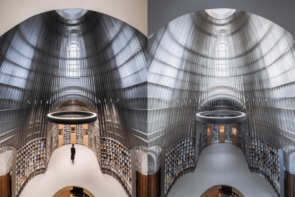 Entry DescriptionBuilt in 1932, St. Nicholas Church is an outstanding historical buildings in Shanghai. Now as the largest professional poetry bookstore in Shanghai, it offers 1000 poetry books in different languages. It should have an independent spirituality and not based on the religion of the old site. As a historical building renovation, no existing façade, structure, floor plan and distinctive decoration could be changed. “Church in church”, the steel bookstore and the old masonry church are interwoven without touched. Since the bookshelf has no back panel, the light from the dome can spill into the bookstore. A 2.5 meter diameter pendent with accent lights downward and linear light upward was used to provide the ambient light in the main lobby. 3000K warm light and the cool daylight have coexisted and contrasted in this holy while modern space. All the accent lights are located halfway on the shelf without disturbing the daylight penetration, while provide enough light for book display with proper aiming angle. Ingrade soft linear uplight was used to make the chocolate colored café a mild and cozy atmosphere, and pendent downlight were used to avoid glare at the mirror ceiling.