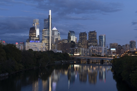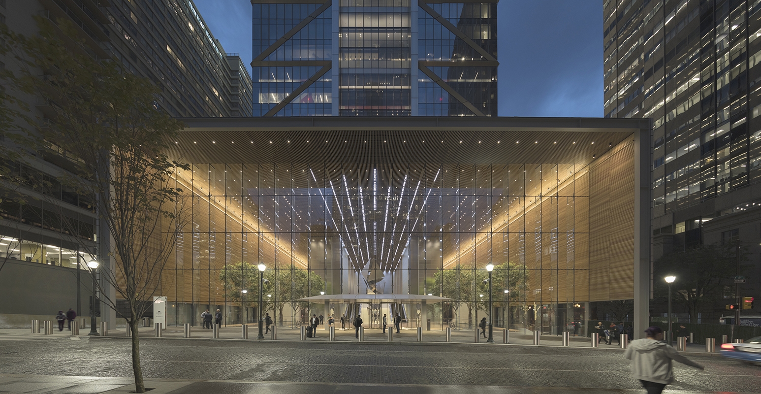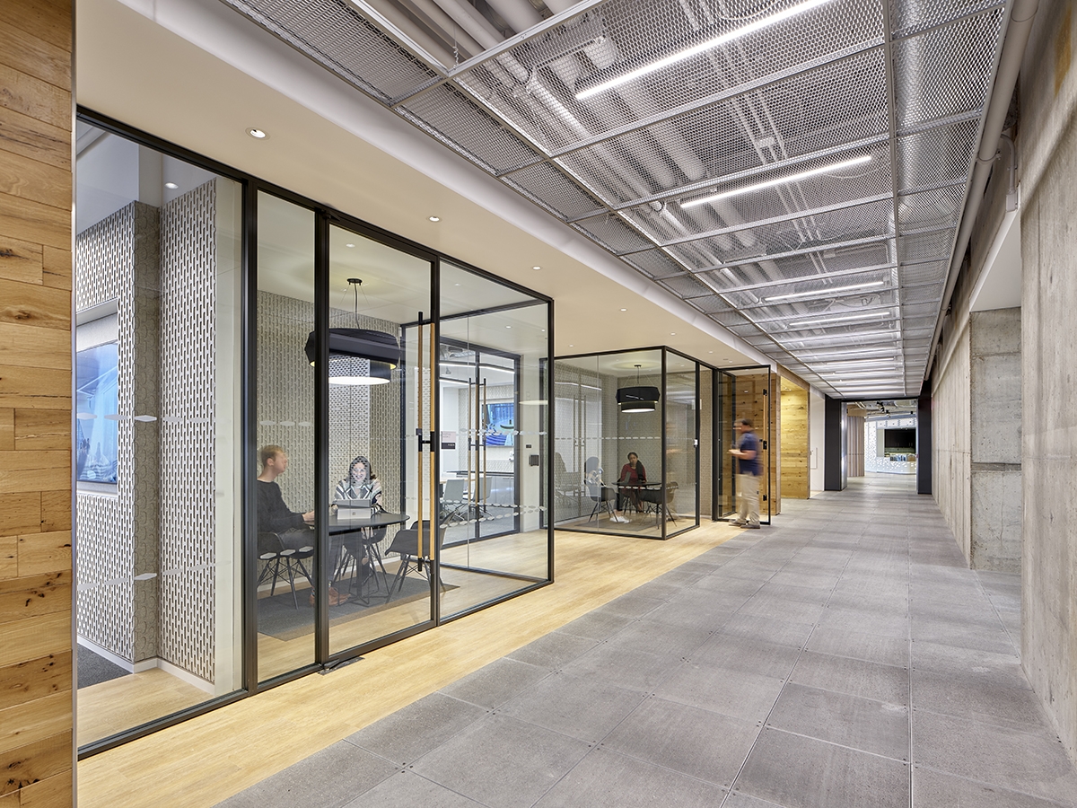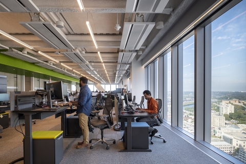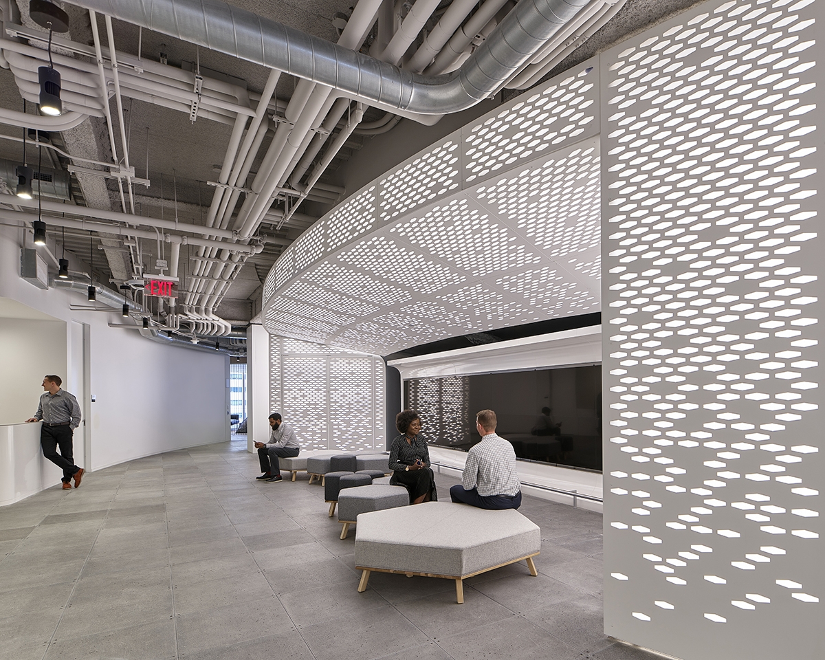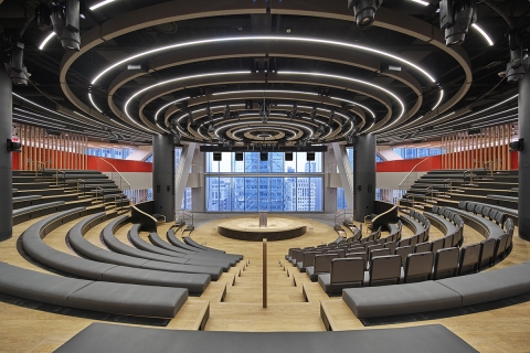 At night, the building glows from within featuring its bustling activity. In the lower half of the tower, open office space deploys linear pendants optimized with direct and indirect optics that efficiently and evenly illuminate the office, helping the project achieve LEED Platinum. Main Street corridors have individual identities and connect occupants to public spaces. Town Hall features a backlit wall that curves around the amphitheater equipped with a lighting system capable of hosting numerous types of gatherings.