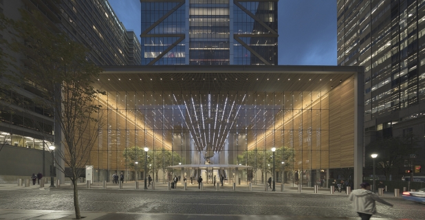 From the outside the most distinguishing element is the Blade. To achieve the consistently luminous effect, linear grazers are embedded in the mullions and positioned to wash the dot-fritted glass. An indirect cove at each floor softly uplights its soffit to create a homogenous interior glow and signature presence in the skyline.