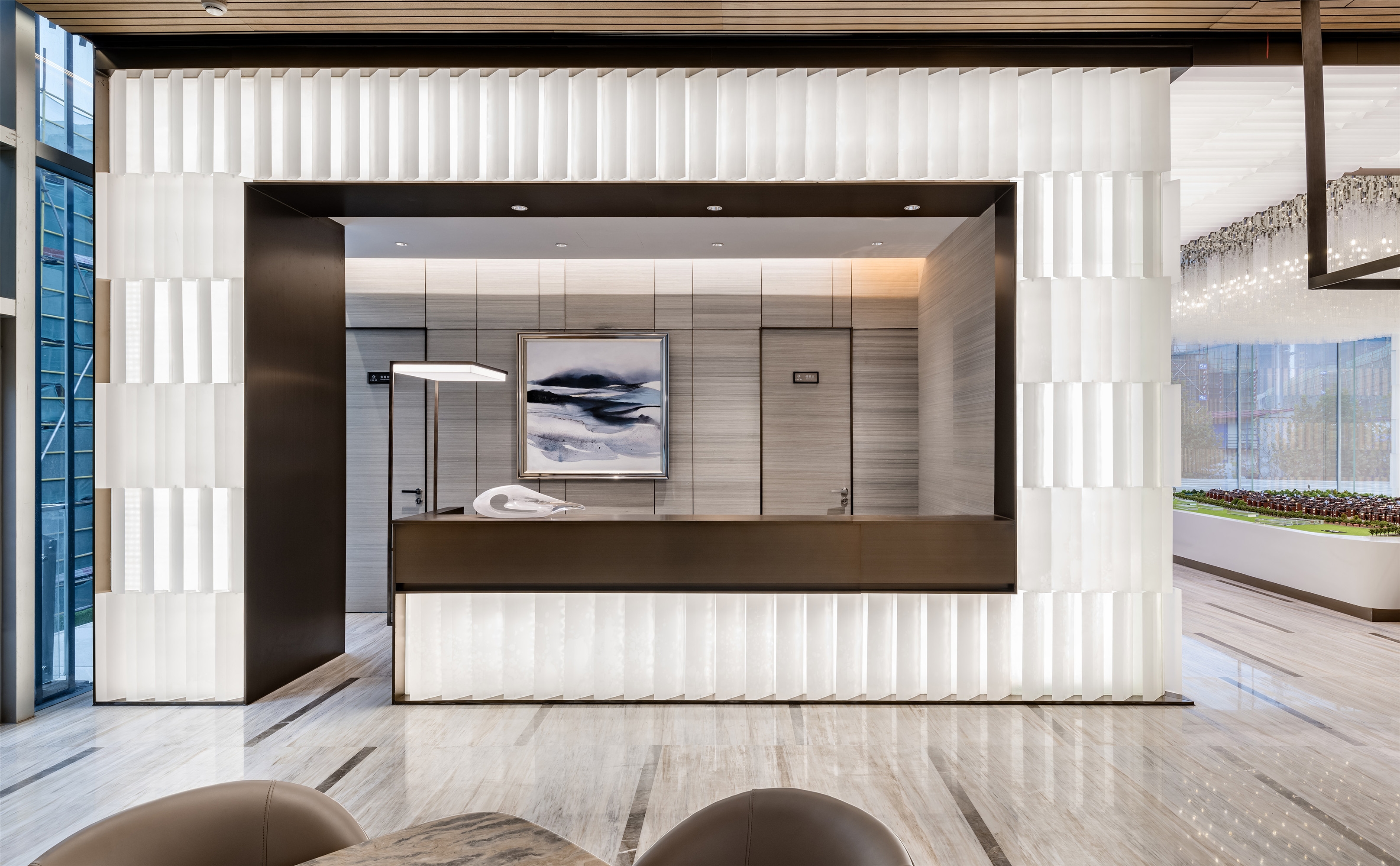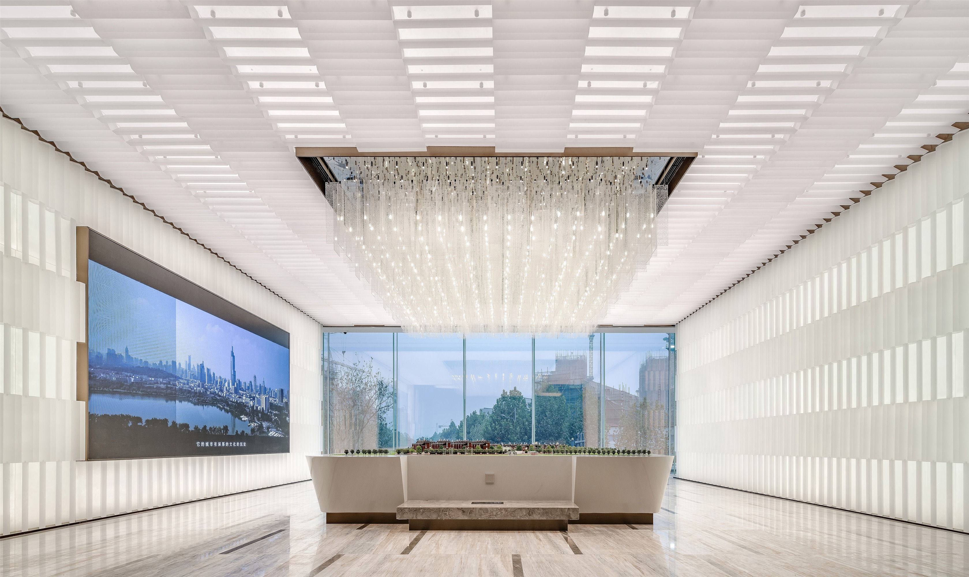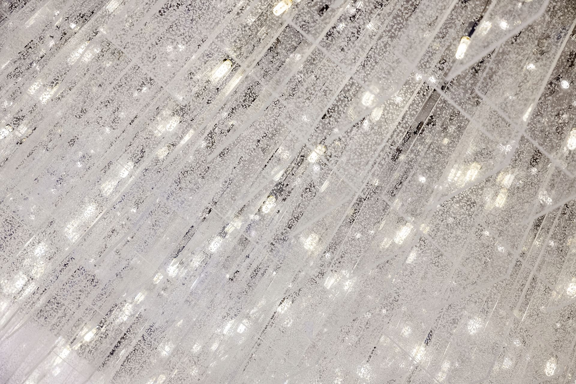 Large area of acrylics is adopted to form many small and luminous acrylic cubes which creates a luminous wall with architecture structure quality through artistic combination. The tidy and well-proportioned combination presents a slim and graceful effect. Simple lines, well-proportioned combination, fluent and magnificent sense of space, all these fully shows the nobility of modern life.