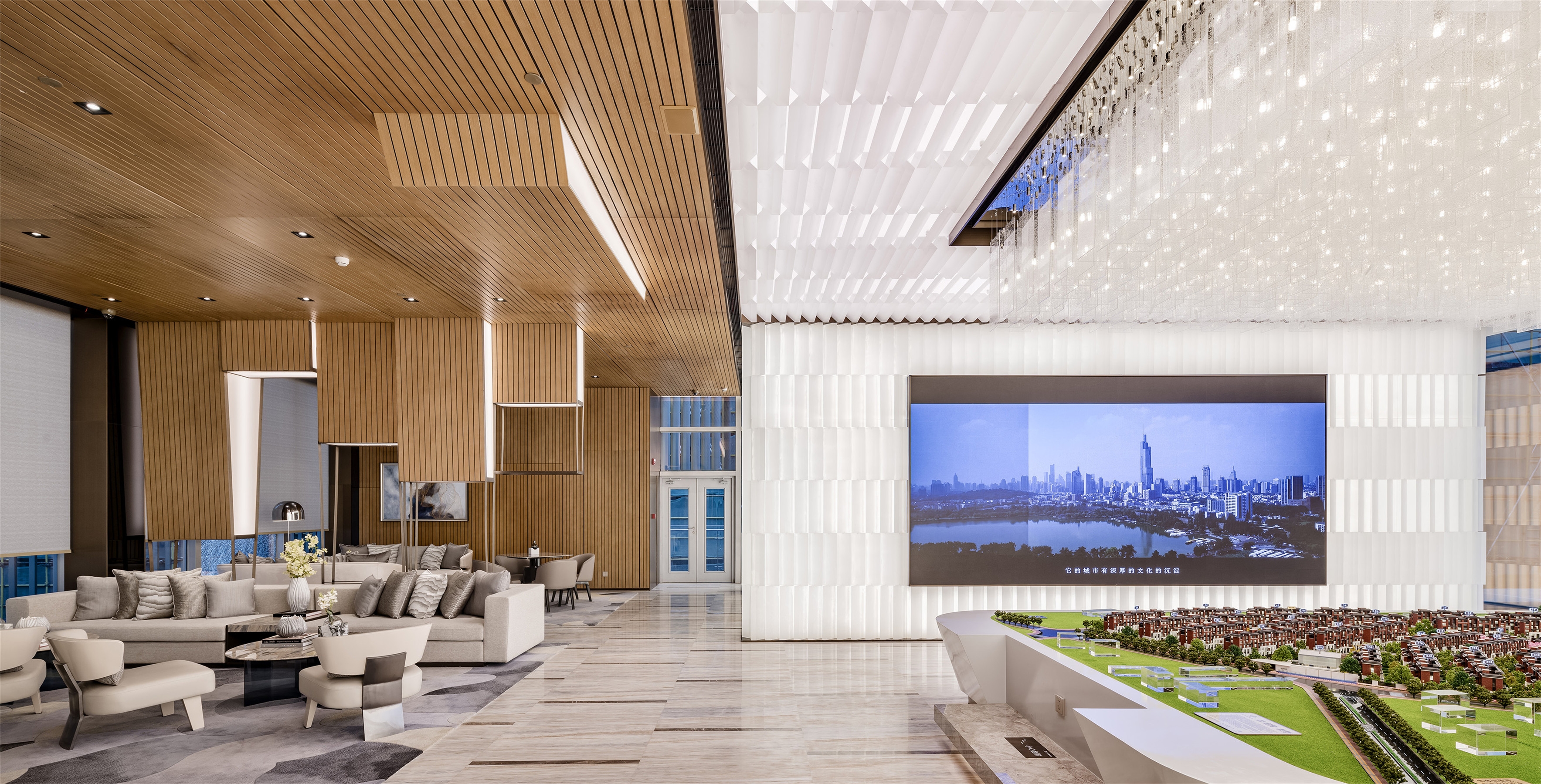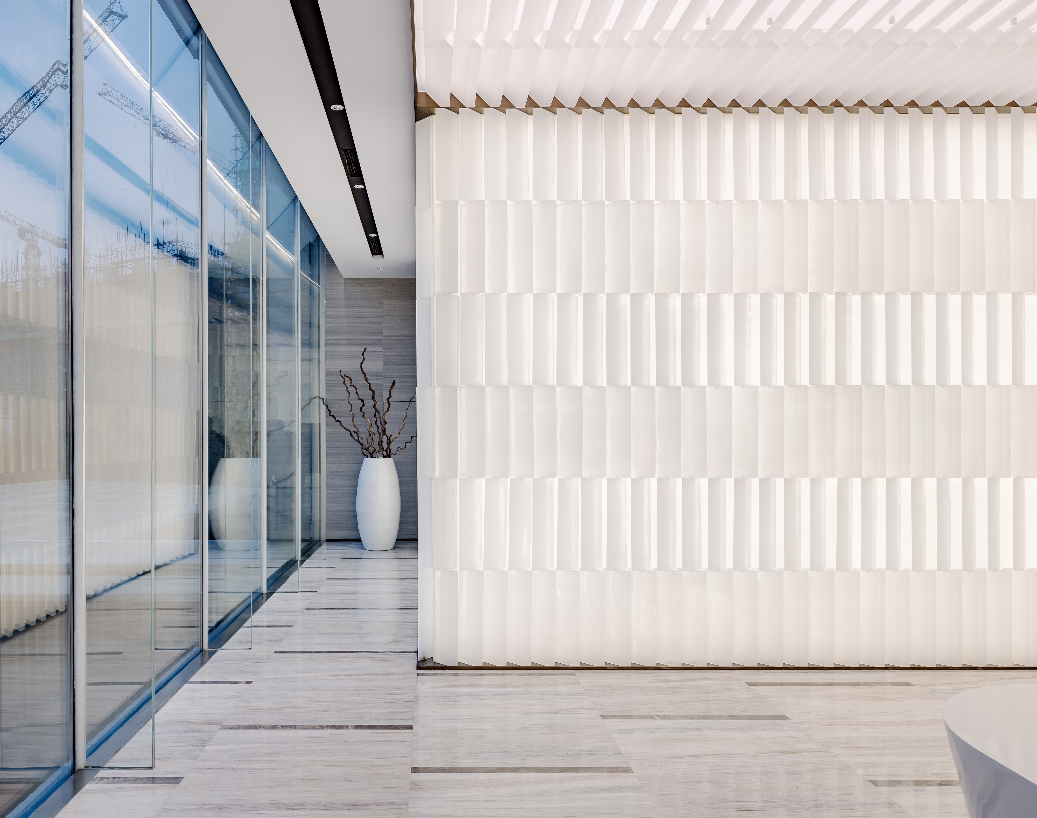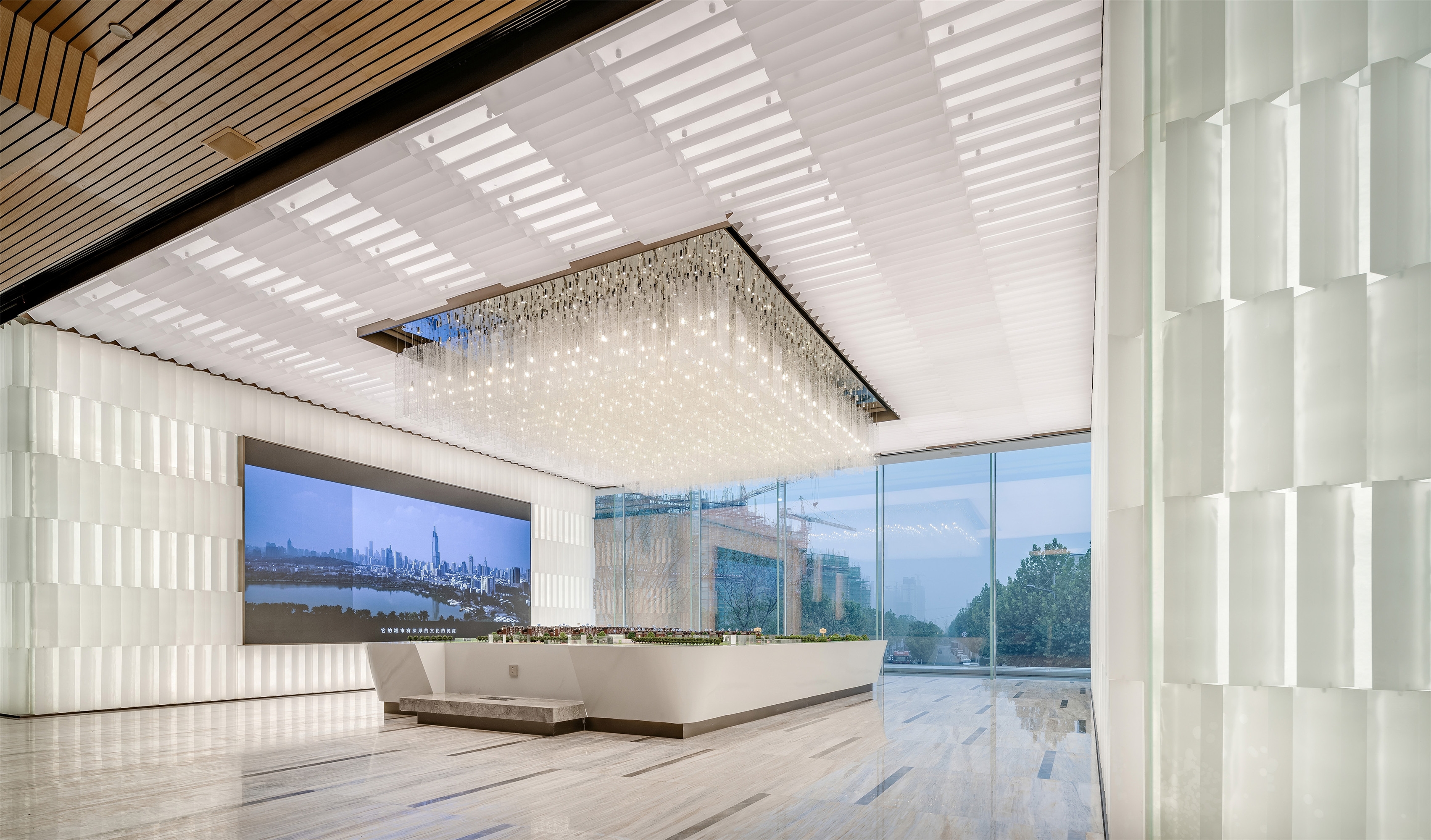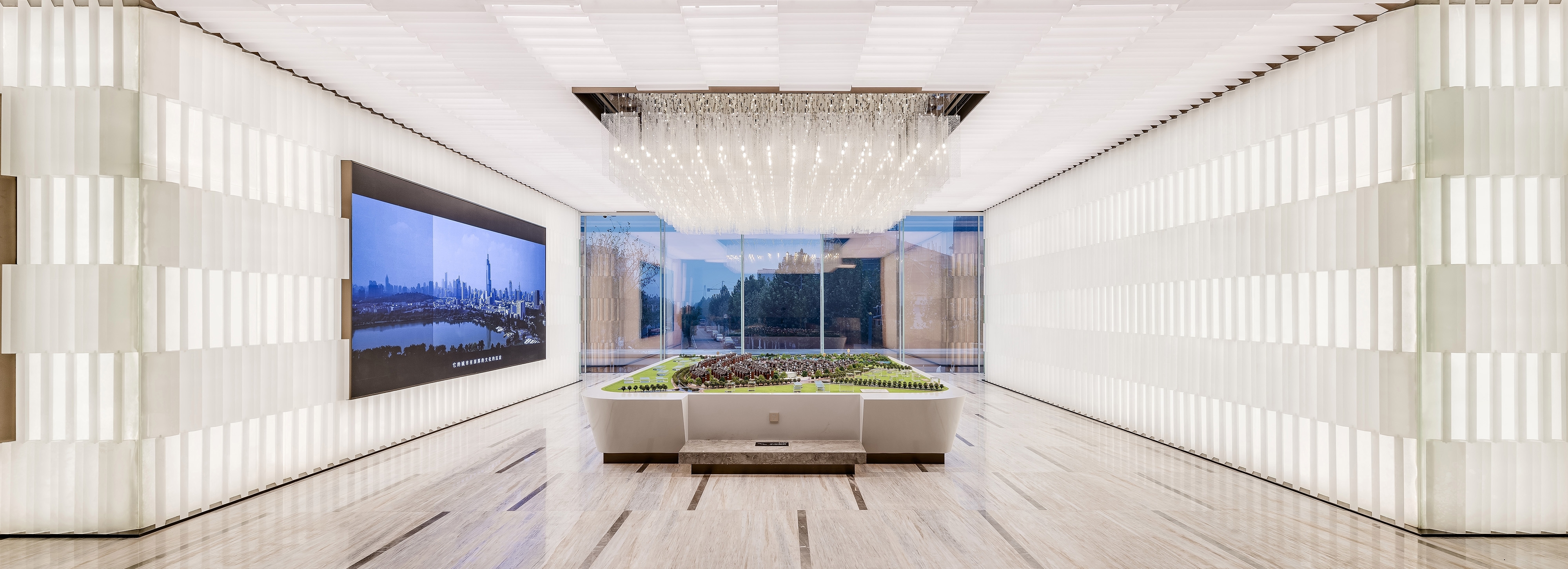 Large area of acrylics is adopted to form many small and luminous acrylic cubes which creates a luminous wall with architecture structure quality through artistic combination. The tidy and well-proportioned combination presents a slim and graceful effect. Simple lines, well-proportioned combination, fluent and magnificent sense of space, all these fully shows the nobility of modern life.