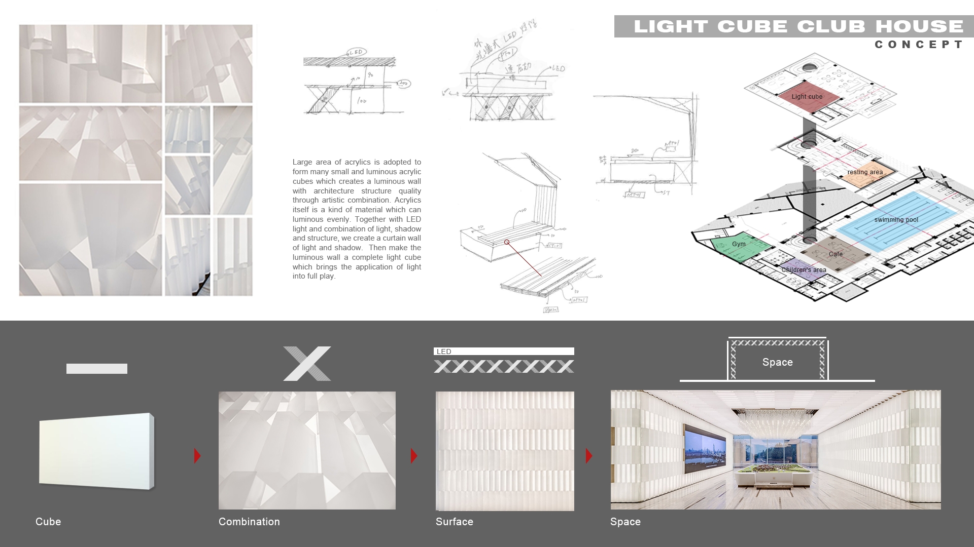 Entry DescriptionIn this case, the designer uses small acrylic cubes to form a quality wall through different ways of combination and highlights the grains and quality of wall through designing a curtain wall of light and shadow. This not only shows the overall light cube but also present the light and structure through an artistic way.