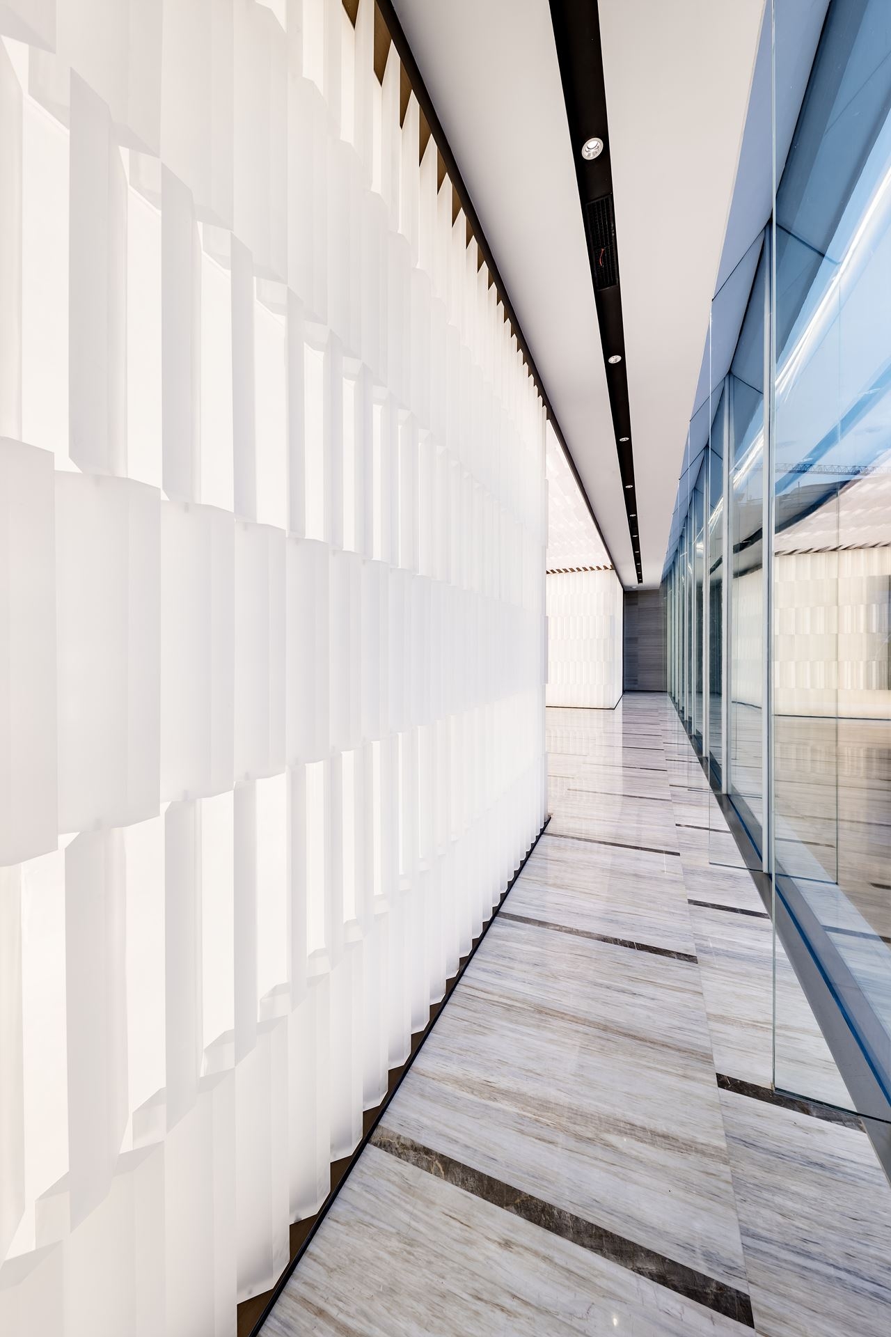 Acrylics itself is a kind of material which can luminous evenly. Together with LED light and combination of light, shadow and structure, we create a curtain wall of light and shadow. Then make the luminous wall a complete light cube which brings the application of light into full play. The floating luminous box forms a visual focus seen from afar which is both clear and natural.