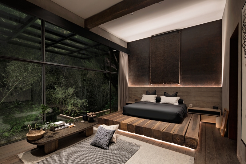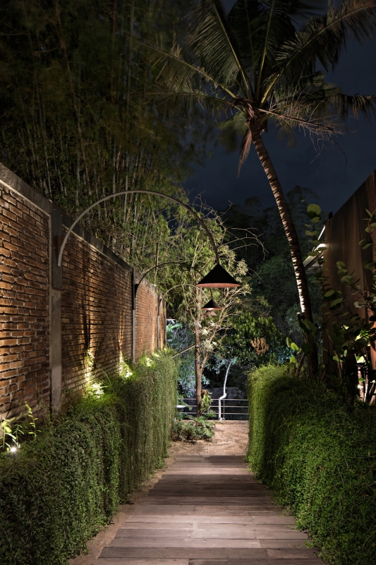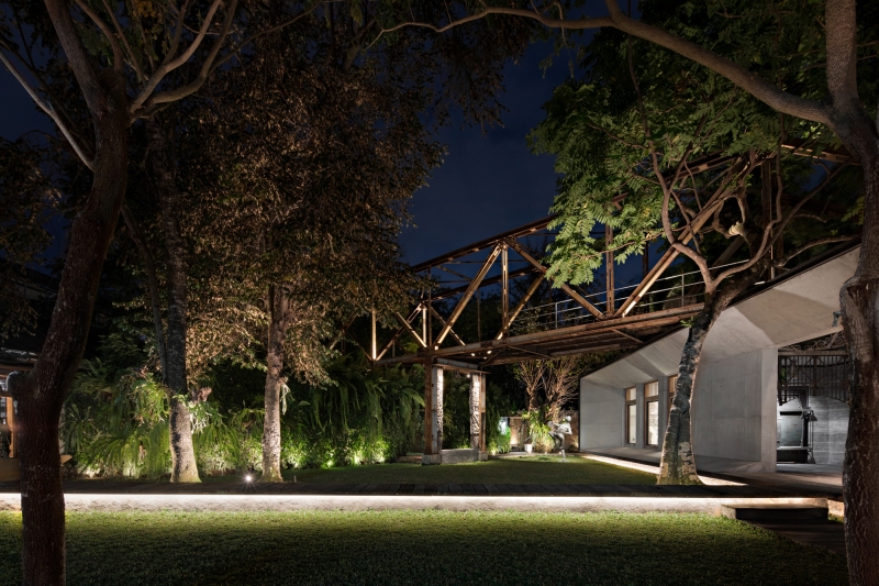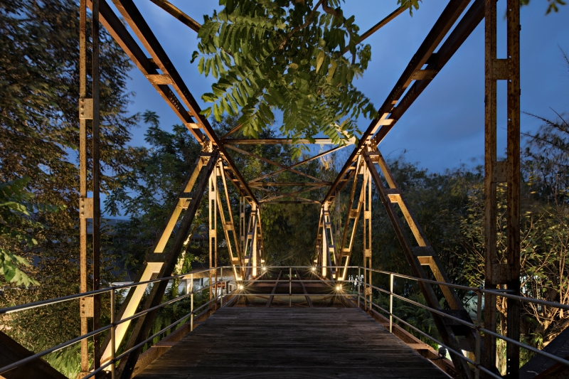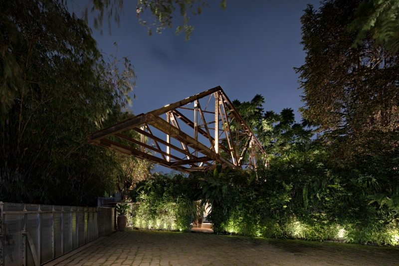 The Bridge House is located in Jogjakarta, Indonesia. Owner and architect of this house was inspired to create a residence that flows with space. This concept is also what lighting designer brings in designing lighting in this house. Entering the house area, The old 1947 steel bridge is highlighted by illuminating the structure so that it reveals its figure. Foyer welcomes the guests with a play of light on the mirror and artwork that displays its own dimensions of space. The exterior of the main building was deliberately left dark so that the skull artwork at the end of the wooden bridge that connects the main house and foyer area became the main focus. The rays on the trees and the surrounding support the atmosphere.The play of light and shadow is the main thing that lighting designer pay attention to. In the interior, track lights are used in the living room to accommodate the owner's love of art, thereby creating flexibility in the use of the room. Bedroom, bathroom and outdoor shower lighting is designed both to meet functional needs and also to create a warm atmosphere for its users. Dimmer system is used in the interior area to create different ambiance based on occasion.